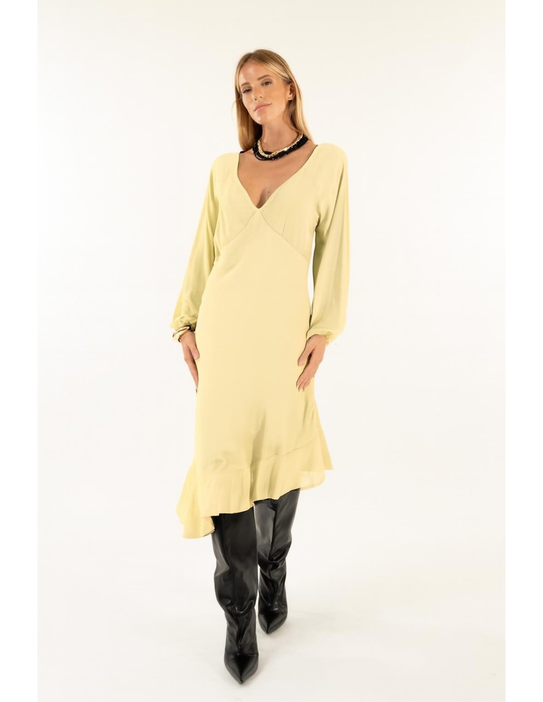 Kontatto assina um midi fluido com um corte largo que realça a cintura. Crepe leve e macio, agradável para a pele. Um decote em V adelgaçante, mangas com punhos elásticos e bainha assimétrica com folho para um movimento natural. Perfeito para o dia no escritório e para bebidas à noite com botas ou pumps.