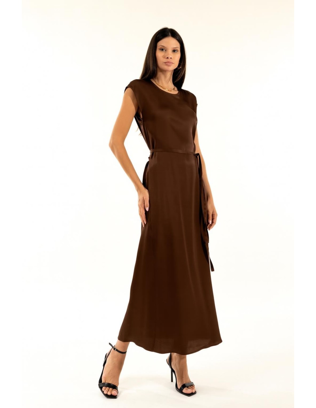 Kontatto assina um longo fluido de linhas rectas, cintura ajustável com um cinto fino para realçar a silhueta. Tecido acetinado leve, agradável à pele. Ombros suaves e decote redondo limpo; fenda lateral para liberdade de movimentos. Perfeito do escritório para um aperitivo, com sandálias ou um blazer.