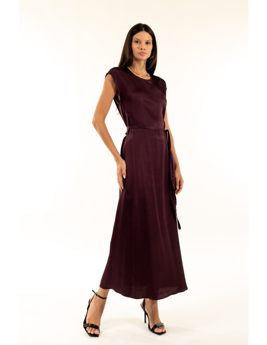 Kontatto assina um longo fluido de linhas rectas, cintura ajustável com um cinto fino para realçar a silhueta. Tecido acetinado leve, agradável à pele. Ombros suaves e decote redondo limpo; fenda lateral para liberdade de movimentos. Perfeito do escritório para um aperitivo, com sandálias ou um blazer.