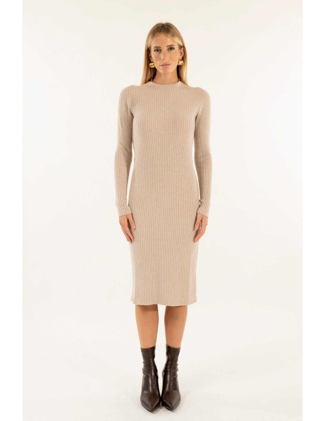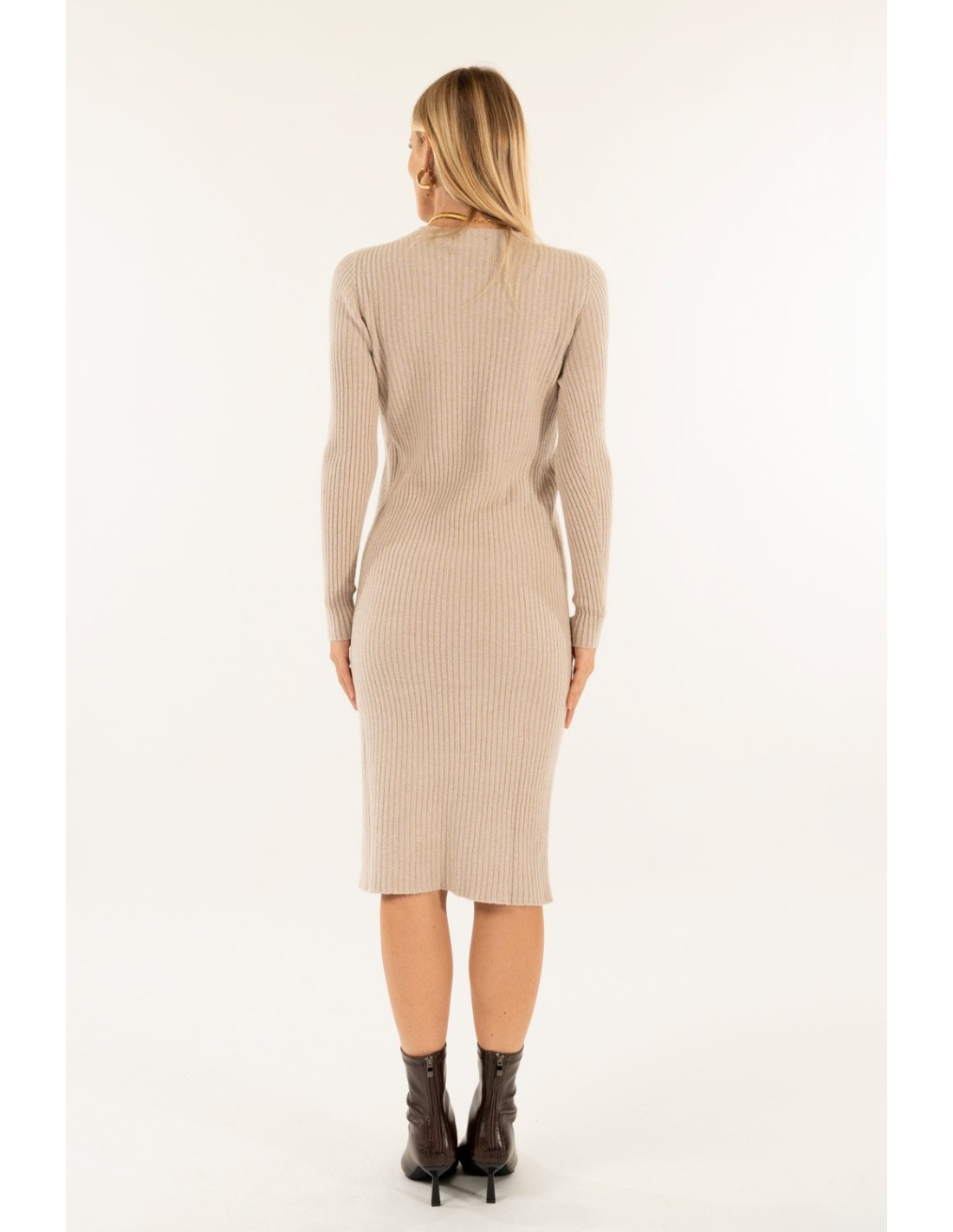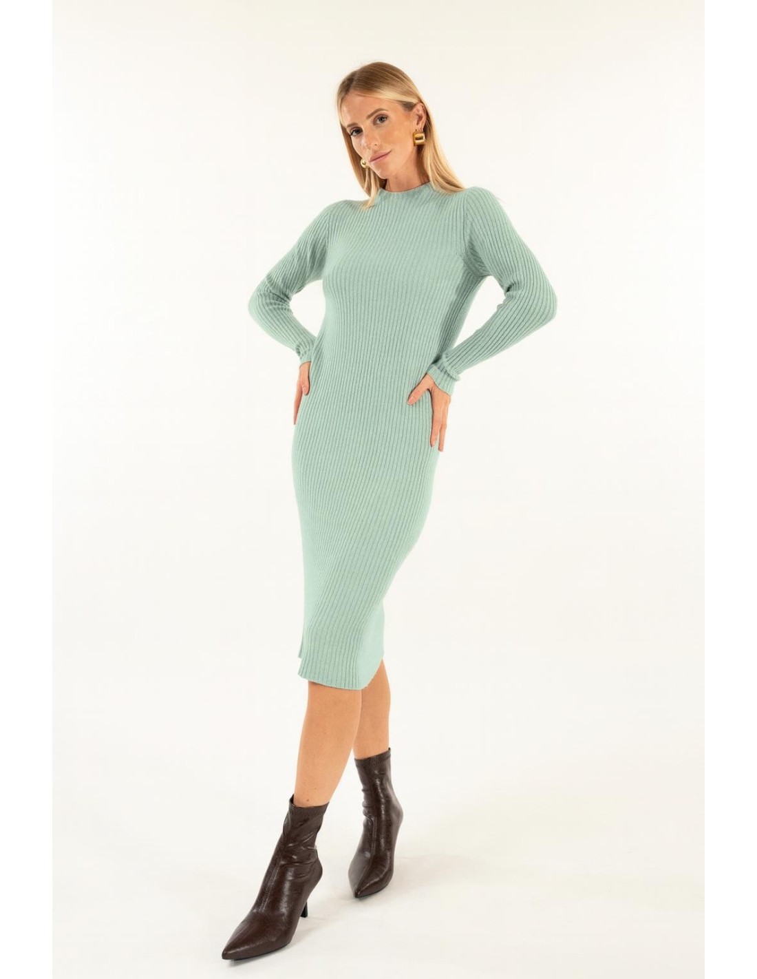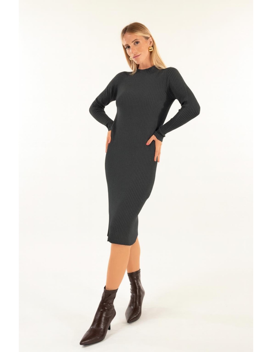 Kontatto assina um midi em malha canelada com um corte justo mas confortável que esculpe a silhueta sem apertar. Fio de toque suave e elástico, gola limpa e mangas compridas. Fenda na bainha para liberdade de movimentos. Versátil da secretária ao jantar: com um blazer no escritório, com botins para o lazer.