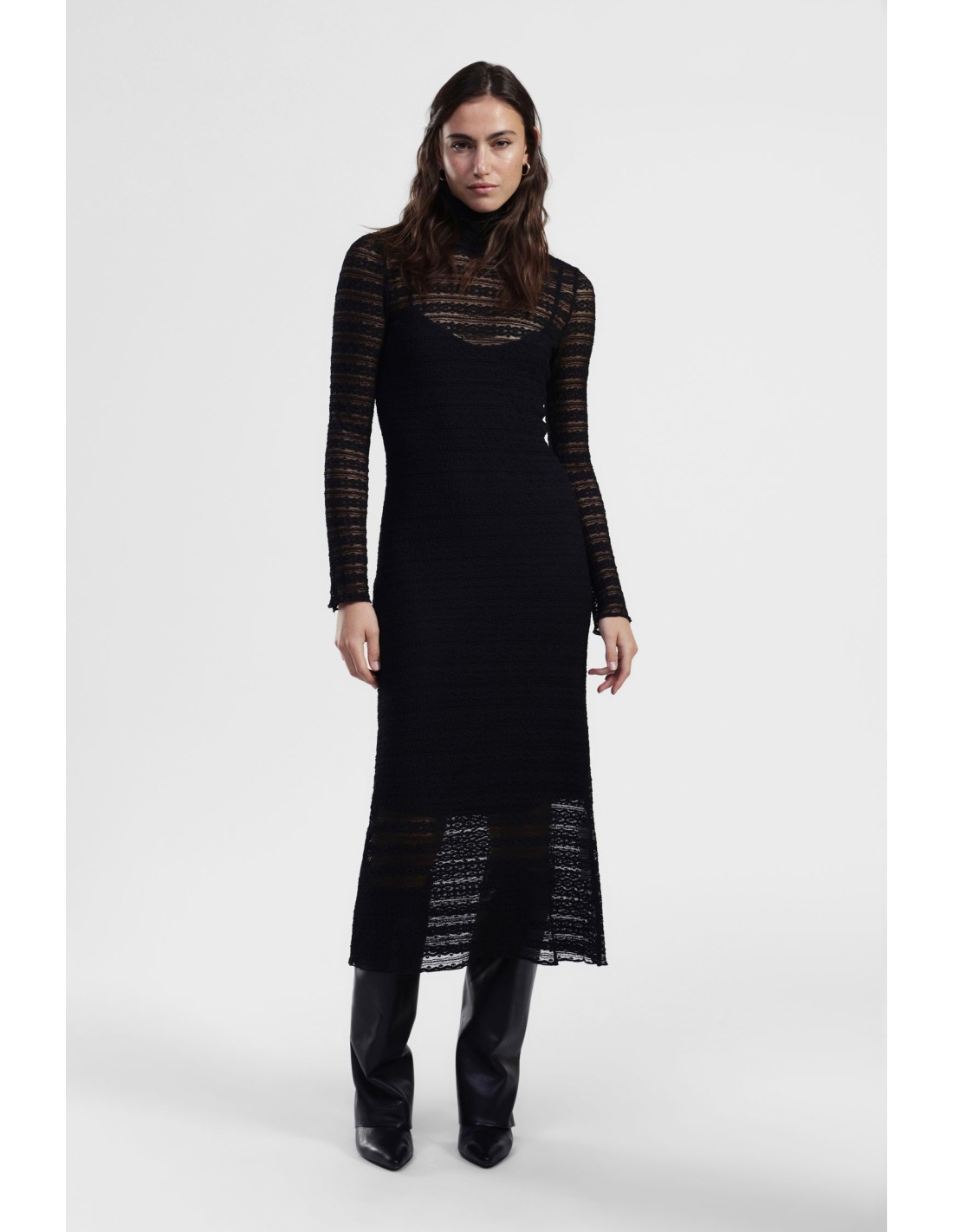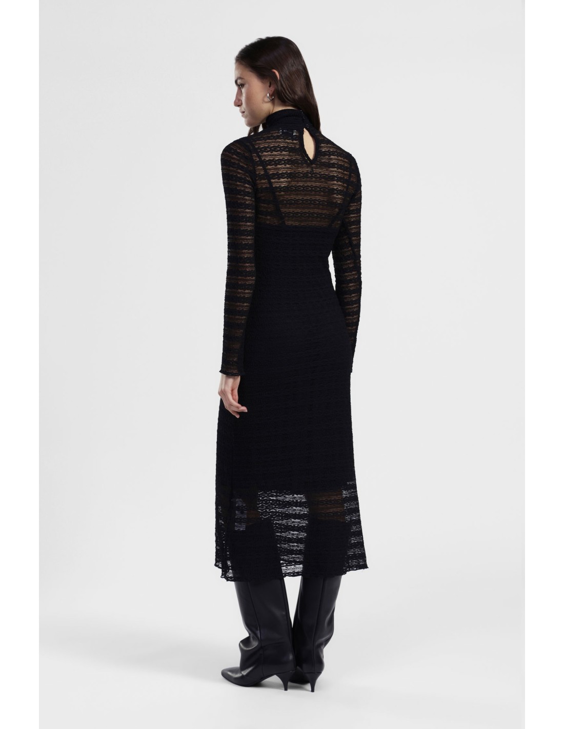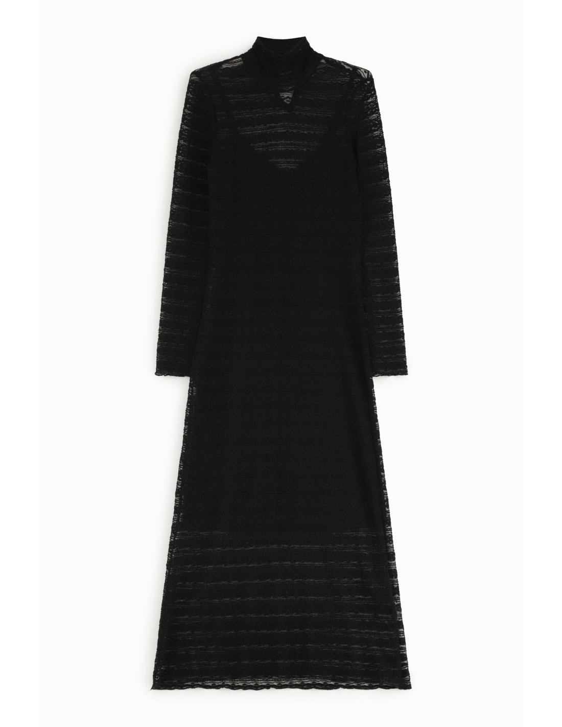 Perfeito para quem gosta de ser original todos os dias, este vestido comprido joga com um delicado efeito transparente às riscas e uma silhueta suave. A gola alta e as mangas compridas dão-lhe um toque sofisticado, ideal para todas as estações. Imagine usá-lo com botins ou sandálias para tornar cada momento único.