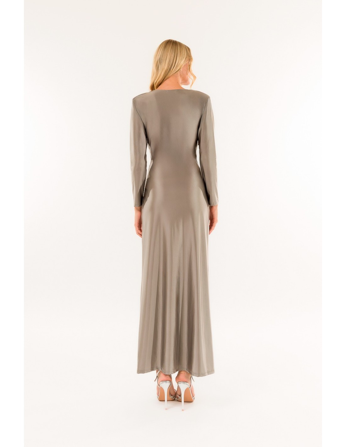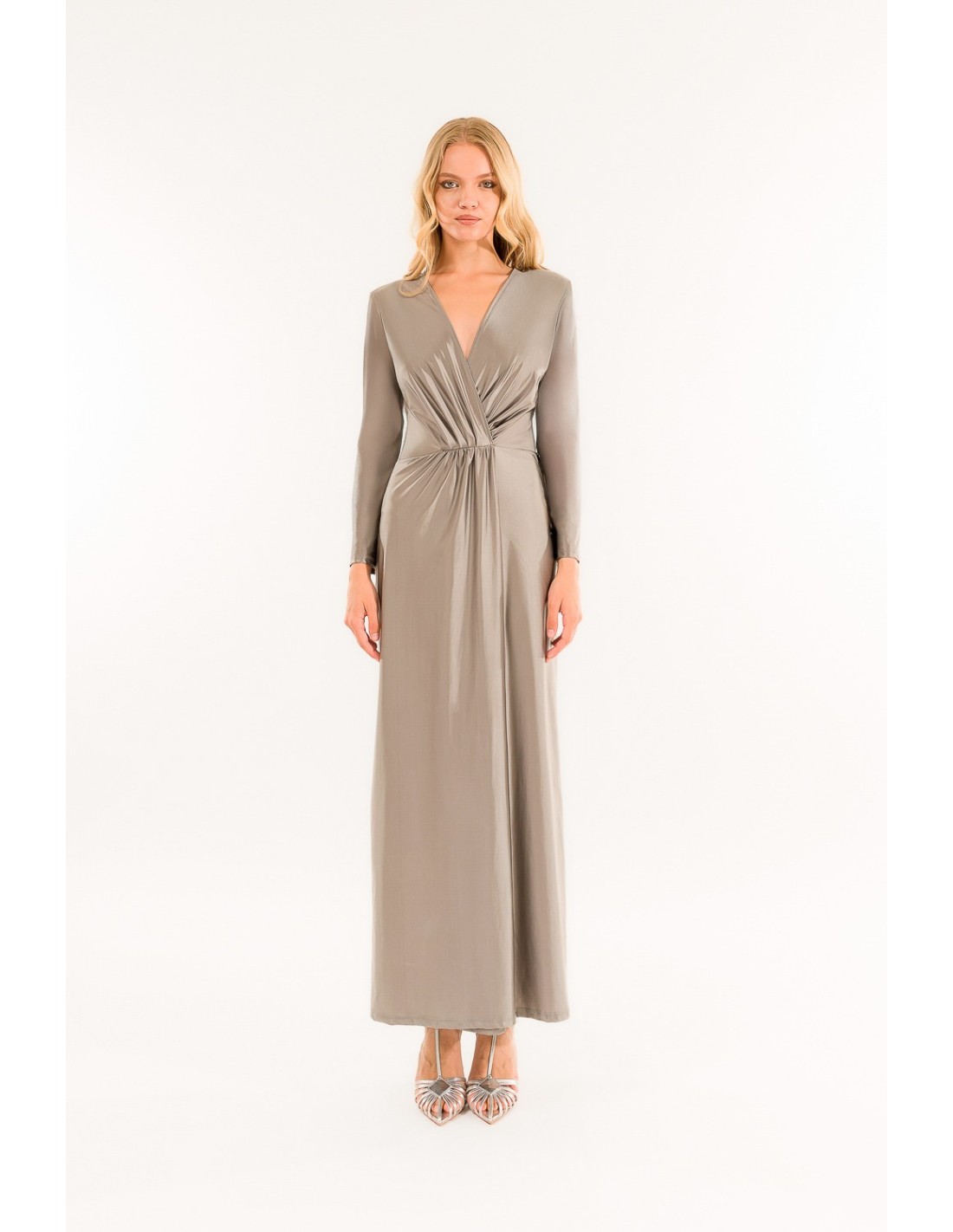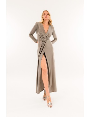 Deixe-se envolver pelo fascínio de um drapeado longo, um decote profundo e uma fenda vertiginosa: refinada, sinuosa, concebida para realçar a sua feminilidade em qualquer ocasião especial. Uma peça que fala de elegância intemporal.
