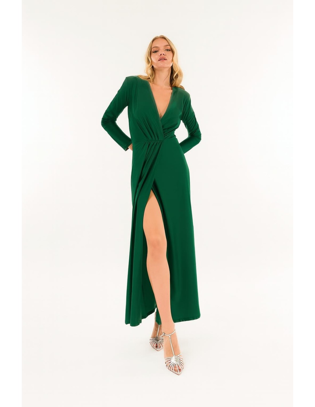 Deixe-se envolver pelo fascínio de um drapeado longo, um decote profundo e uma fenda vertiginosa: refinada, sinuosa, concebida para realçar a sua feminilidade em qualquer ocasião especial. Uma peça que fala de elegância intemporal.