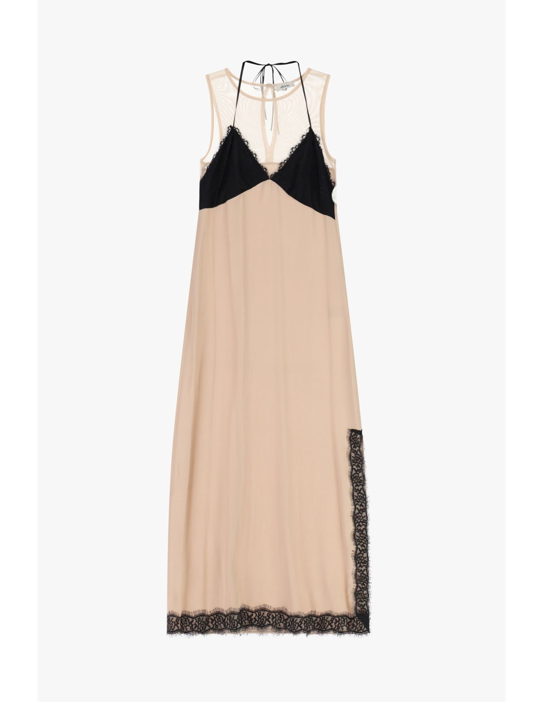 Este vestido comprido de corte fluido dá movimento a cada passo. O jugo transparente e as alças finas entrelaçam-se suavemente nas costas, enquanto o acabamento em renda define o decote e a bainha. Perfeito para usar tanto de dia como de noite, dá um toque pessoal e sofisticado aos seus looks.