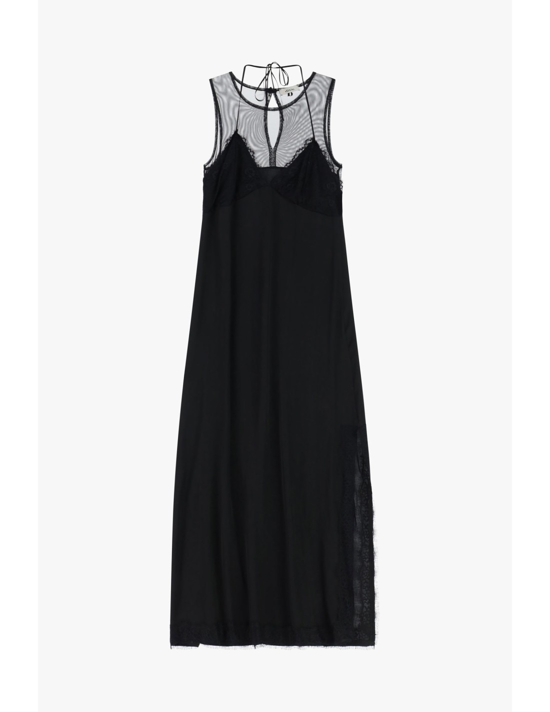 Este vestido comprido de corte fluido dá movimento a cada passo. O jugo transparente e as alças finas entrelaçam-se suavemente nas costas, enquanto o acabamento em renda define o decote e a bainha. Perfeito para usar tanto de dia como de noite, dá um toque pessoal e sofisticado aos seus looks.
