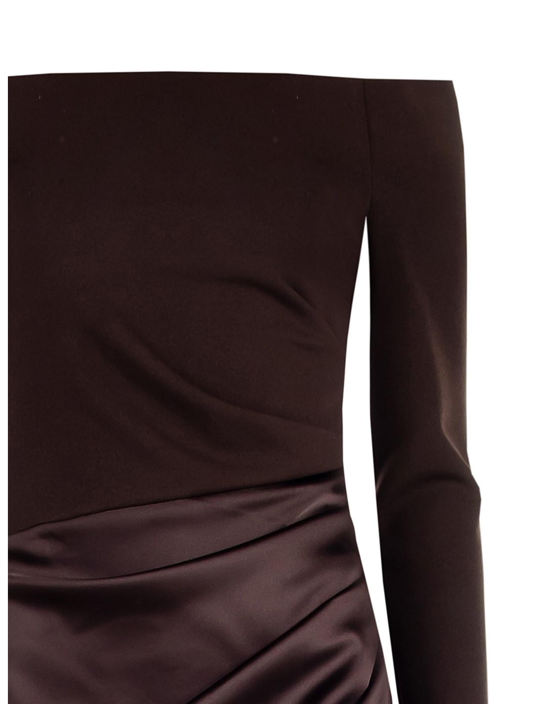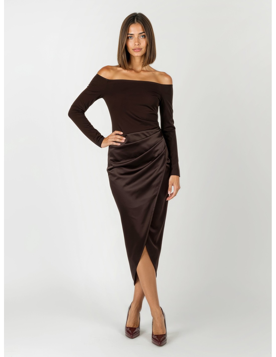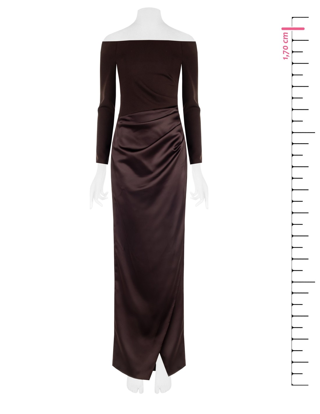 Vestido comprido Rinascimento: corte adelgaçante com saia envolvente que adelgaça a silhueta. Corpete em crepe de esparguete macio e confortável, saia de cetim fluida. Decote bardot que realça os ombros e drapeado à frente com fenda cruzada para um ajuste natural. Perfeito para cerimónias, festas e jantares.