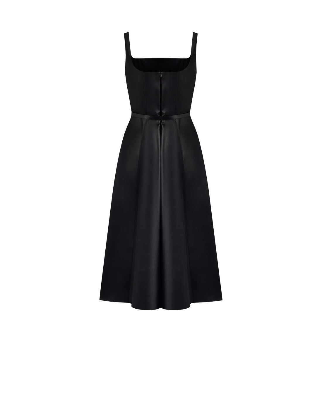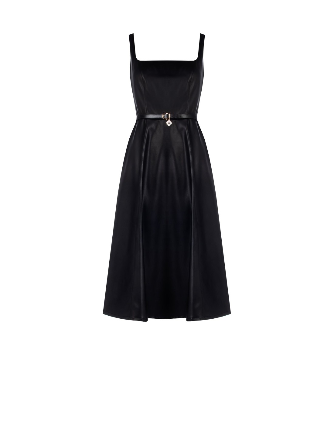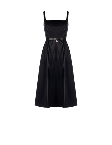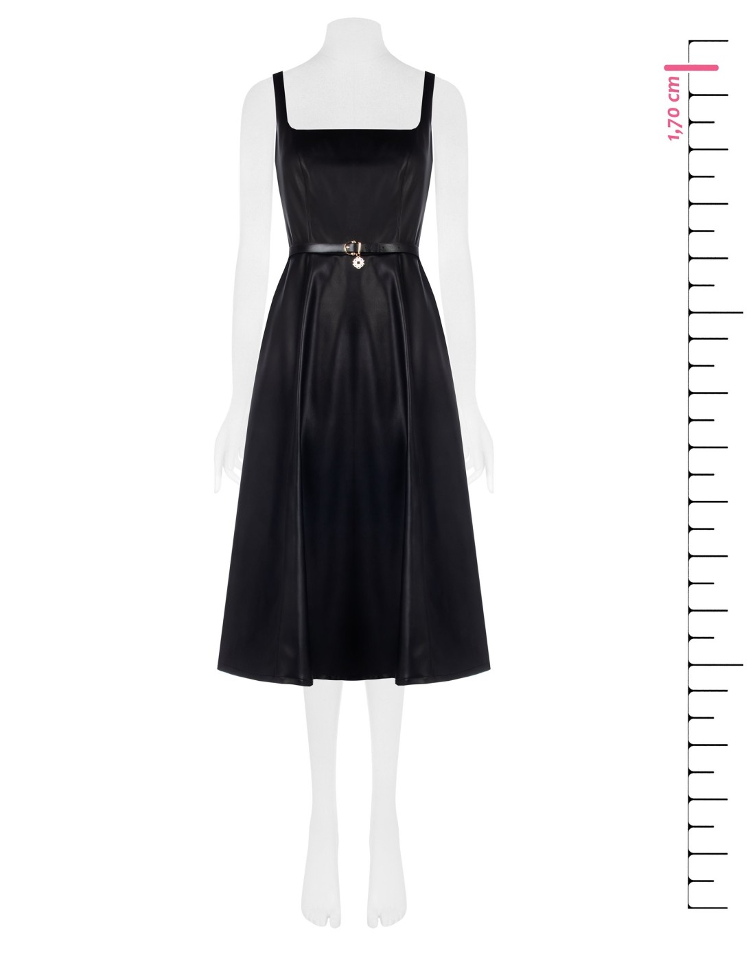 Um vestido midi com uma linha larga que realça a cintura. Em couro sintético macio com um toque sedoso, é definido por um decote quadrado e um cinto fino com um charme metálico. O fecho de correr atrás garante um ajuste perfeito. Perfeito para o trabalho com um blazer, irresistível para um jantar ou uma festa com sandálias altas.