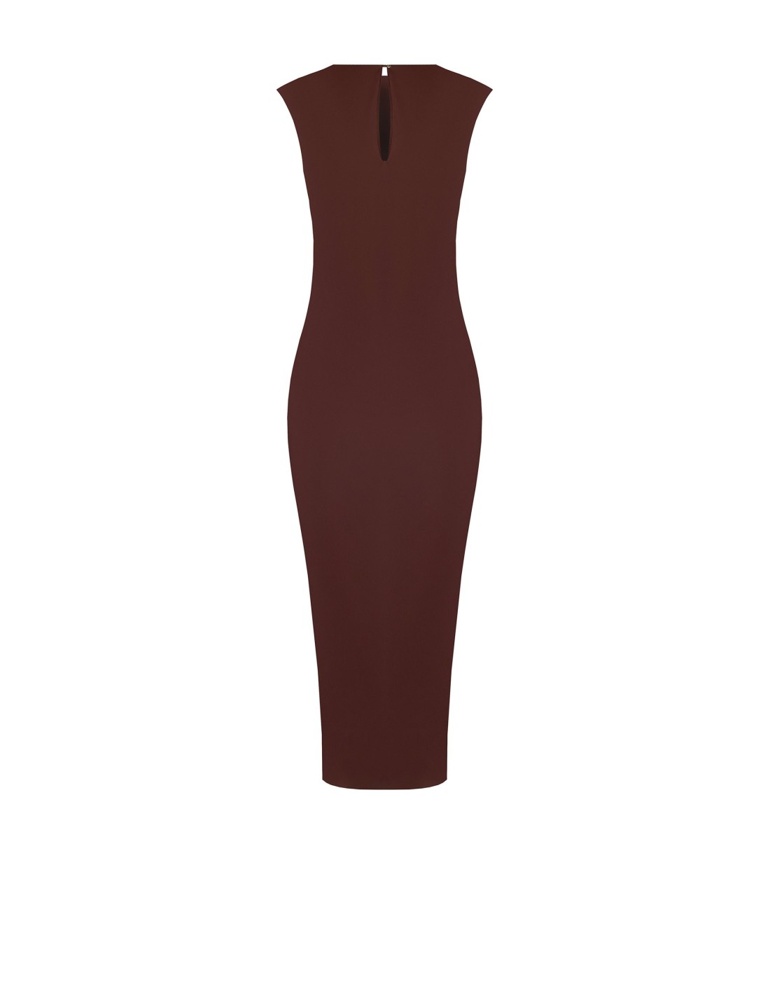 Rinascimento propõe um comprimento longo com uma linha ajustada que esculpe a silhueta com conforto. Confeccionado em tecido técnico suave e elástico, realça a cintura graças às pregas laterais interrompidas por um pormenor de joia. Decote redondo, fenda na parte inferior para maior liberdade de movimentos. Perfeito para cerimónias, festas e jantares especiais.