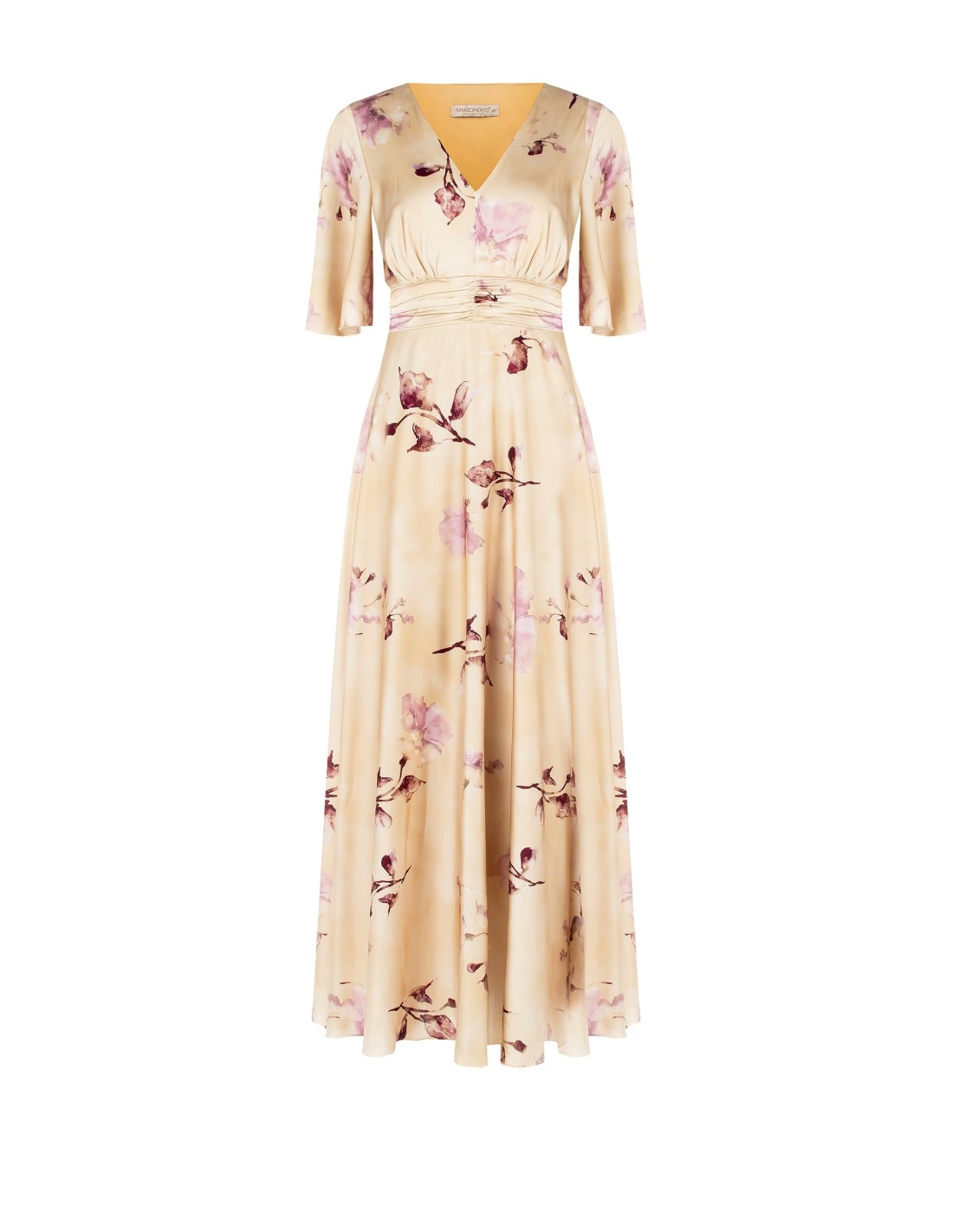 Vestido comprido império de cetim com flores grandes e decote em bico cruzado Rinascimento