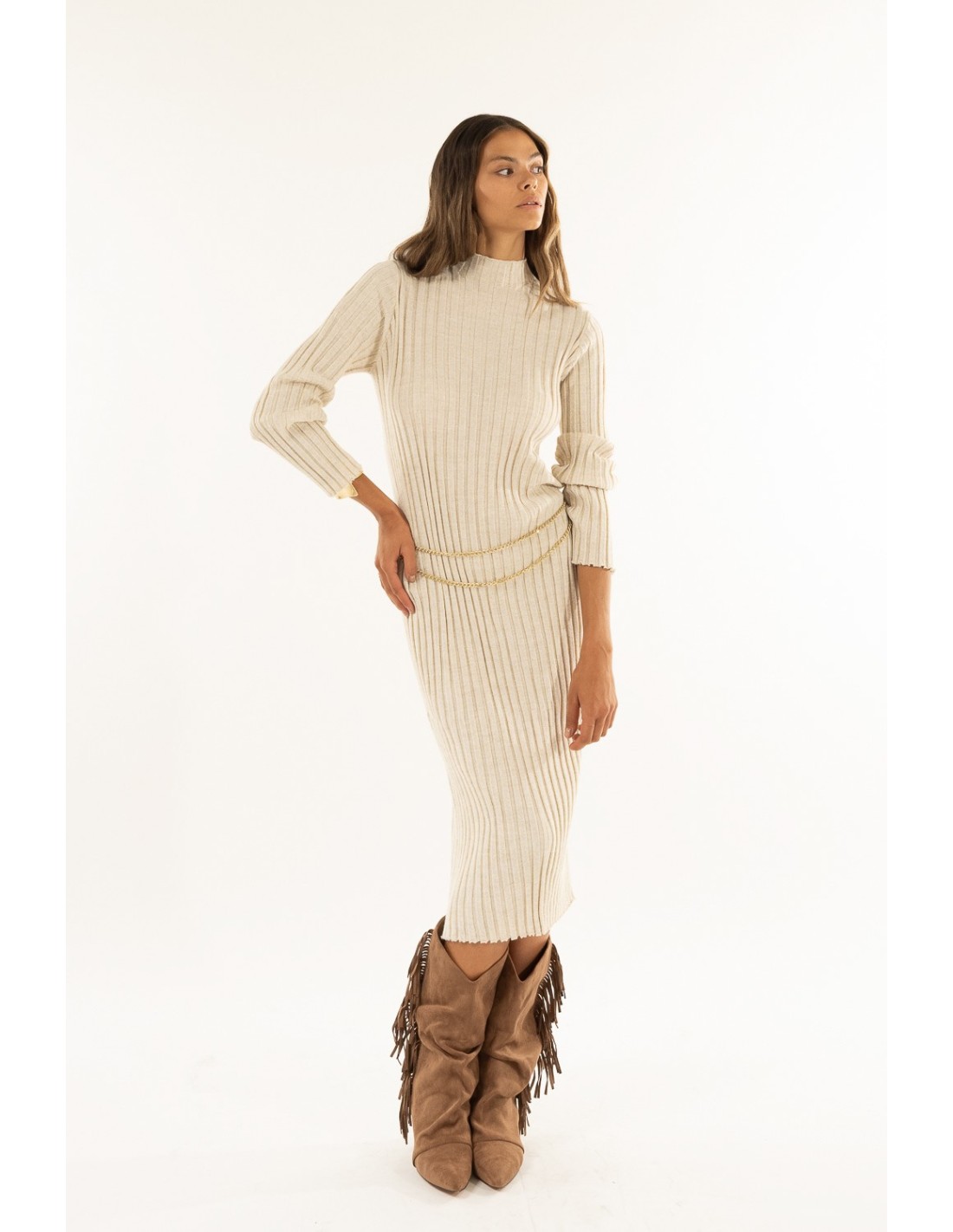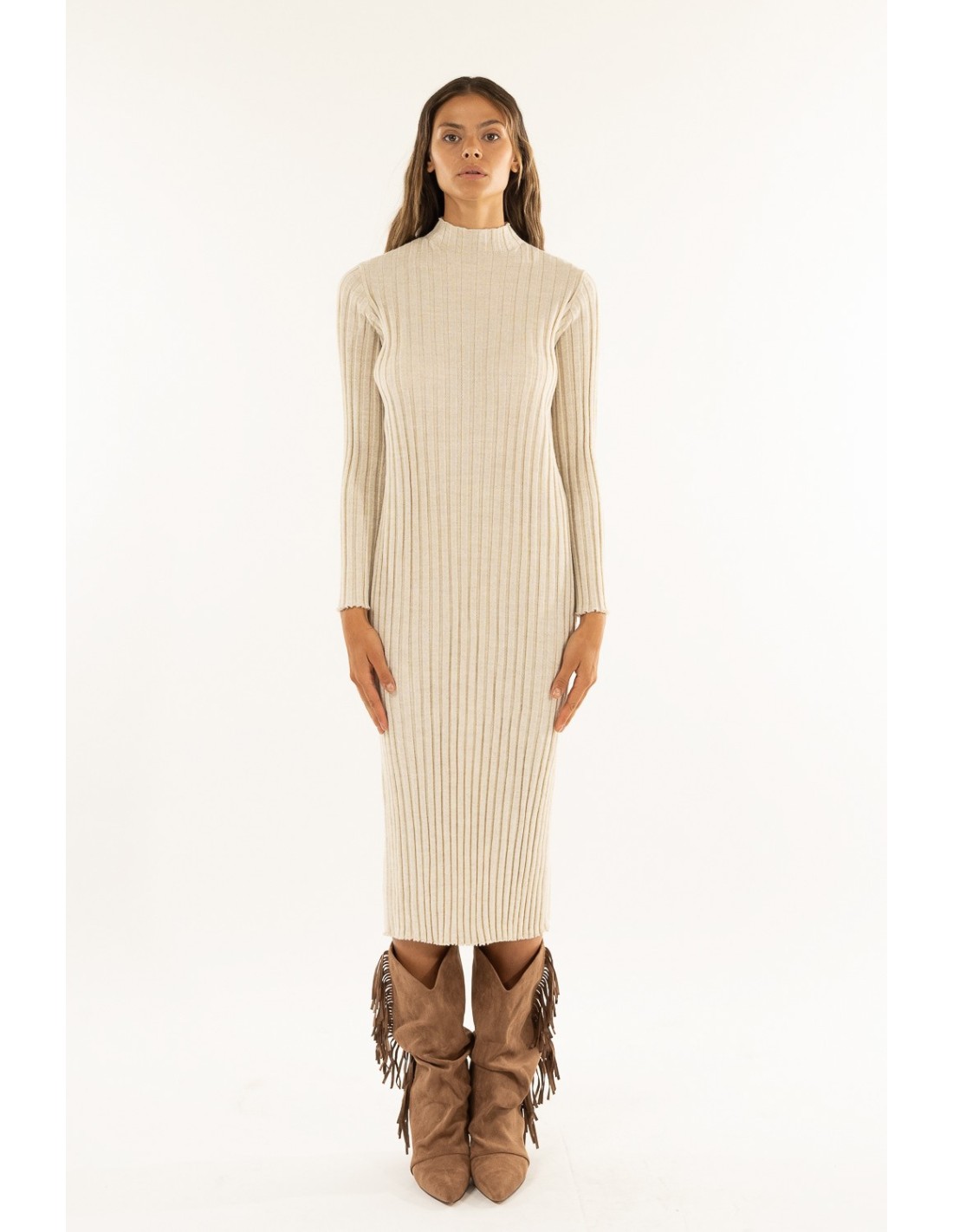 Kontatto assina um vestido comprido em malha, justo mas confortável graças à malha canelada que esculpe a silhueta. Fio macio e quente, gola alta delicada e fundo ligeiramente ondulado. Fácil de misturar e combinar, perfeito do escritório para um aperitivo: basta mudar de acessórios para ir à festa.