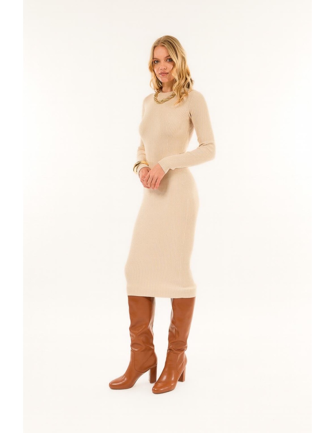 Envolva a sua silhueta numa camisola refinada com um corte midi e um ajuste sensual. As suas linhas limpas realçam a feminilidade com elegância, perfeita para se destacar com classe em qualquer ocasião. Para vestir, basta desejar.