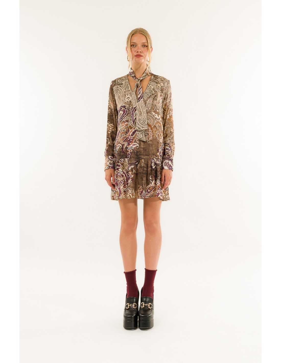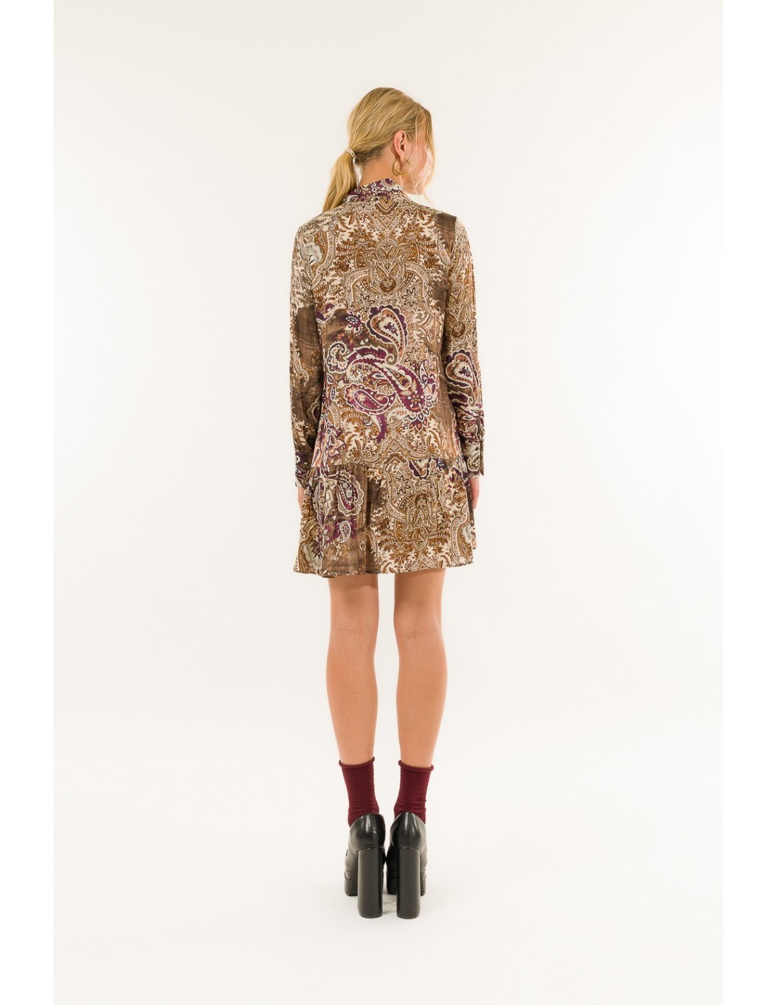 Kontatto assina um mini vestido com um corte suave e fluido, em tecido leve com estampado paisley e mão sedosa. Decote em gota com saia amovível em renda e folho que realça a silhueta em movimento. Perfeito do escritório para um aperitivo, com botas ou mary janes para uma elegância casual.