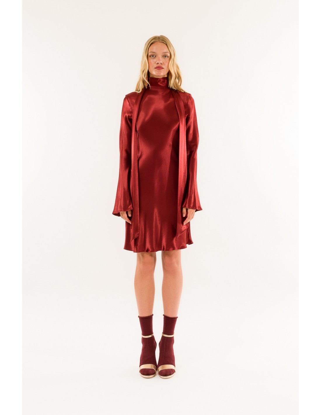 Linhas suaves e sofisticadas, mangas largas e um lenço para atar: este vestido veste todas as ocasiões com charme e feminilidade. Ele desliza sobre a silhueta dando uma luz especial a cada movimento. Requintado, contemporâneo, irresistível.