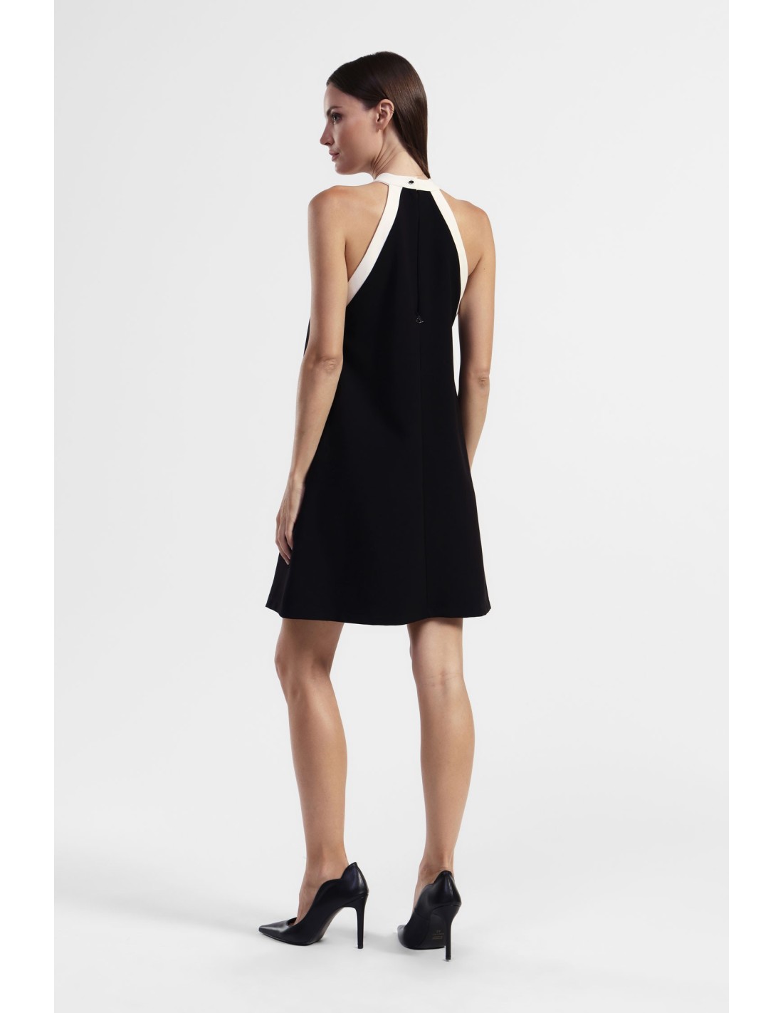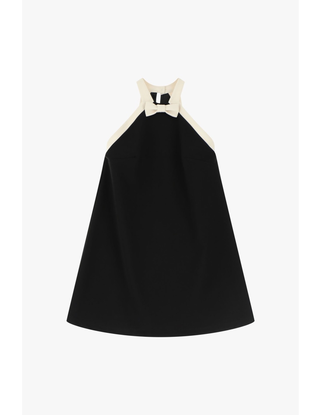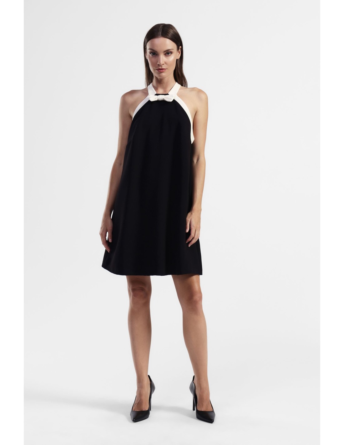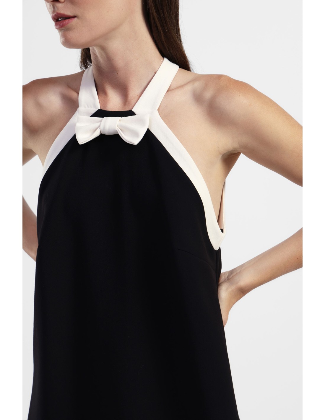 Este vestido curto chique apresenta um design com decote haltere, perfeito para realçar os ombros. O corte sem mangas e as linhas simples tornam-no ideal para noites elegantes ou para uma saída especial. A ausência de fechos garante um ajuste confortável e requintado, enquanto o detalhe do laço acrescenta um toque de graça.