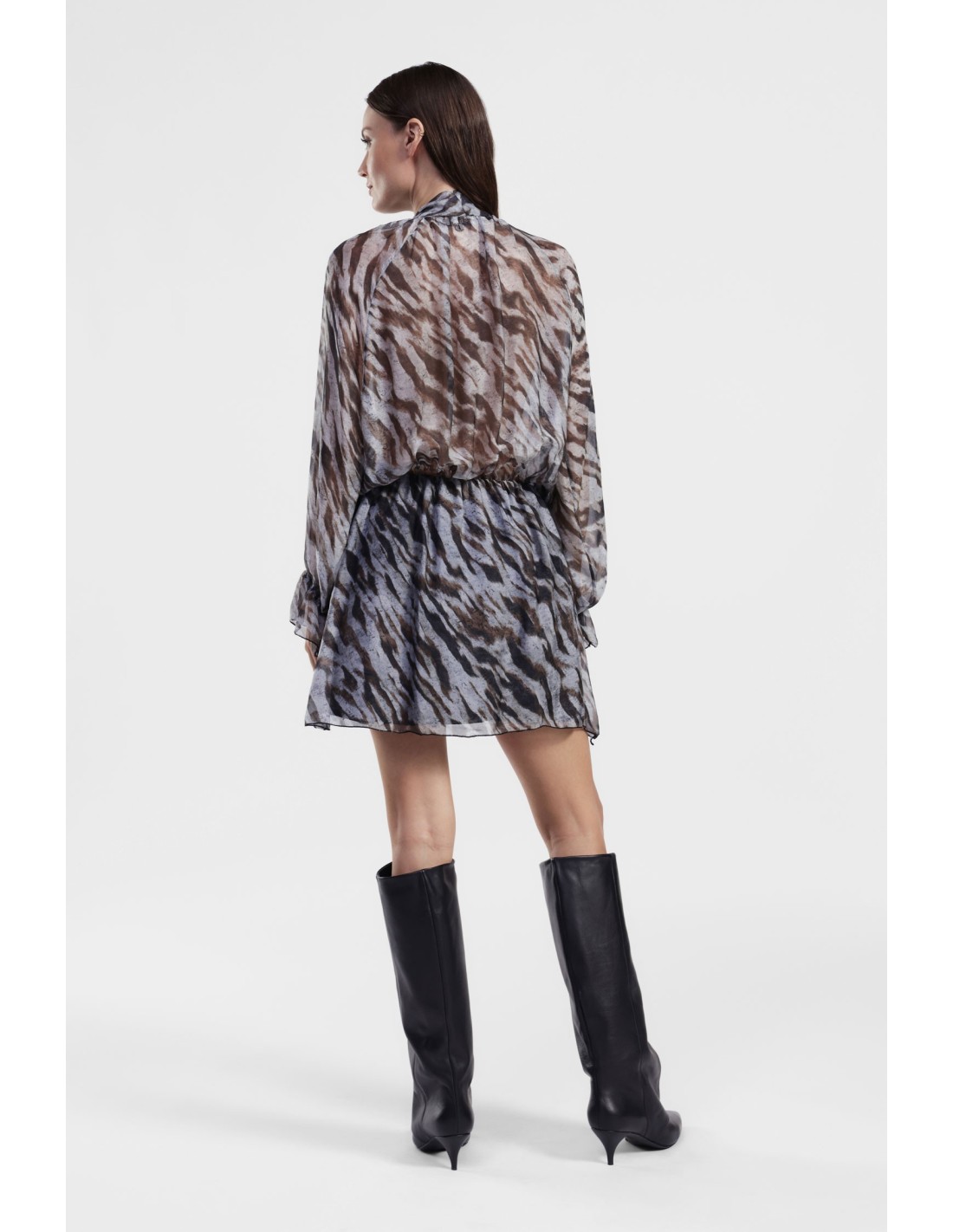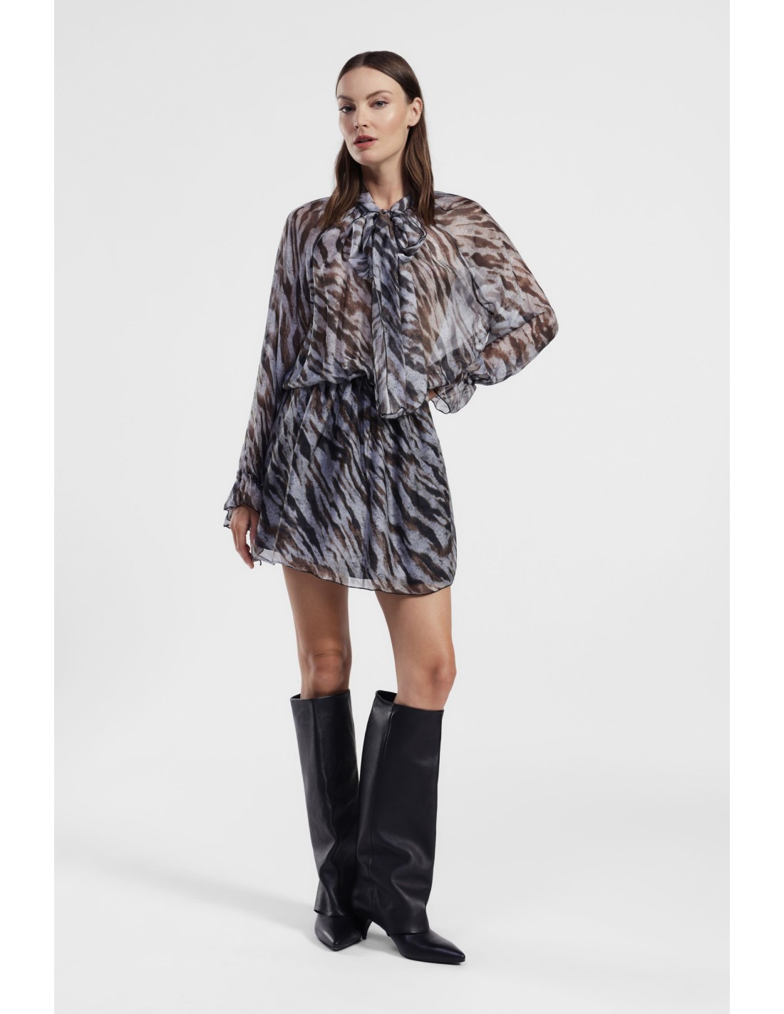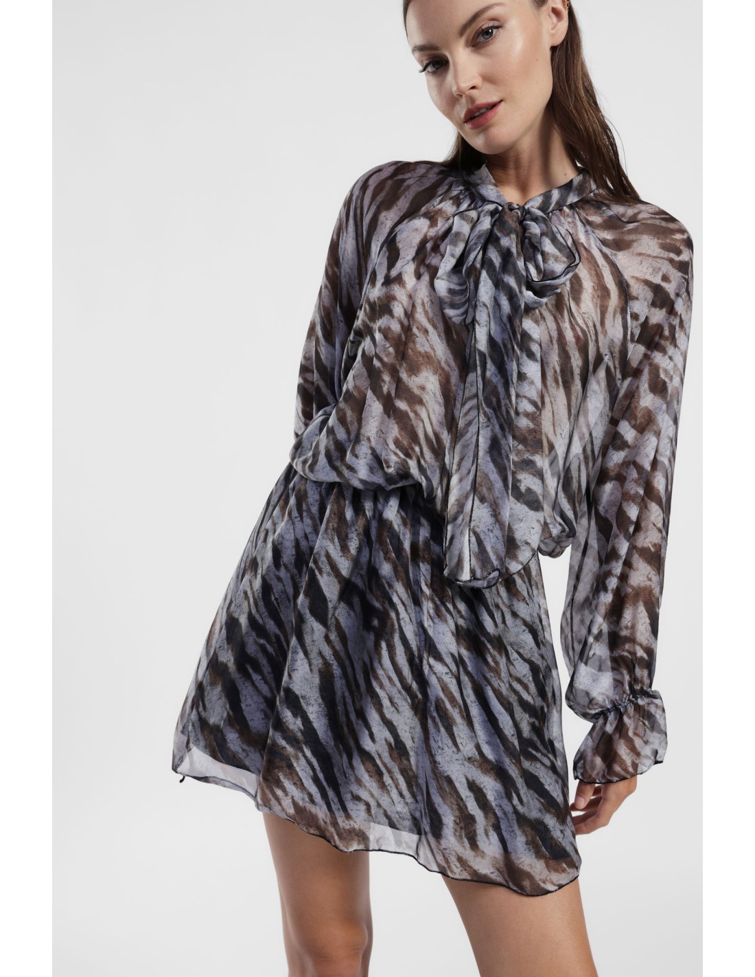 Deixe-se surpreender por este vestido curto de corte suave com estampado animal. As mangas compridas e largas e o pormenor do laço no pescoço dão um toque original, perfeito para quem gosta de se destacar todos os dias. Adapta-se facilmente de manhã à noite, dando movimento e leveza a cada passo.