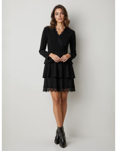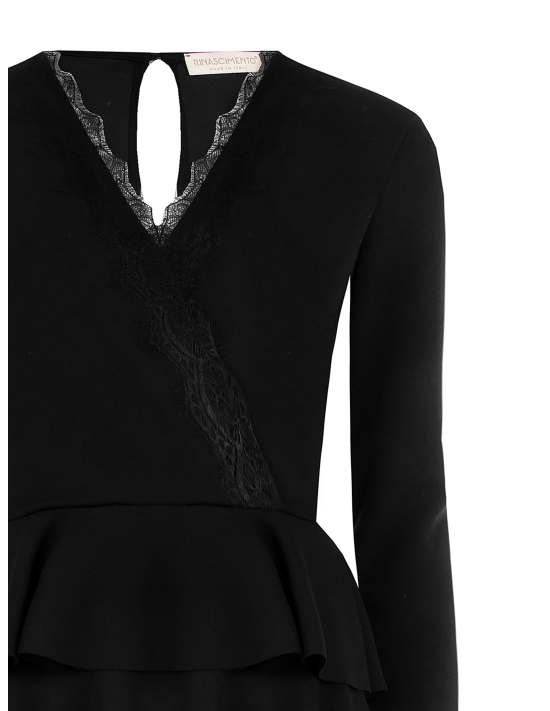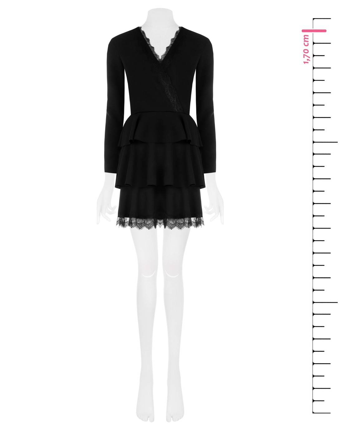 Rinascimento apresenta um mini com corte evasé que alonga a silhueta. Em crepe fluido com inserções e acabamento em renda, acaricia as formas com folhos suaves. Decote em V com detalhe em transparência e abertura em gota nas costas. Versátil para a noite: perfeito para festas, jantares e ocasiões especiais.