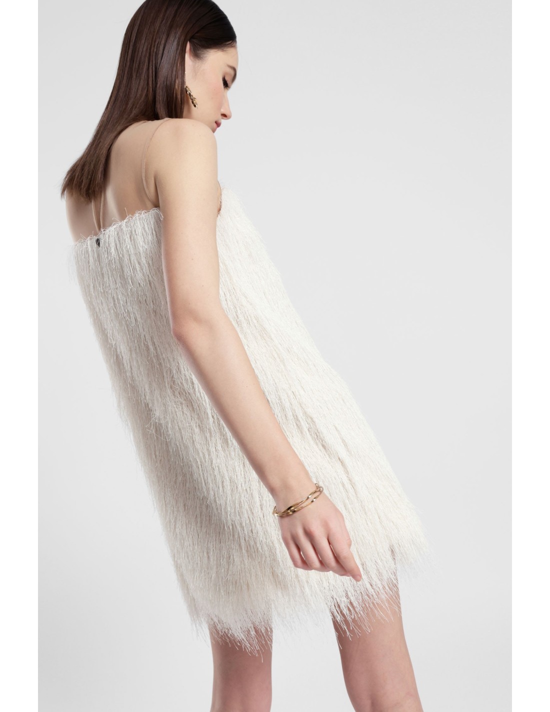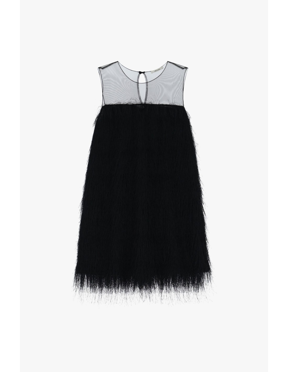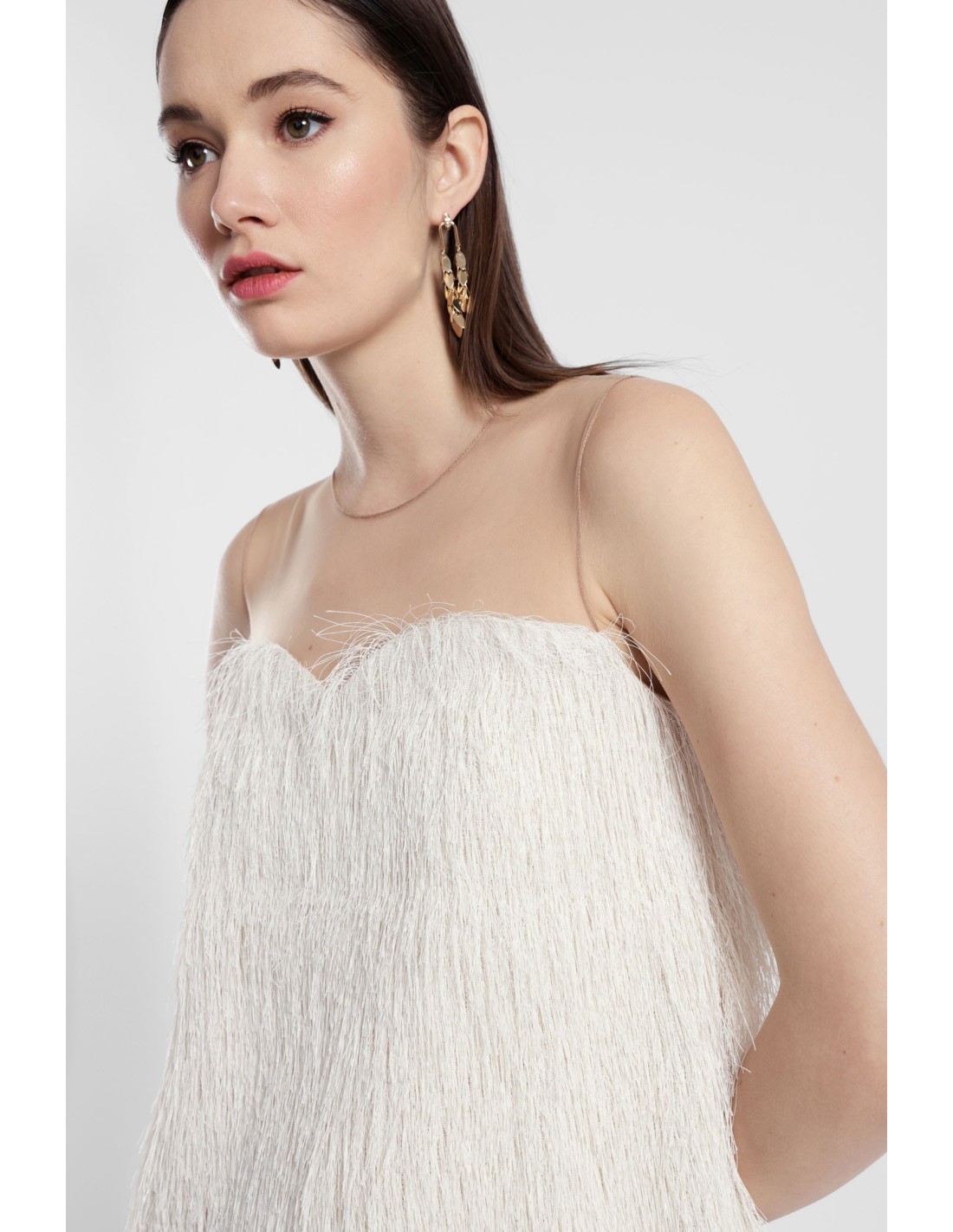 O corte evasé confere liberdade de movimentos, enquanto o painel superior transparente com detalhe em gota acrescenta carácter e originalidade. As franjas longas criam movimento a cada passo e tornam este vestido perfeito para os dias especiais ou para dar um toque de criatividade aos teus looks do dia a dia.
