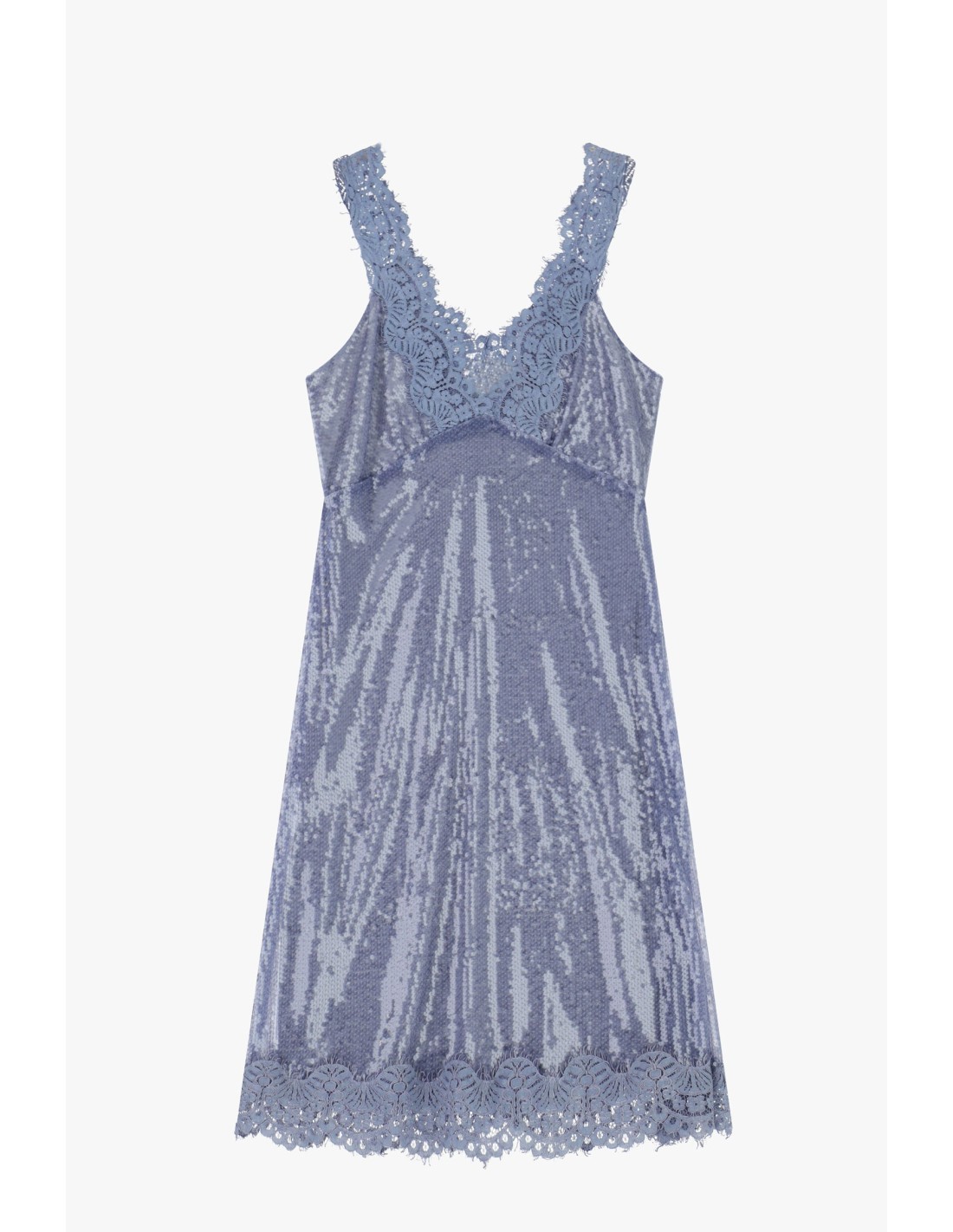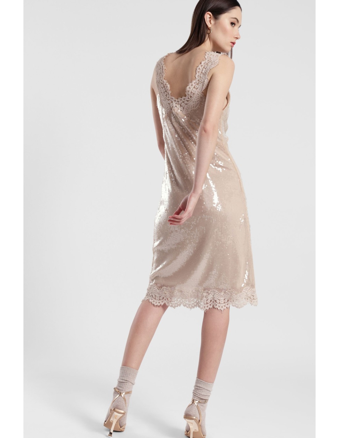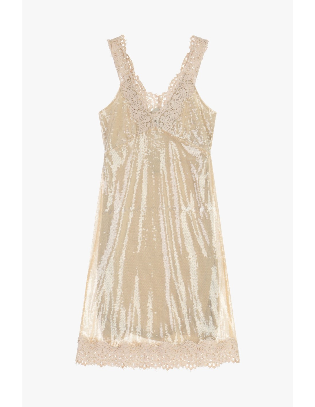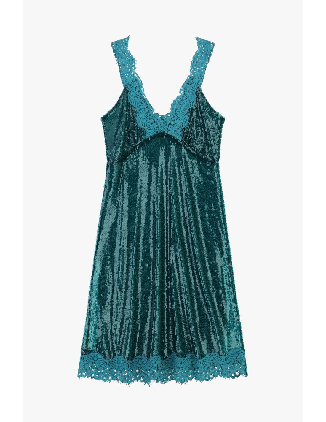 Um vestido curto que ilumina qualquer ocasião graças às lantejoulas com padrão vertical e à borda em renda que decora tanto o decote como a bainha. O corte suave e as alças largas garantem conforto e uma modelagem versátil, perfeito para destacar-se com carácter feminino tanto de dia como à noite.