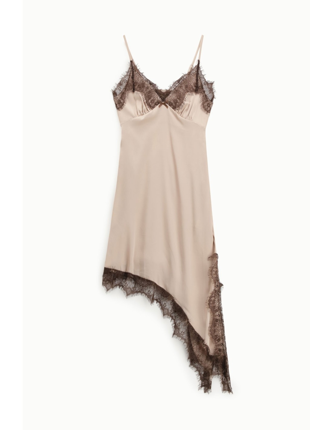 Um vestido curto que joga com a assimetria da parte de baixo e com os pormenores de renda em contraste no decote e na bainha. As alças finas realçam a linha dos ombros, enquanto o corte fluido o torna ideal sobre um blazer para passeios na cidade. Atenção aos detalhes, perfeito para se sentir especial todos os dias.