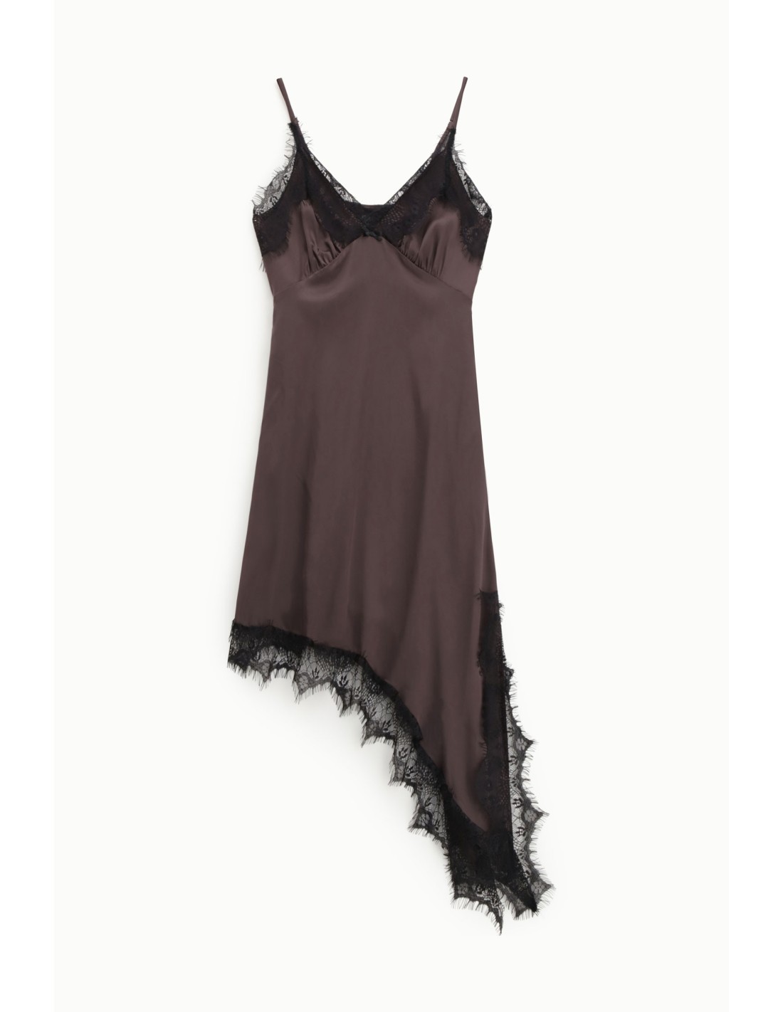 Um vestido curto que joga com a assimetria da parte de baixo e com os pormenores de renda em contraste no decote e na bainha. As alças finas realçam a linha dos ombros, enquanto o corte fluido o torna ideal sobre um blazer para passeios na cidade. Atenção aos detalhes, perfeito para se sentir especial todos os dias.