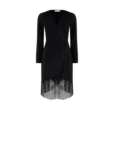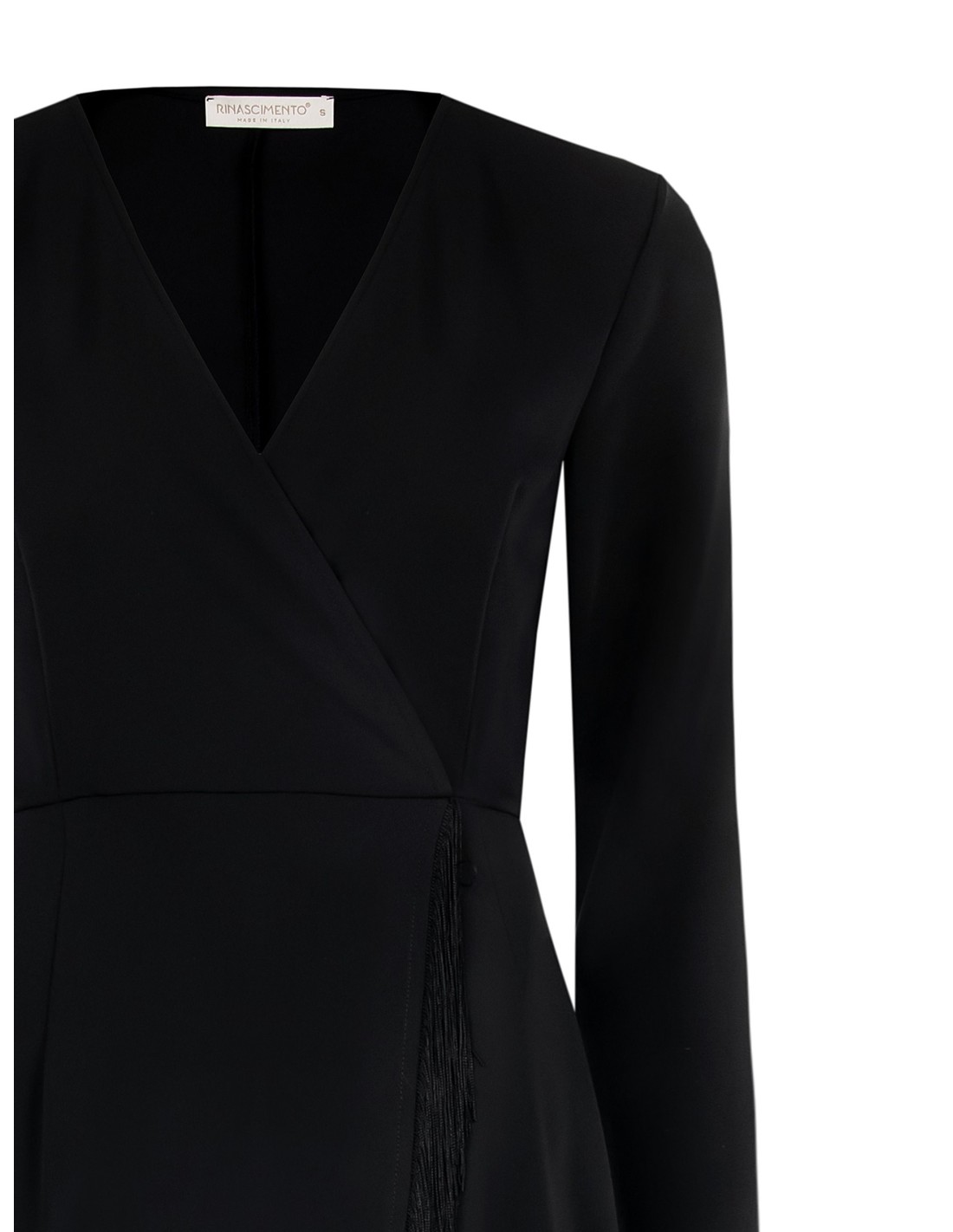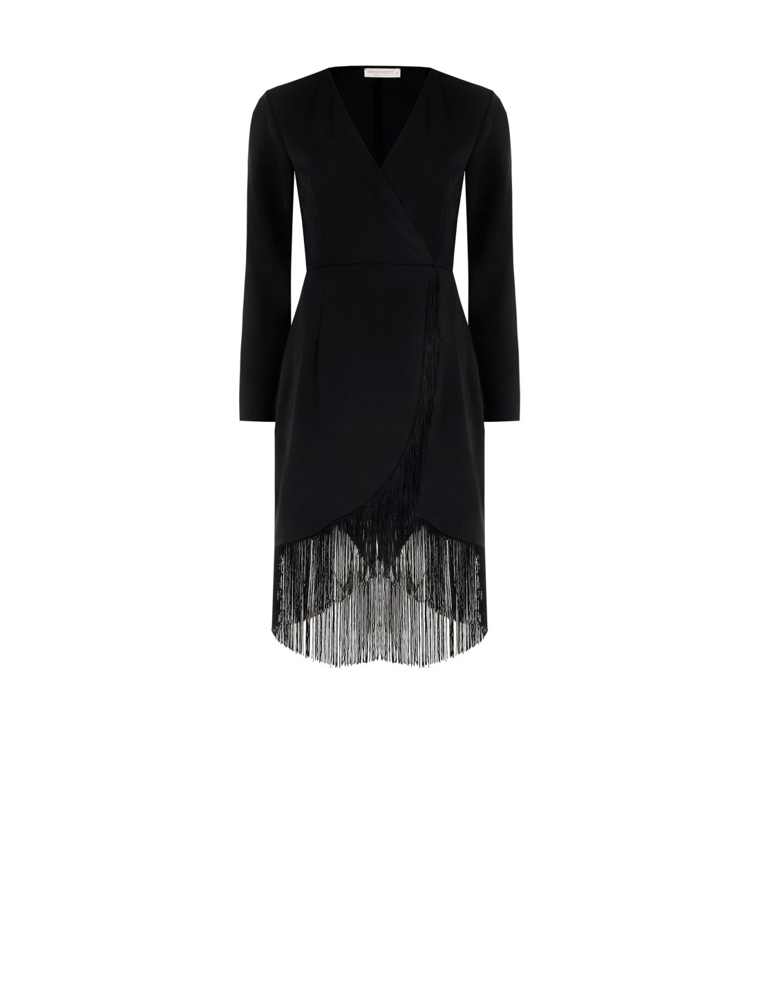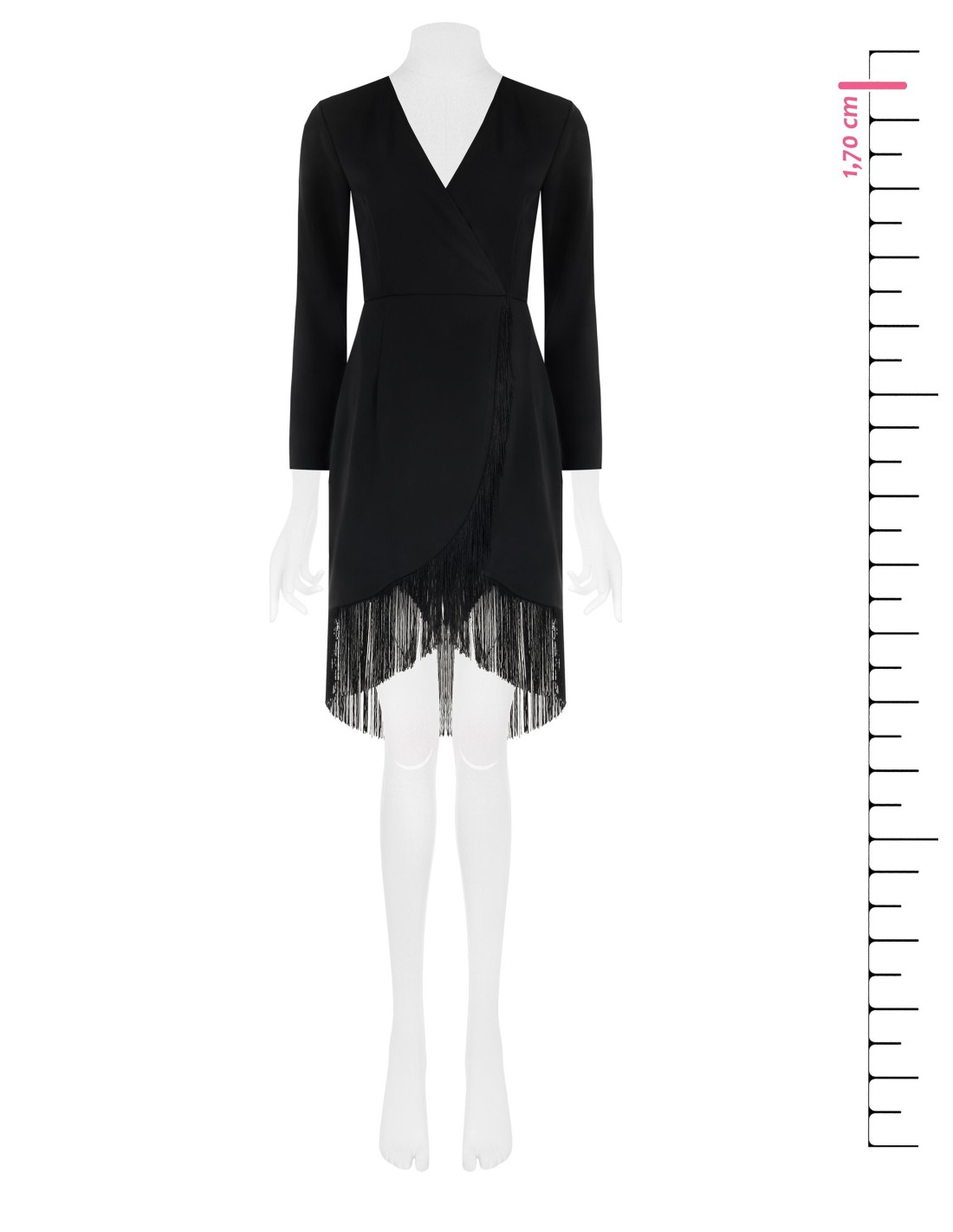 Vestido curto Rinascimento com corte justo, em tecido fluido que desliza sem marcar. Decote em V que alonga e sobreposição cruzada para realçar a cintura. Bainha assimétrica com franjas soltas que dão movimento ao passo. Perfeito para festas e jantares especiais, versátil também com blazer para o escritório.