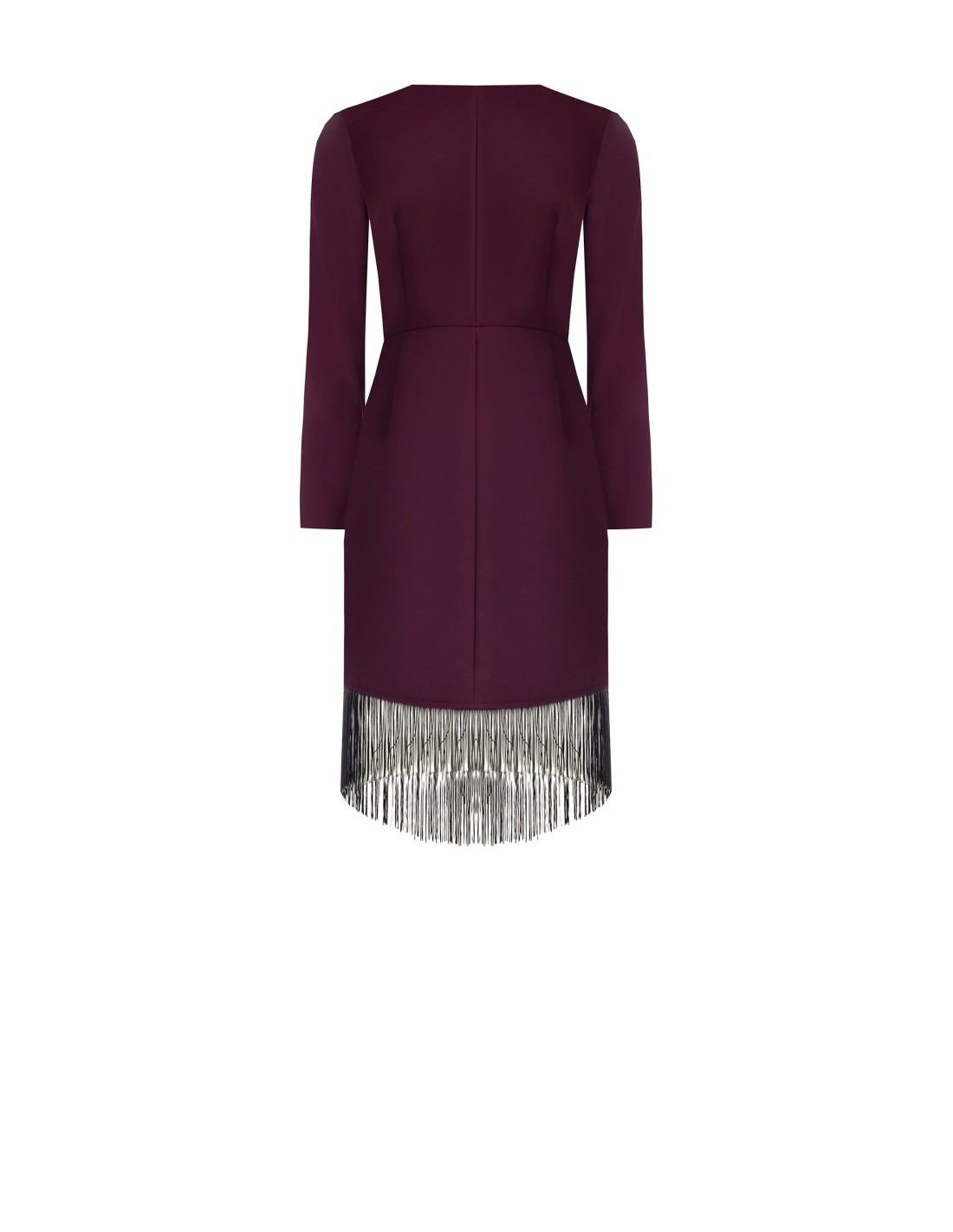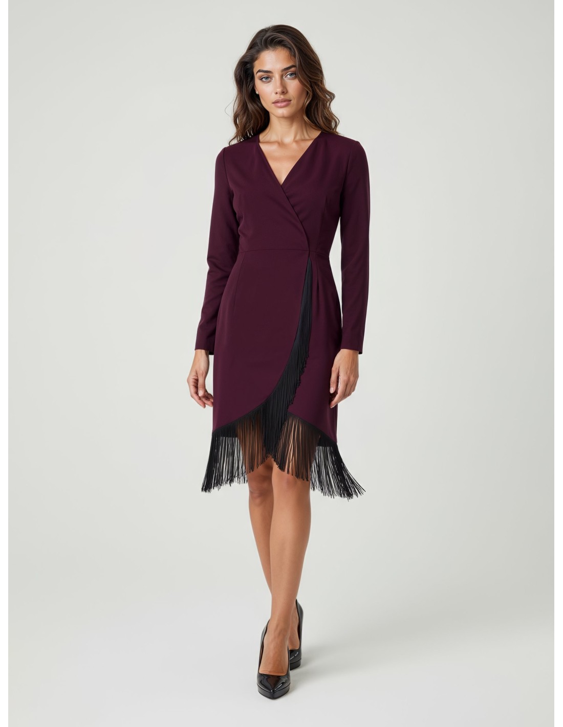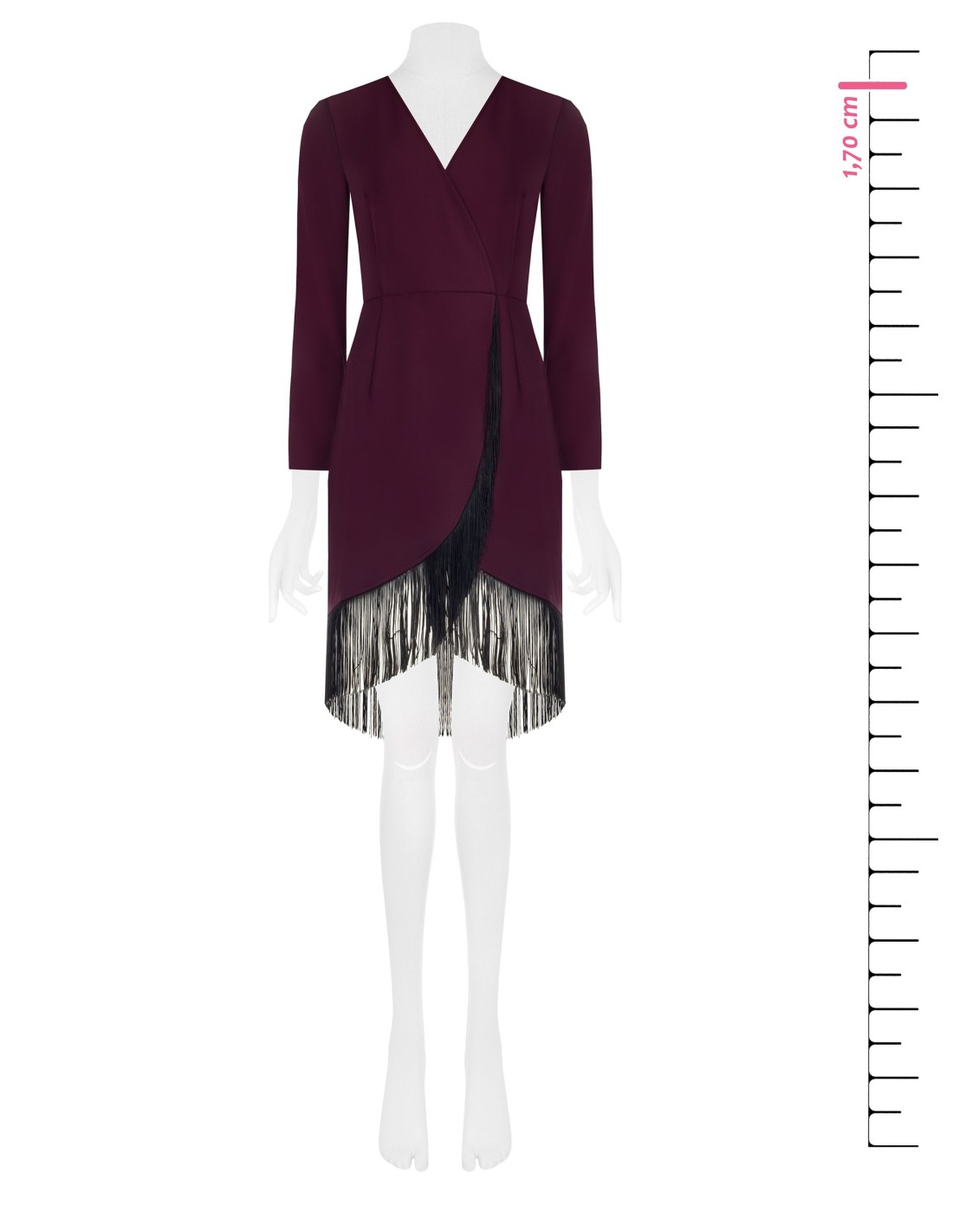 Vestido curto Rinascimento com corte justo, em tecido fluido que desliza sem marcar. Decote em V que alonga e sobreposição cruzada para realçar a cintura. Bainha assimétrica com franjas soltas que dão movimento ao passo. Perfeito para festas e jantares especiais, versátil também com blazer para o escritório.