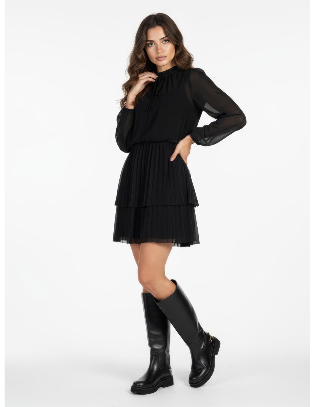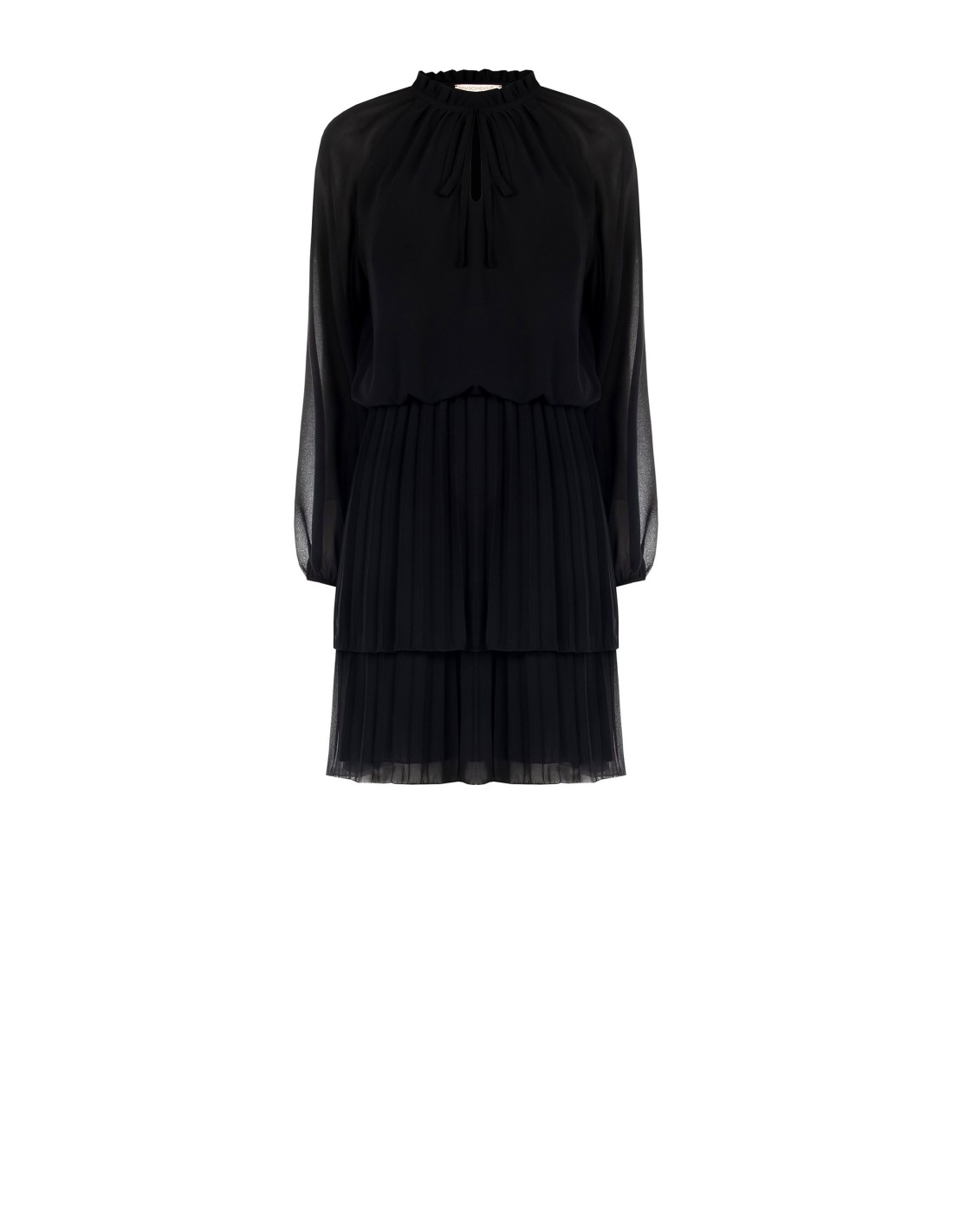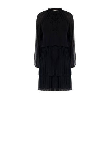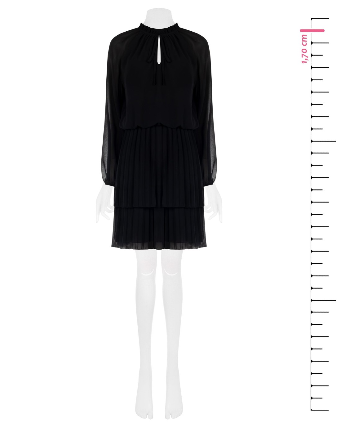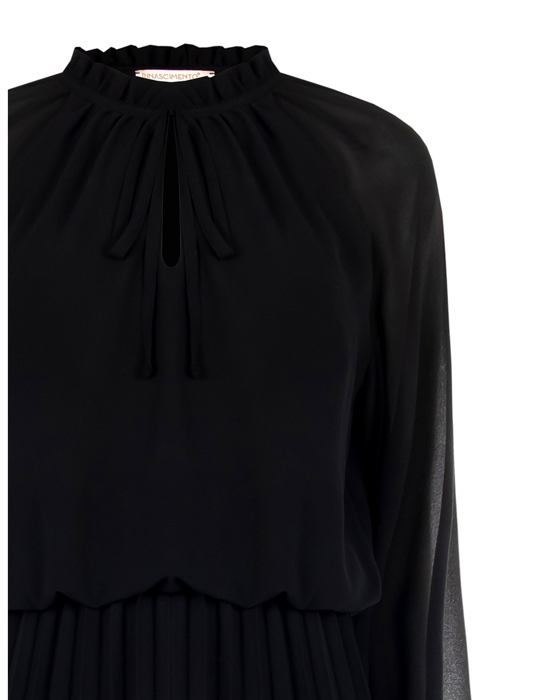 Rinascimento assina um mini vestido suavemente feminino com um corpete fluido e uma saia plissada com folhos que adelgaça a silhueta. Confeccionado em georgette leve com mangas transparentes. Decote franzido com pequena queda e atilhos, cintura elástica para maior conforto. Perfeito do escritório ao cocktail.