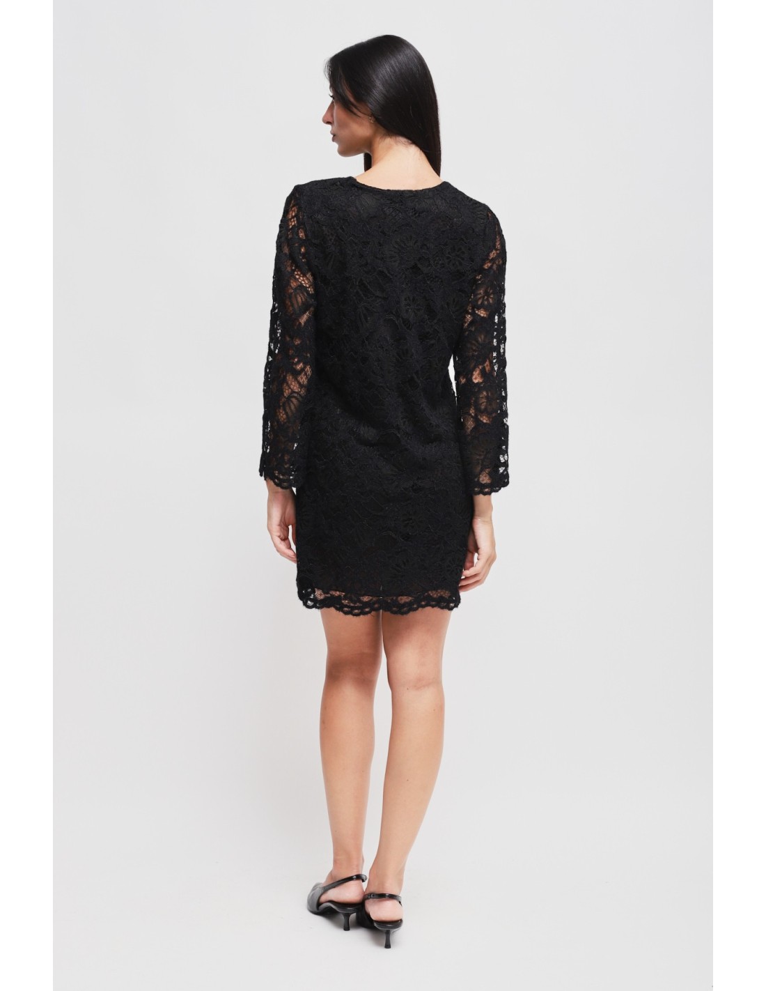 Mini vestido preto em renda. A linha evasê, o decote em V e as mangas compridas conferem um look elegante e sofisticado. Pode ser facilmente combinado com saltos para um outfit elegante ou com botas para um look mais arrojado.