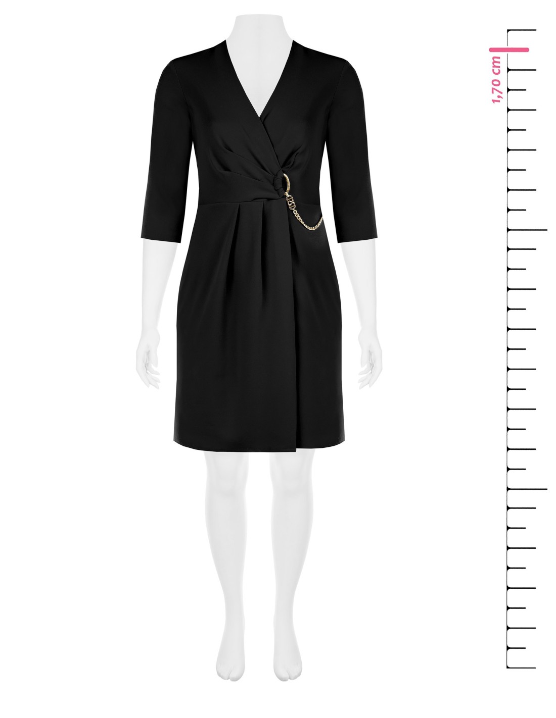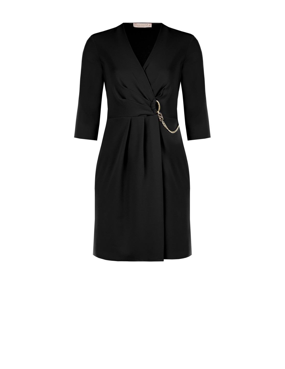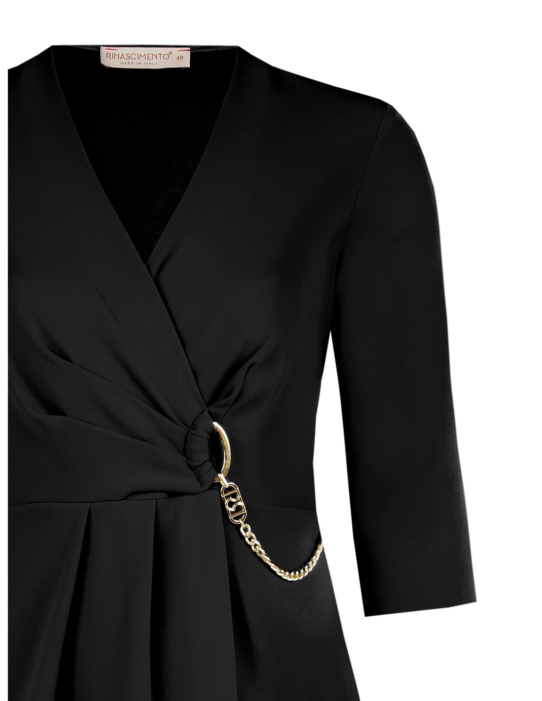 Mini elegante da Rinascimento Curvy: linha ajustada mas confortável, valoriza a silhueta com efeito envolvente e cintura definida. Crepe de espartilho fluido e elástico, agradável à pele. Decote em V e argola de corrente metálica, pregas à frente que adelgaçam. Perfeito do escritório às bebidas e para noites especiais.