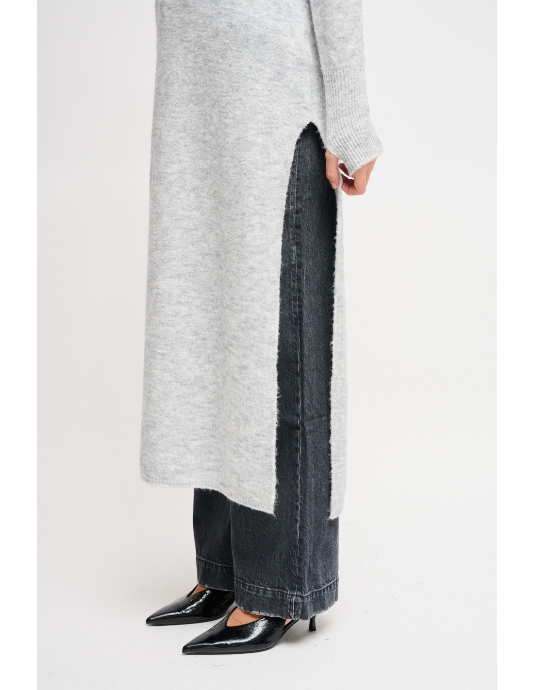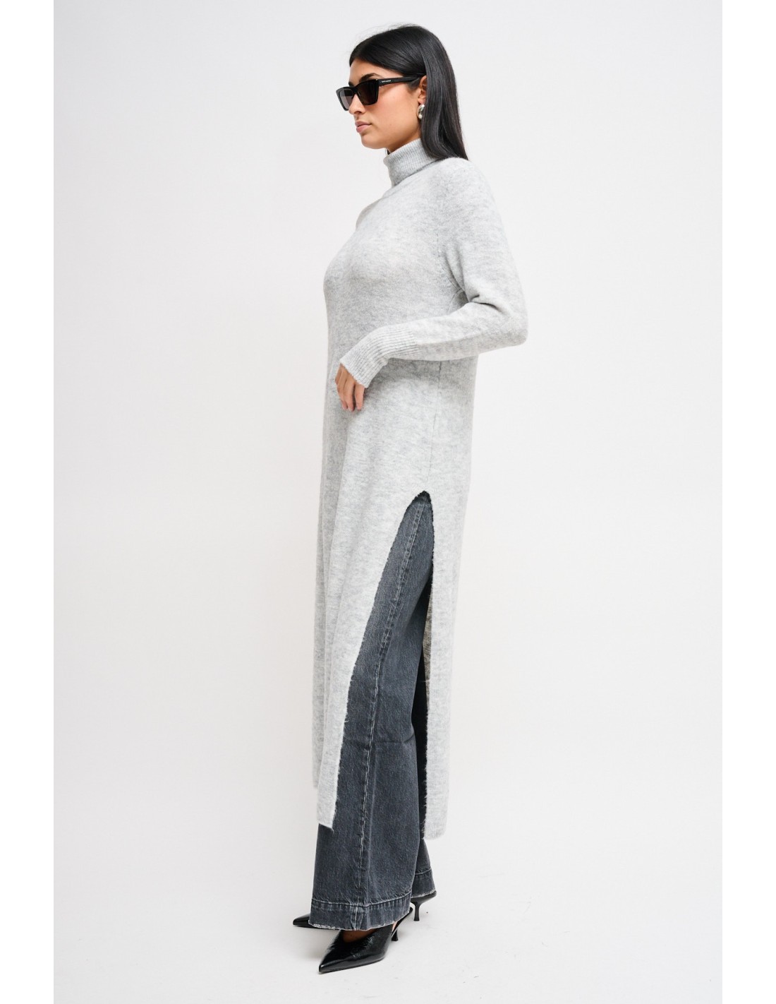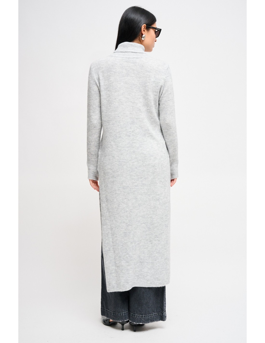 Esta camisola longa de gola alta apresenta-se como um versátil vestido midi de malha. Caracterizada por uma textura suave e um corte descontraído, possui uma profunda fenda lateral que acrescenta movimento e permite um layering moderno sobre calças largas. Uma peça tendência que une conforto e estilo contemporâneo.