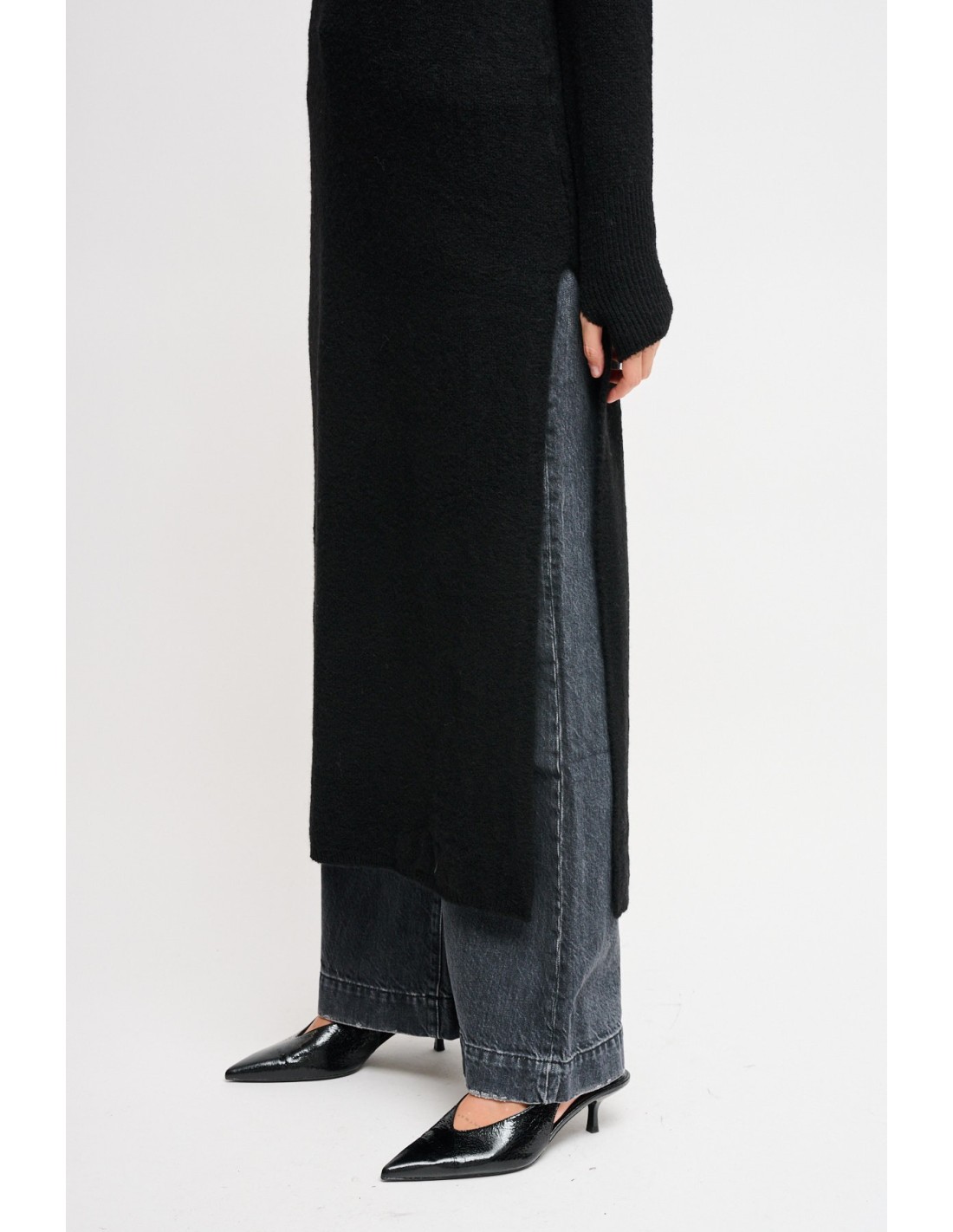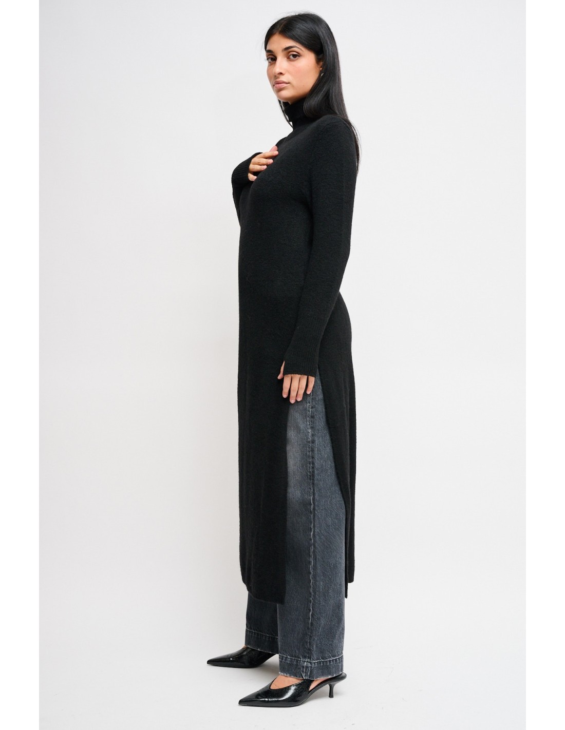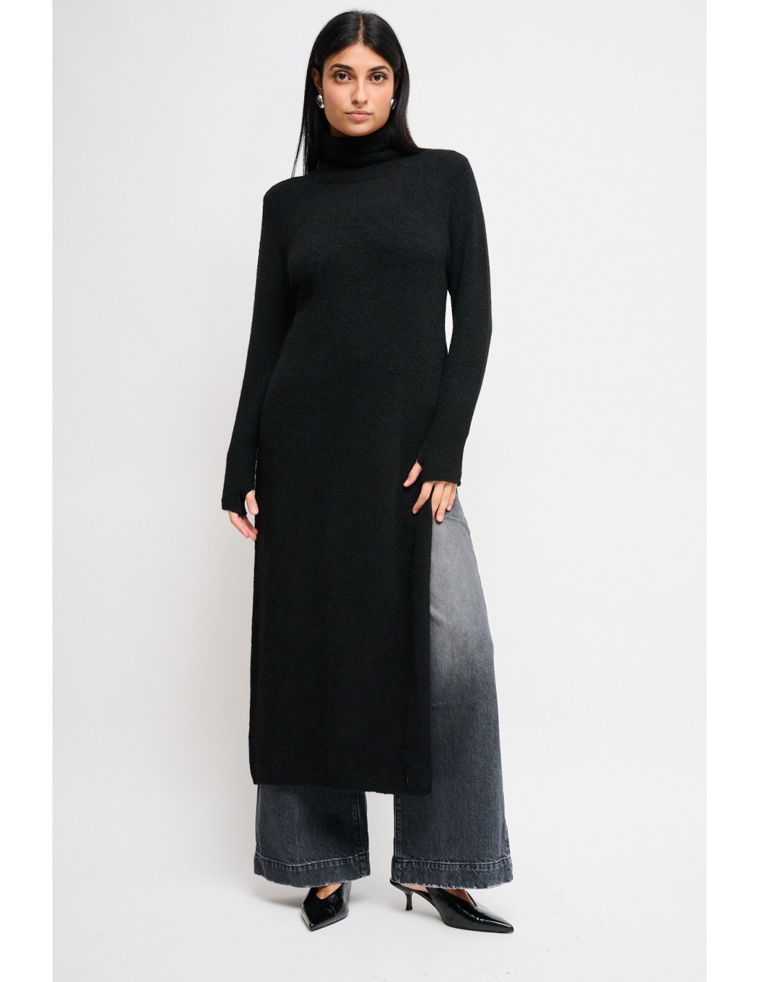 Esta camisola longa de gola alta apresenta-se como um versátil vestido midi de malha. Caracterizada por uma textura suave e um corte descontraído, possui uma profunda fenda lateral que acrescenta movimento e permite um layering moderno sobre calças largas. Uma peça tendência que une conforto e estilo contemporâneo.