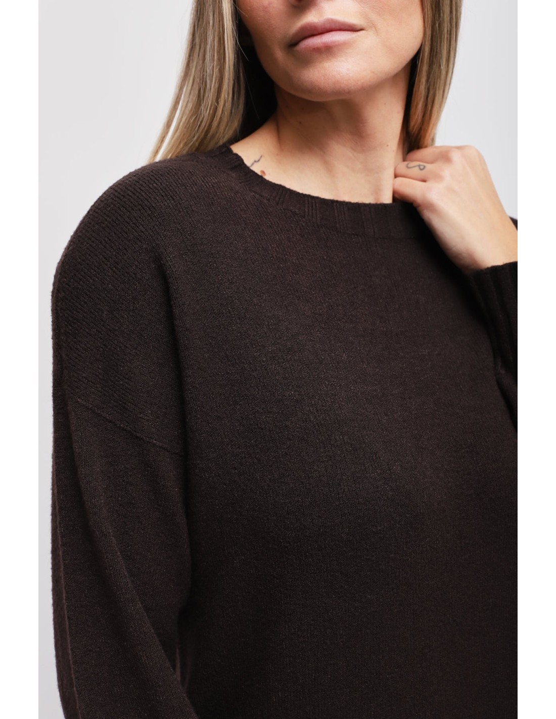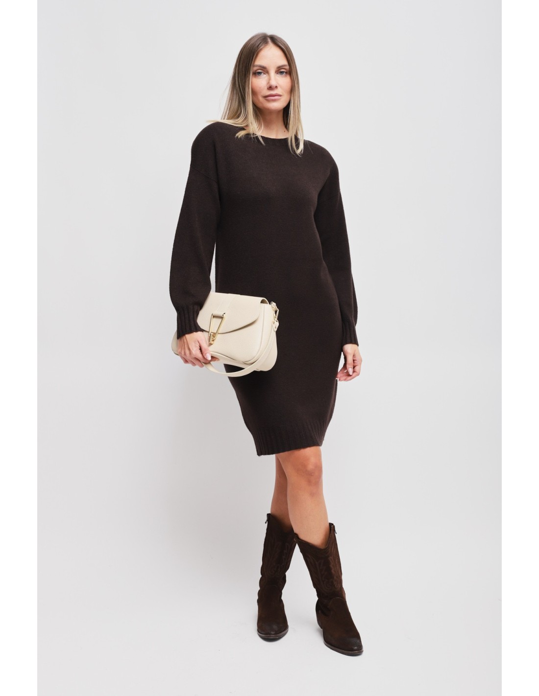 Maryley assina um vestido de malha de corte reto que acompanha a silhueta com conforto. Fio macio e envolvente, toque suave. Gola redonda limpa e mangas ligeiramente balão com punhos canelados; barra trabalhada para um ajuste que mantém a forma. Perfeita do dia à noite: escritório com blazer, dia a dia com botas.