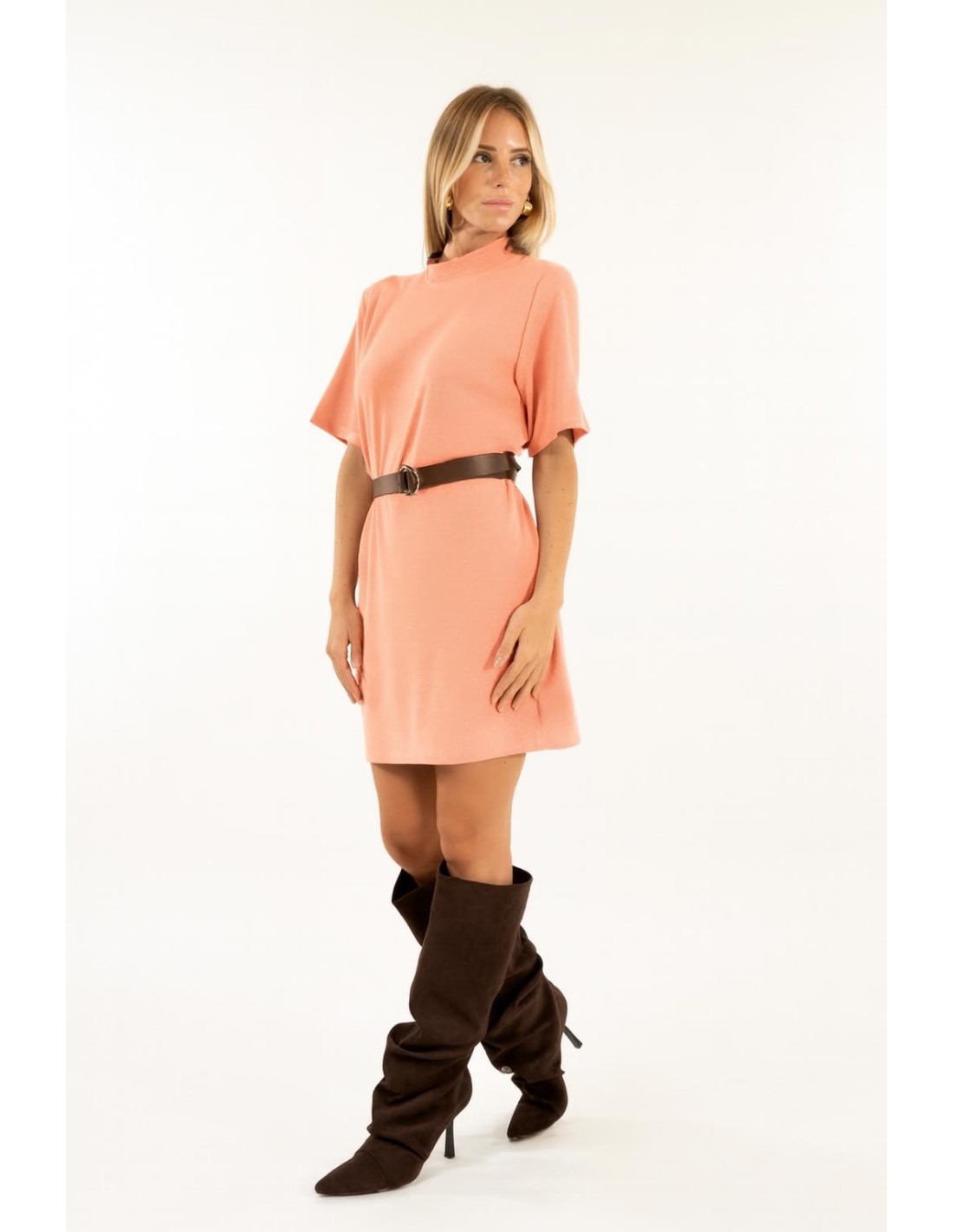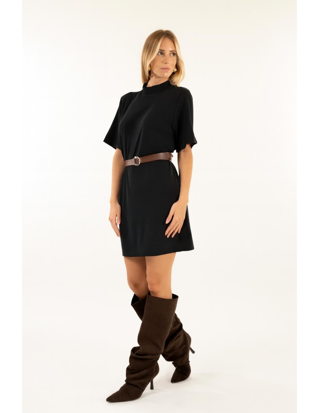 Kontatto assina um mini com uma linha suave e ligeiramente alargada que realça a silhueta com conforto. Camisola fluida com micro-lurex para uma textura luminosa. Gola alta suave, mangas largas e abertura em gota nas costas. Perfeito para o dia no escritório ou para um aperitivo à noite; adicione um cinto para definir a cintura.