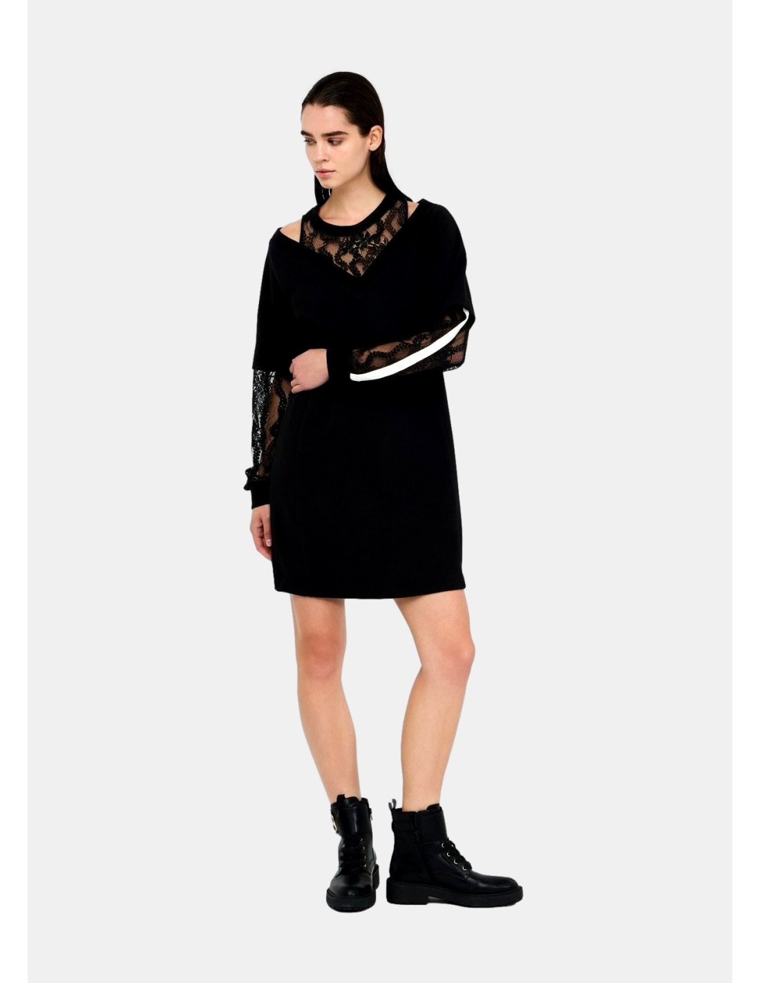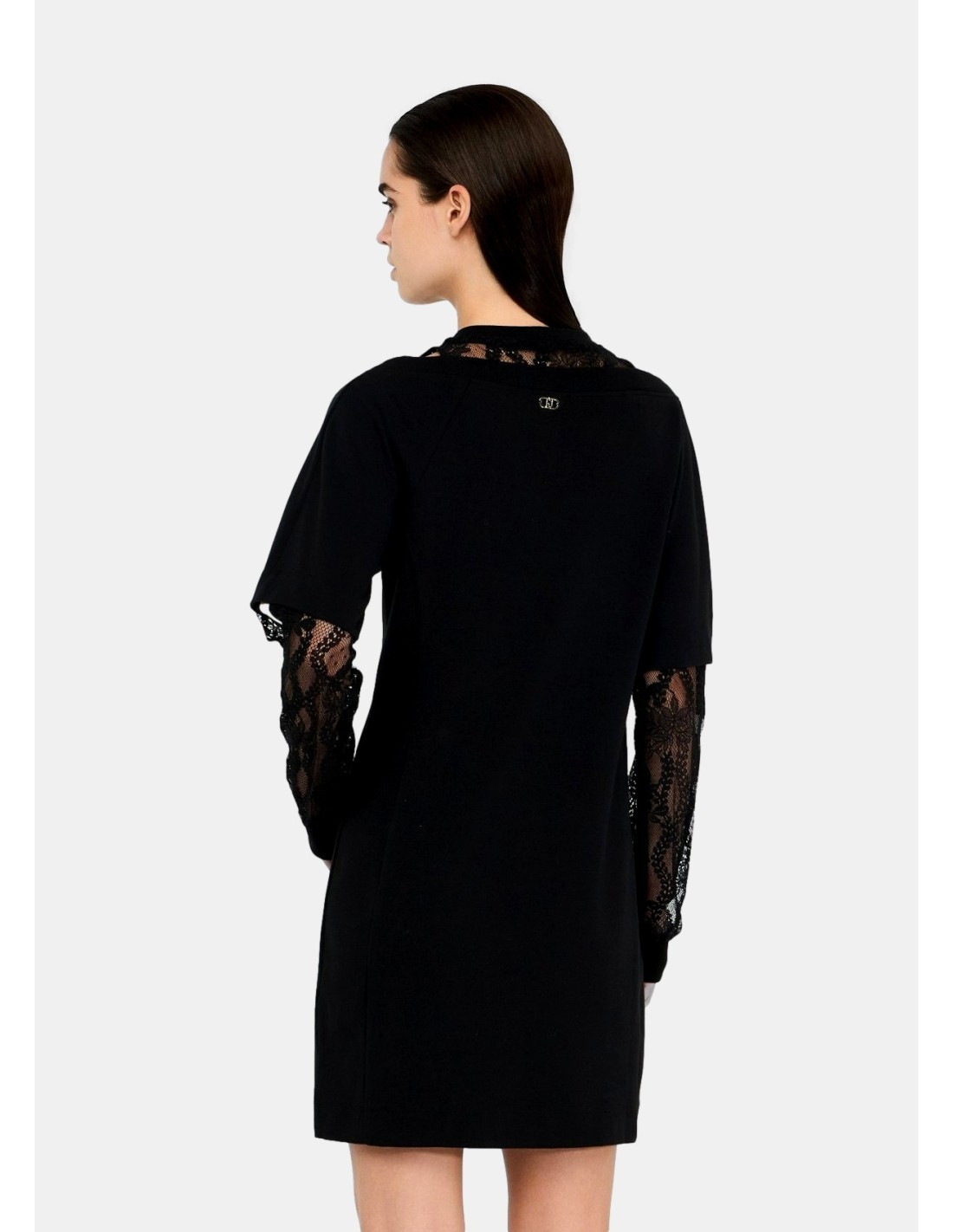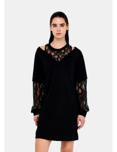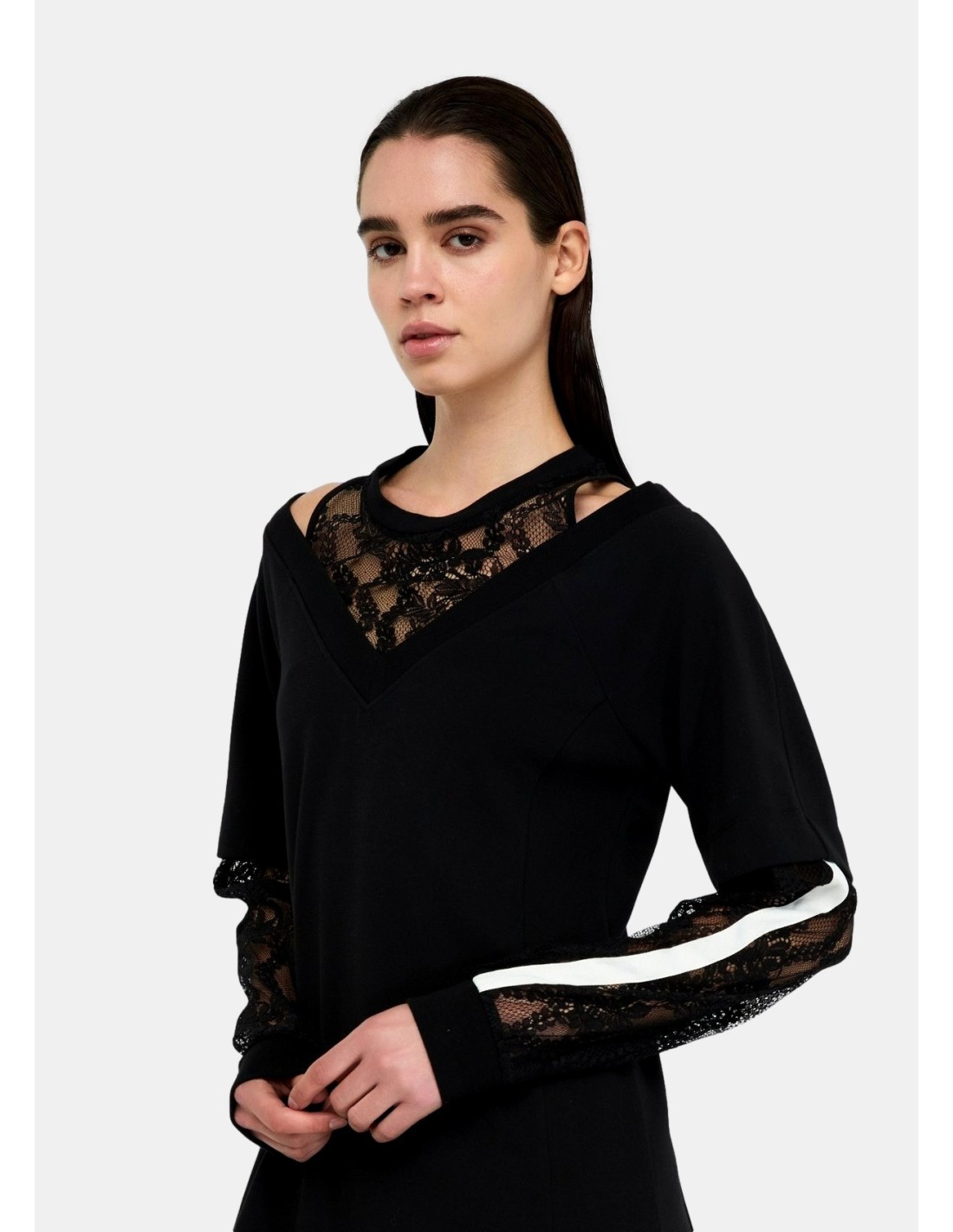 Vestido em malha de algodão stretch, detalhes em renda, motivo recortado, faixas laterais em contraste, decote redondo.