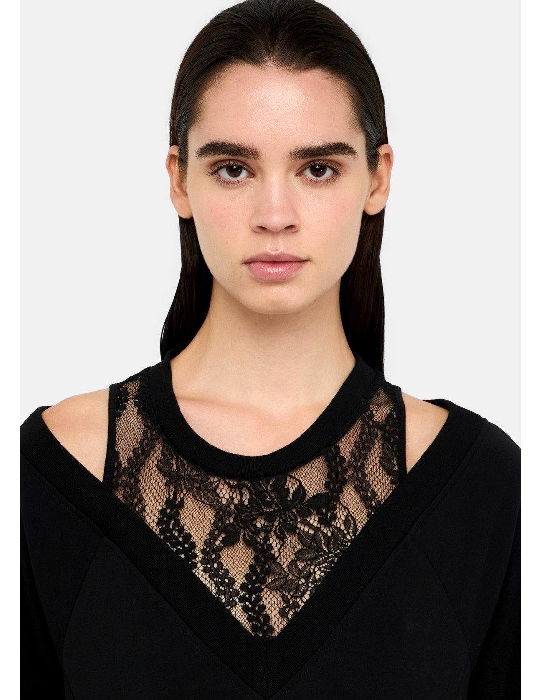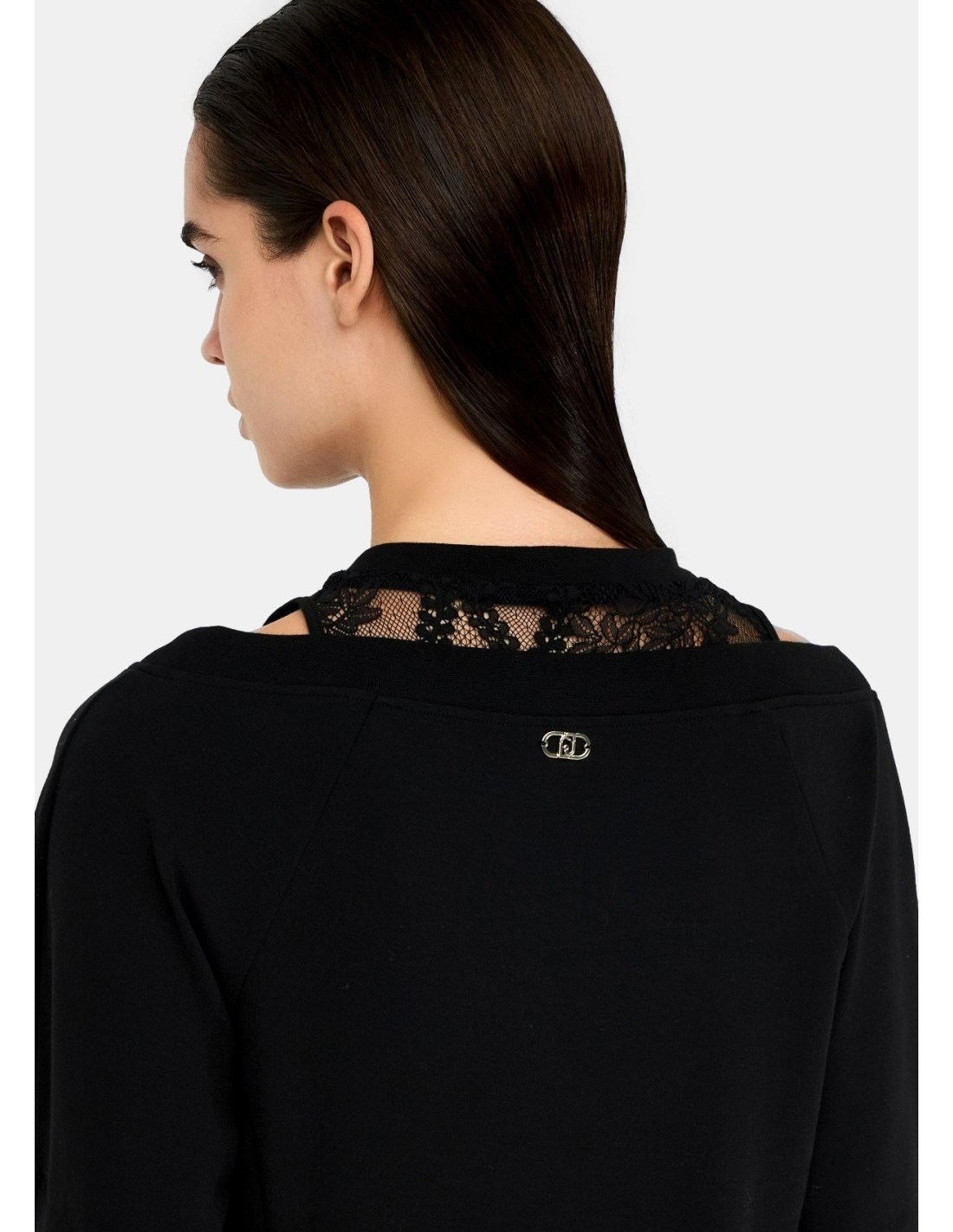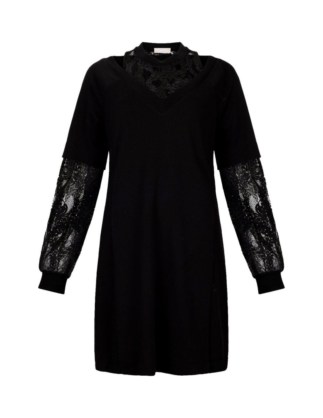 Vestido em malha de algodão stretch, detalhes em renda, motivo recortado, faixas laterais em contraste, decote redondo.