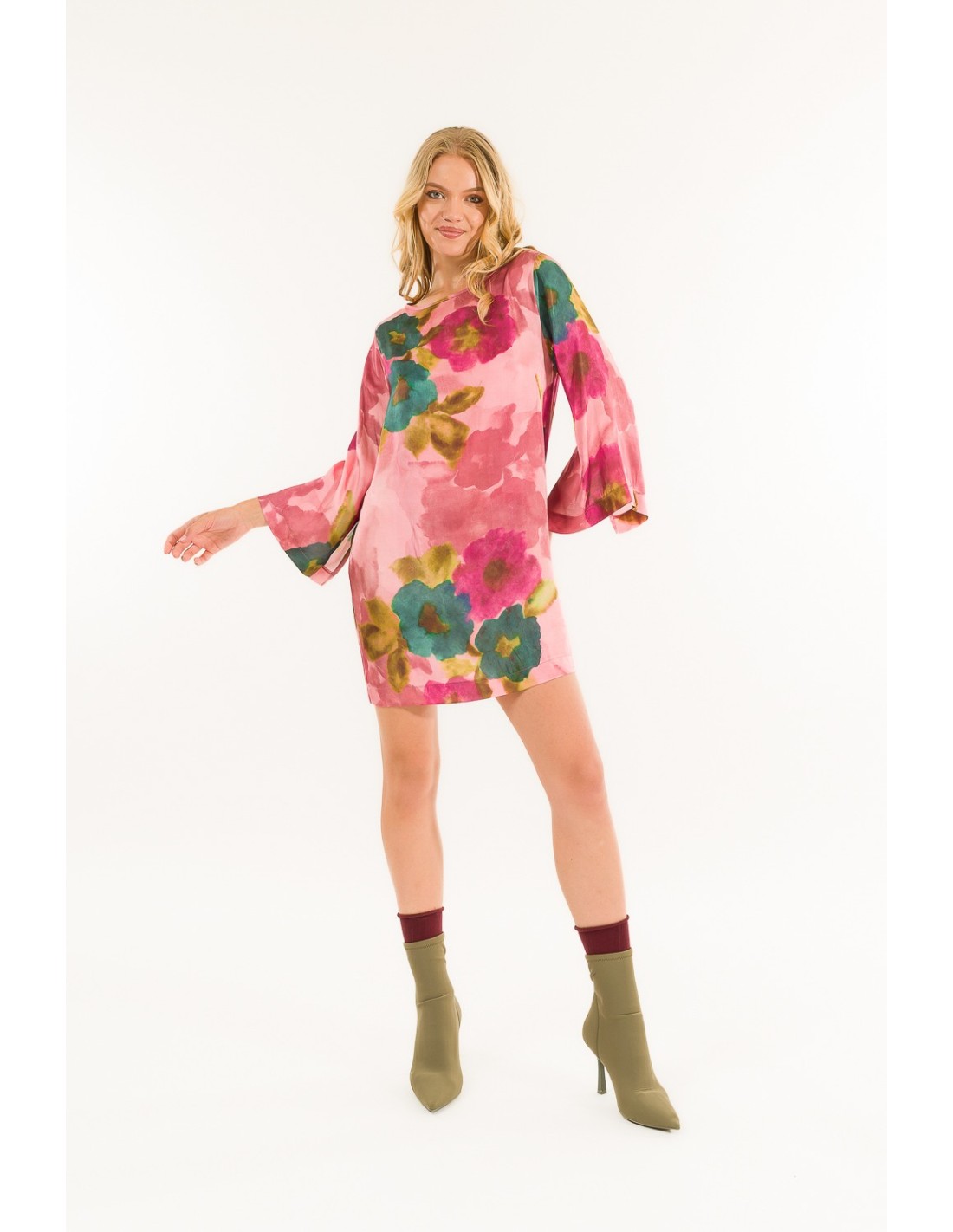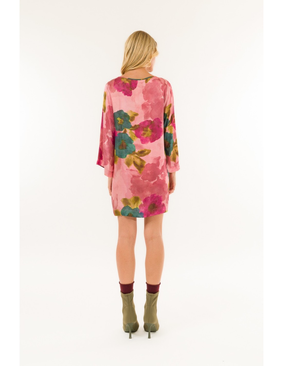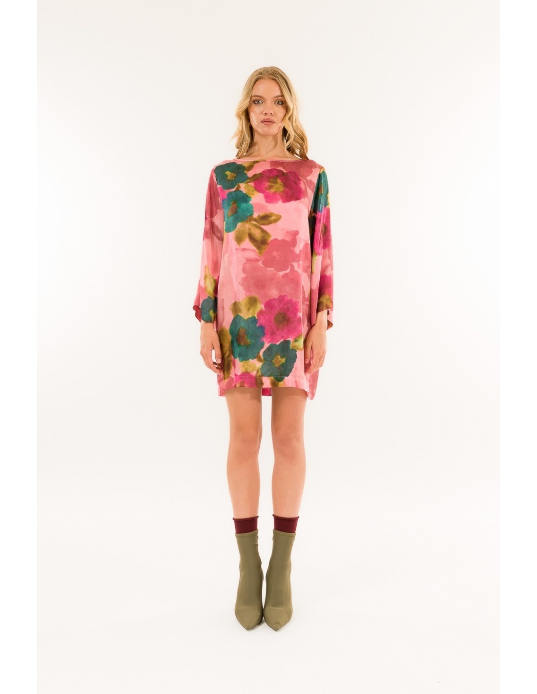 Kontatto interpreta a feminilidade com um mini de linhas suaves e fluidas, com efeito descontraído. Tecido fluido e sedoso, agradável à pele. Decote à barco e mangas largas a três quartos para um movimento natural. Versátil: perfeito com botas para o escritório, com sandálias para festas e aperitivos.