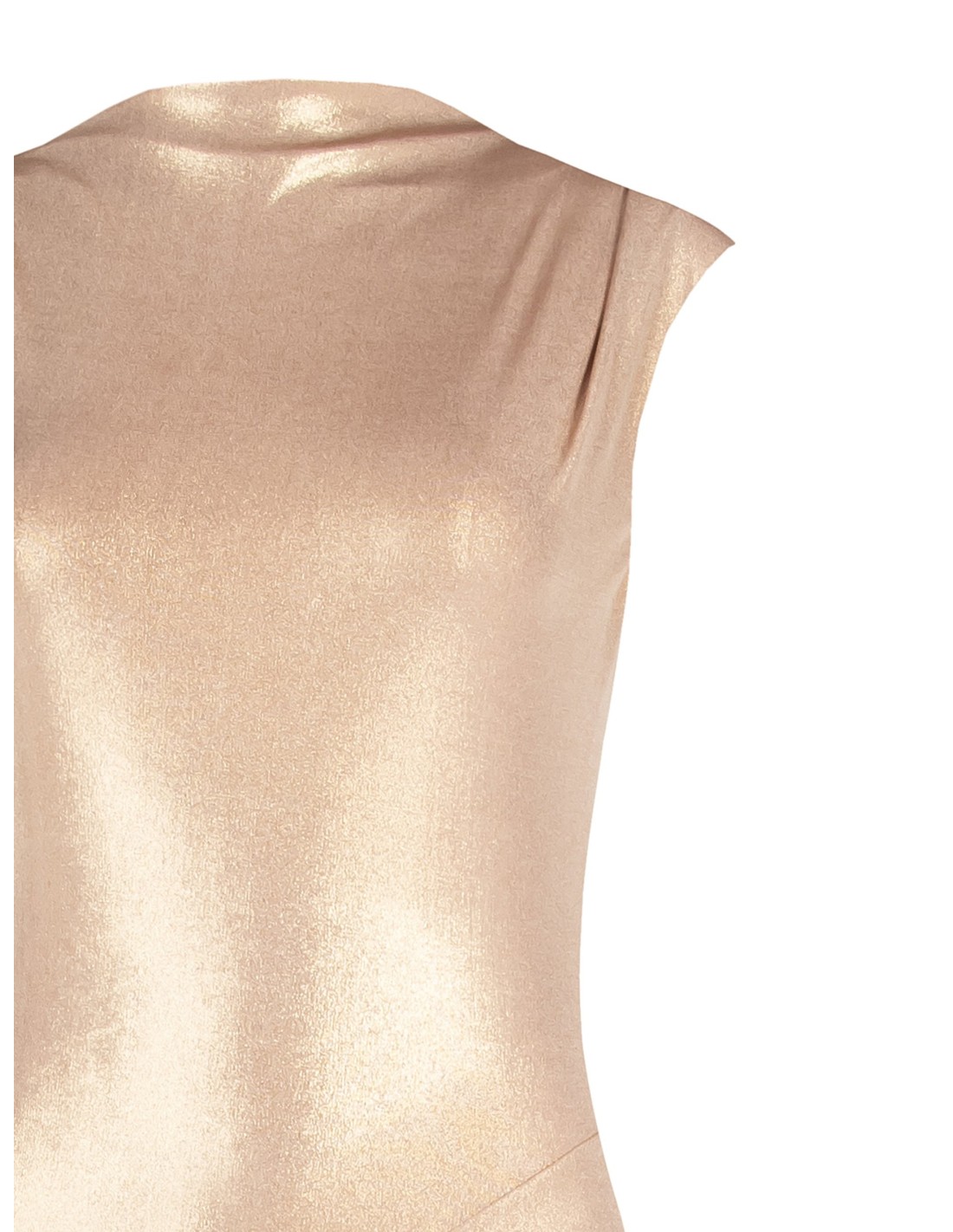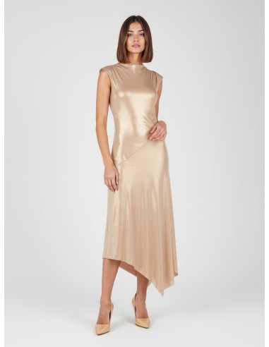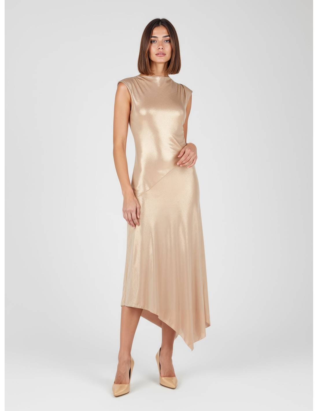 Rinascimento assina um longo de linha fluida que valoriza a silhueta. Malha laminada macia e fluida, agradável na pele. Ombros ligeiramente estruturados e bainha assimétrica que alonga. Gola alta com pregas discretas. Perfeito para festas e cerimónias, também adequado para jantares especiais.