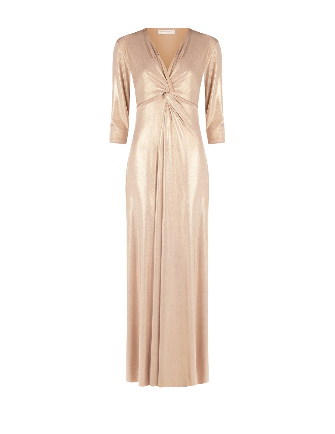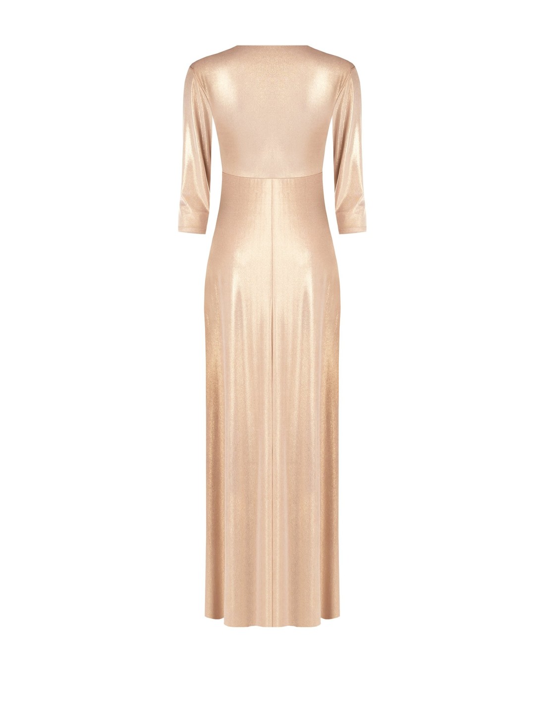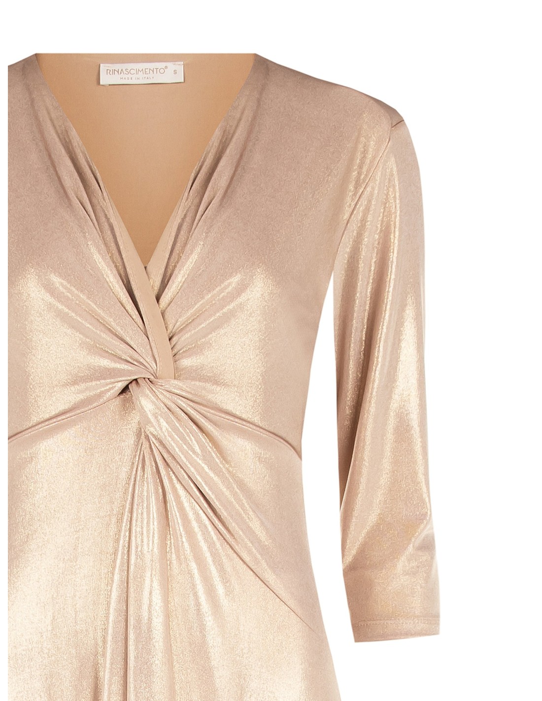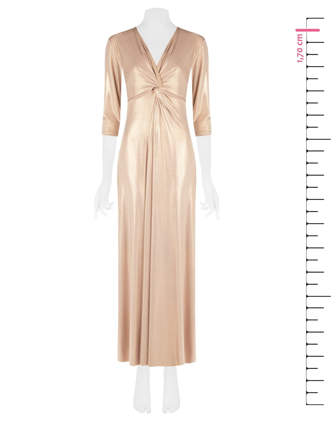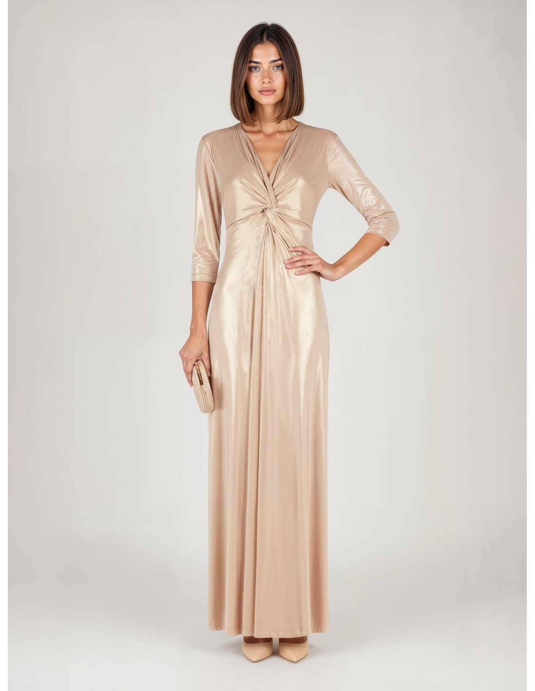 Rinascimento assina um longo de linha suave e feminina: malha laminada fluida que envolve sem marcar, com decote em V drapeado e nó central que alonga a silhueta. Mangas 3/4 e queda sinuosa para conforto e movimento. Perfeito para cerimónias, festas e noites especiais.