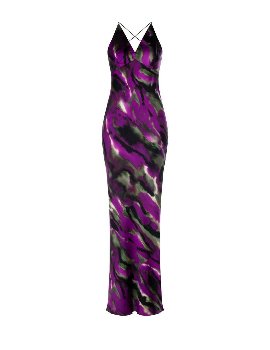 Vestido longo Rinascimento, corte fluido que alonga a silhueta. Cetim brilhante e fluido com estampado artístico. Decote em V com alças duplas cruzadas e corte abaixo do busto para realçar a cintura. Perfeito para cocktails, festas e noites especiais: conforto leve, efeito wow sem esforço.