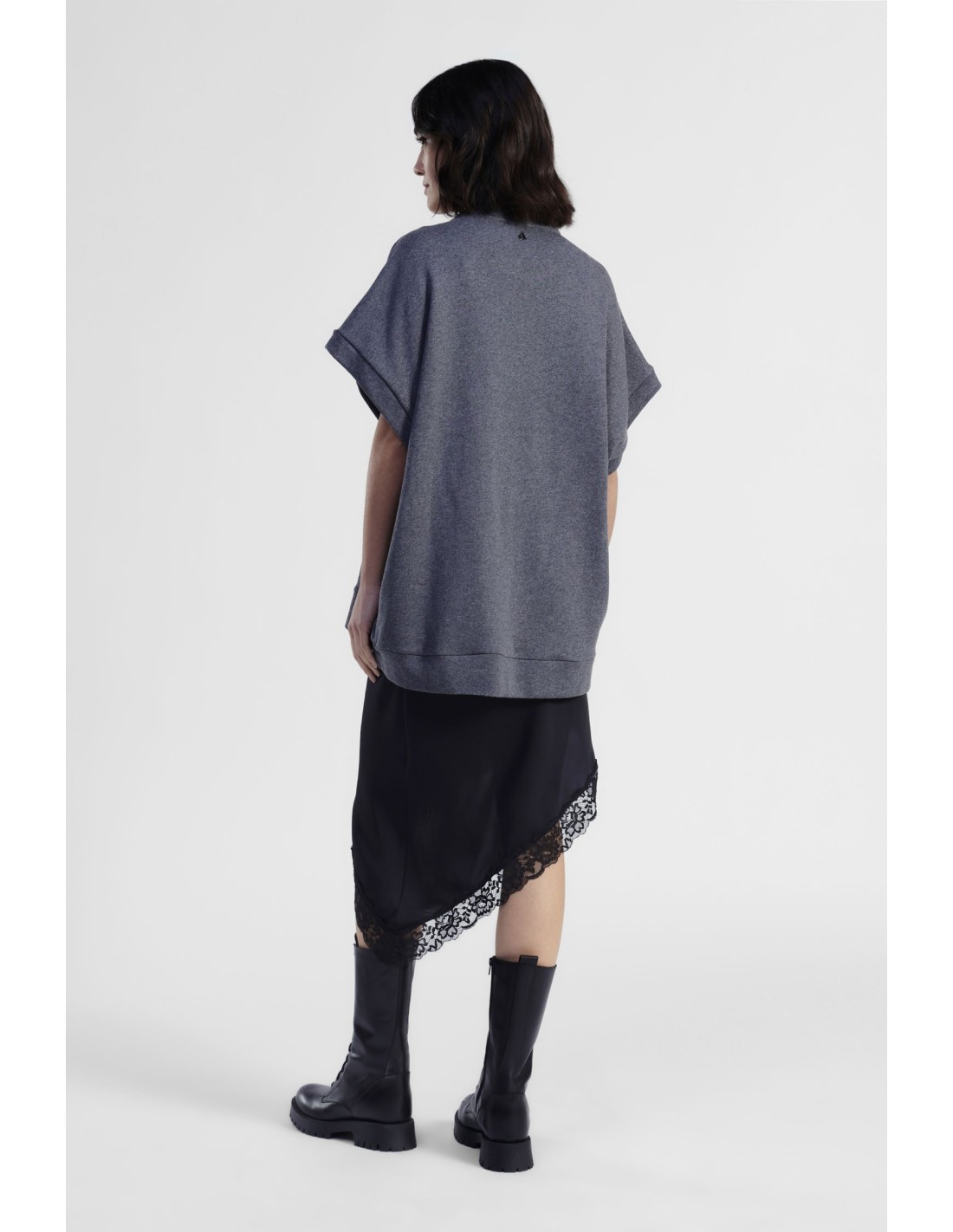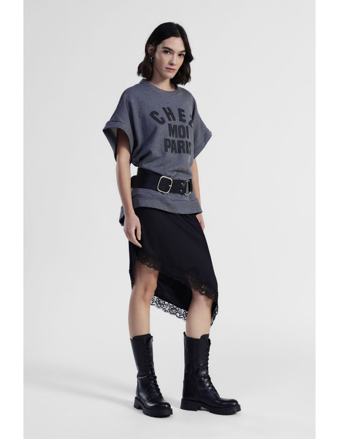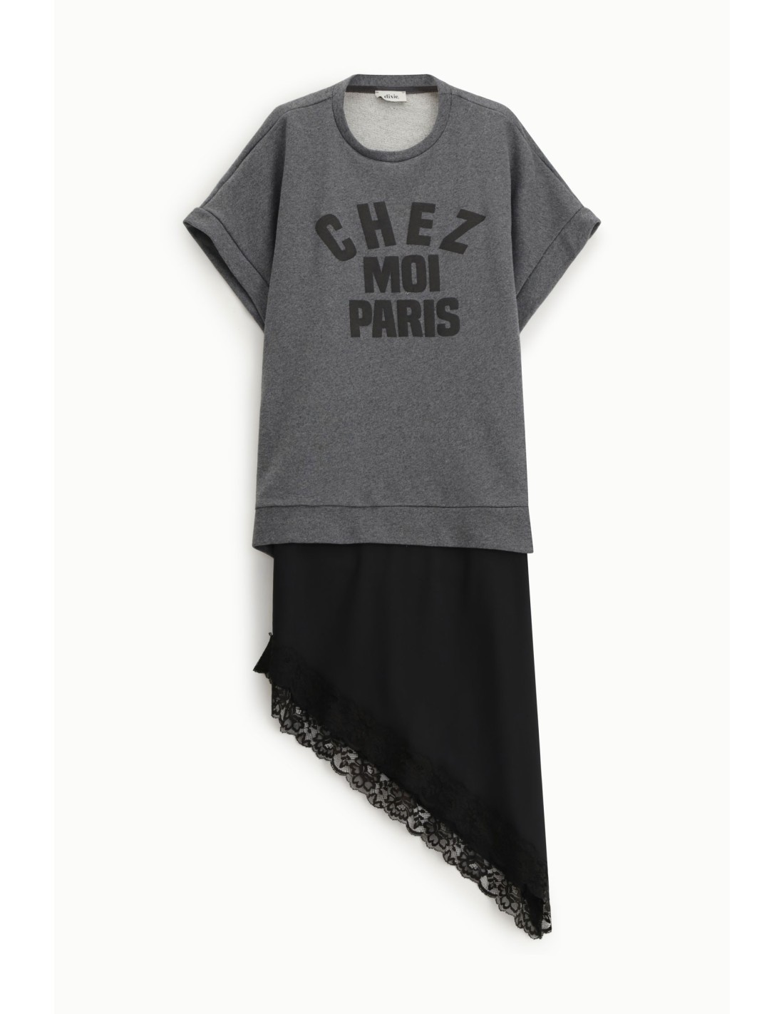 Design original com parte superior estilo t-shirt, estampa visível na frente e mangas curtas. A saia cai assimétrica, acabada com uma bainha em renda que acrescenta um toque romântico. Perfeito para quem procura praticidade e detalhes particulares para usar todos os dias.