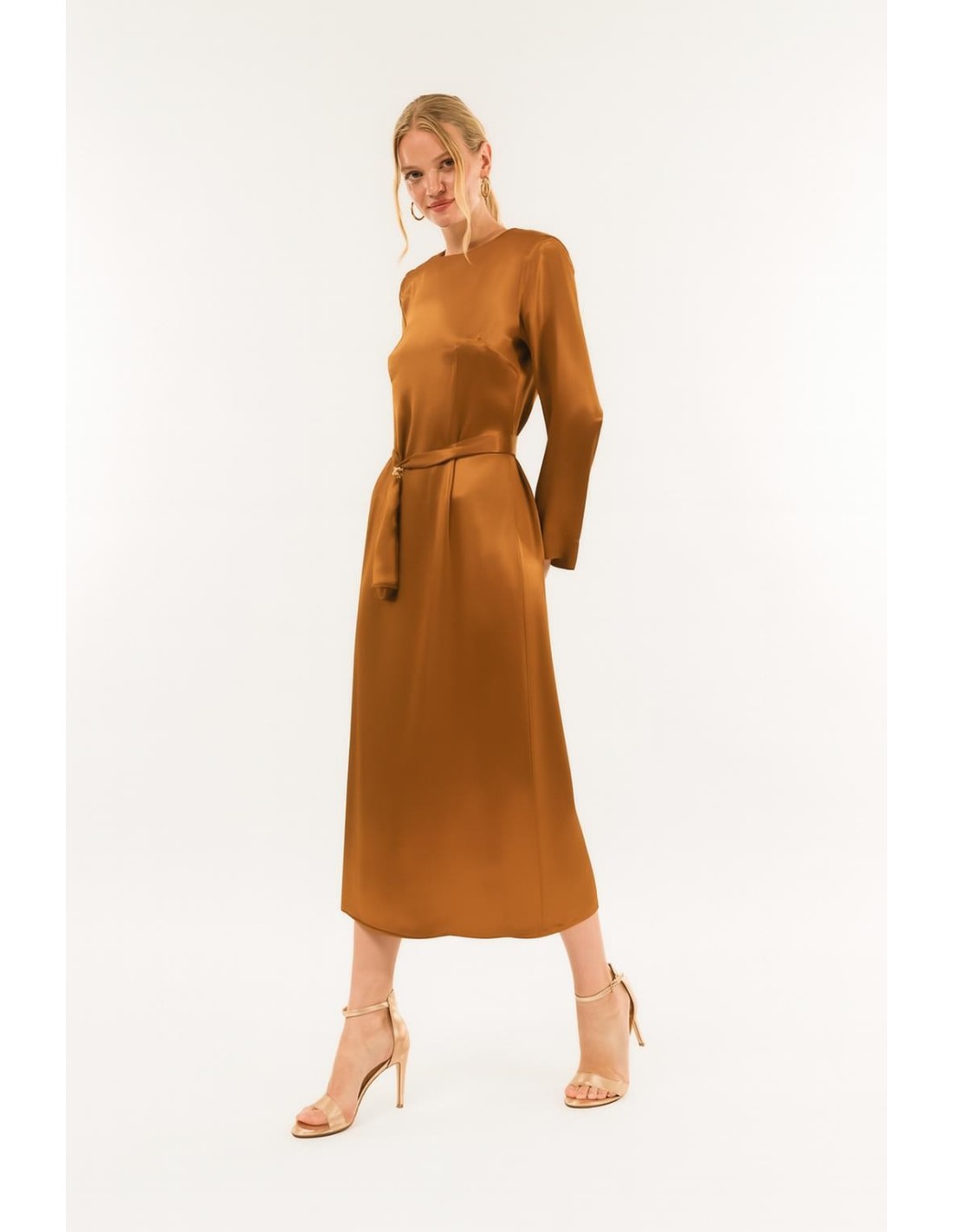 Requintado e envolvente, este vestido midi acaricia a silhueta com um brilho delicado. O laço na cintura confere um toque de feminilidade intemporal: perfeito para se destacar com elegância em qualquer ocasião.