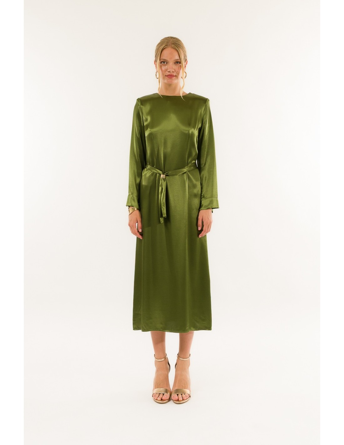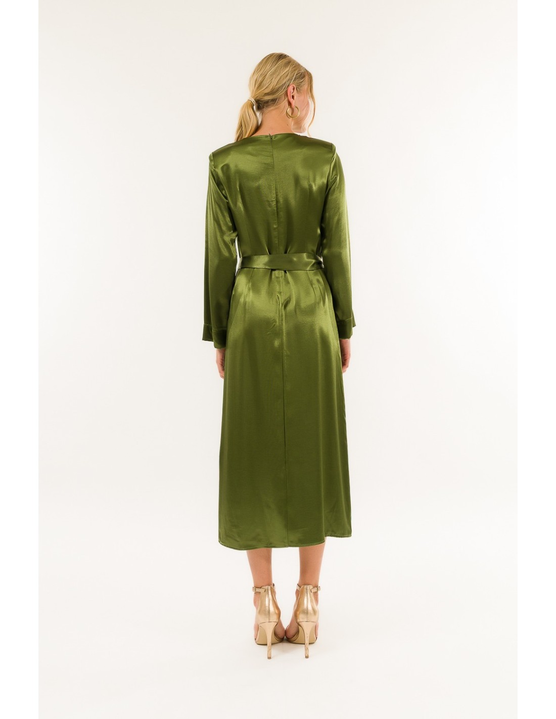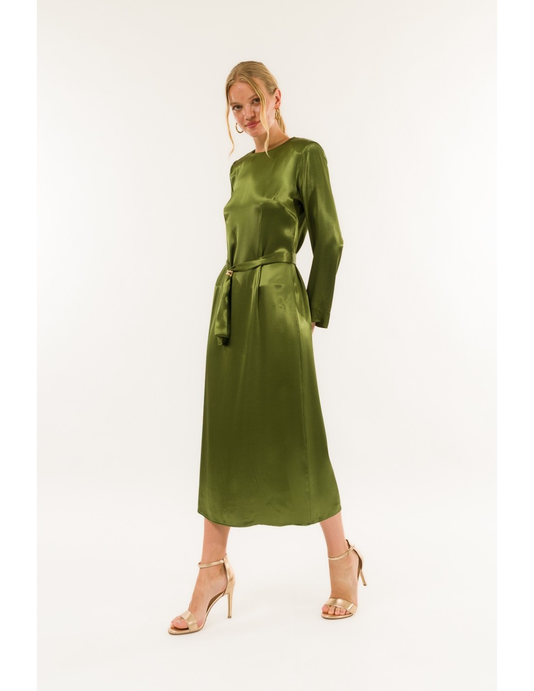 Requintado e envolvente, este vestido midi acaricia a silhueta com um brilho delicado. O laço na cintura confere um toque de feminilidade intemporal: perfeito para se destacar com elegância em qualquer ocasião.