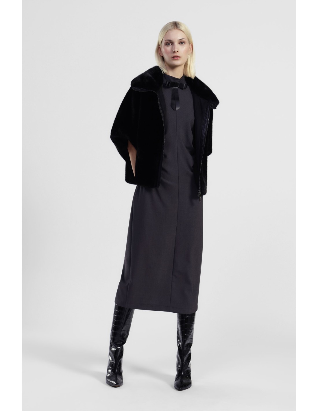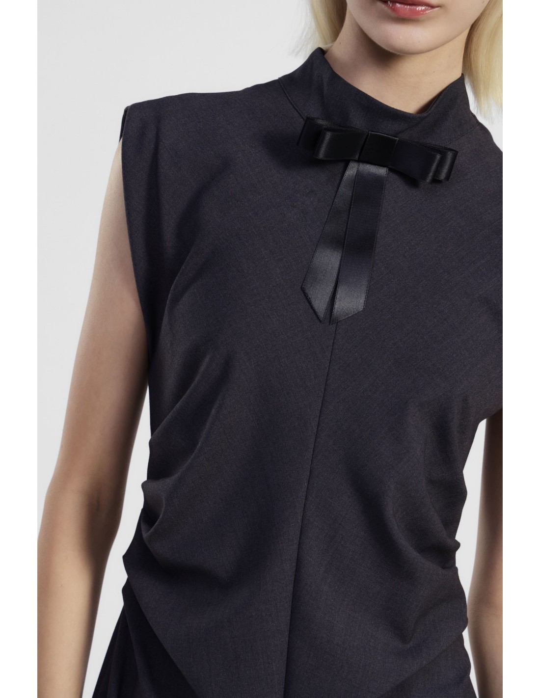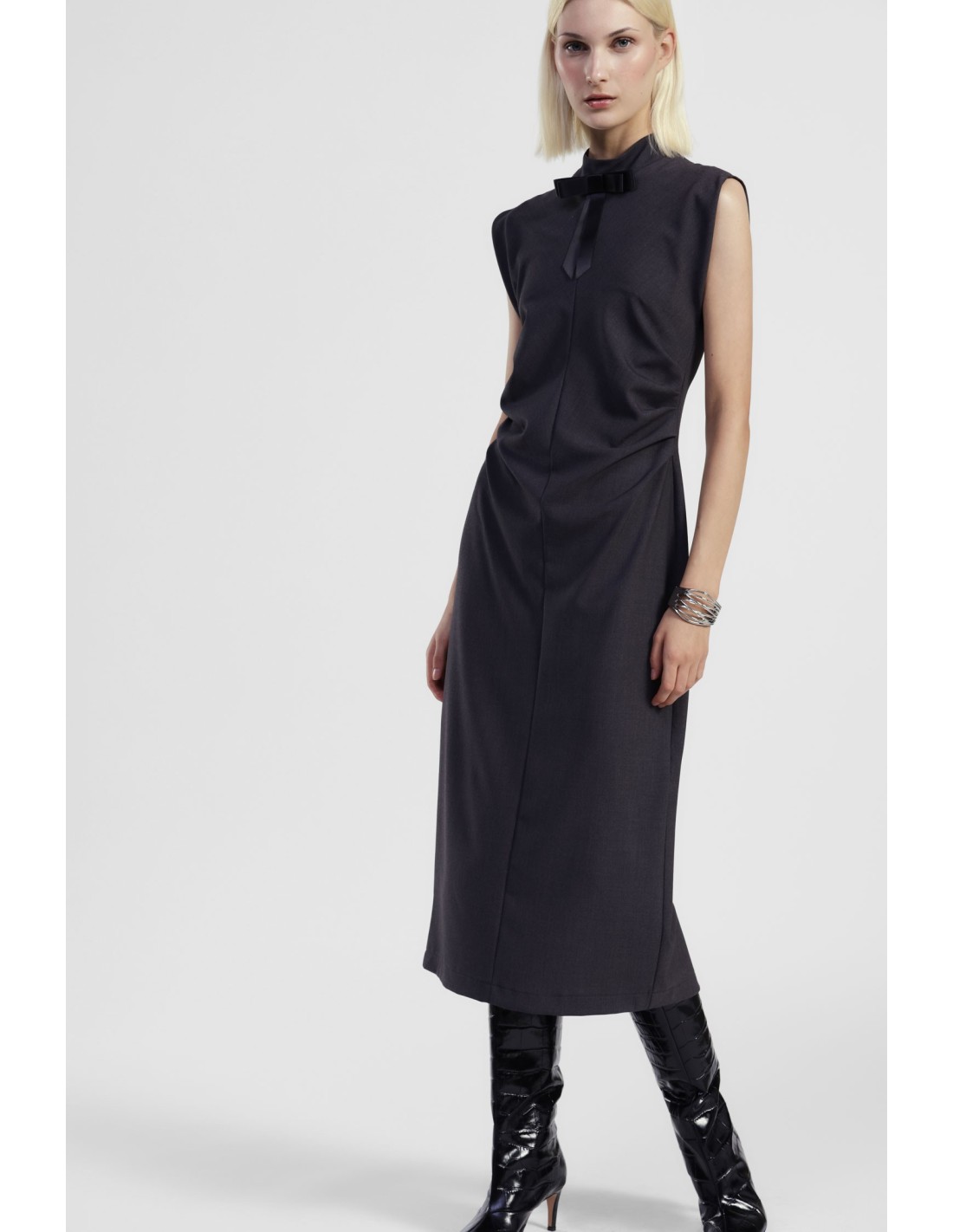 Linhas simples e uma silhueta direita conjugam-se neste vestido midi sem mangas, adornado com um elegante laço no pescoço. As pregas laterais realçam a figura e dão um toque distinto, perfeito tanto para o dia a dia como para ocasiões especiais. Use-o e sinta-se à vontade, requintado e original.