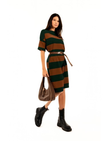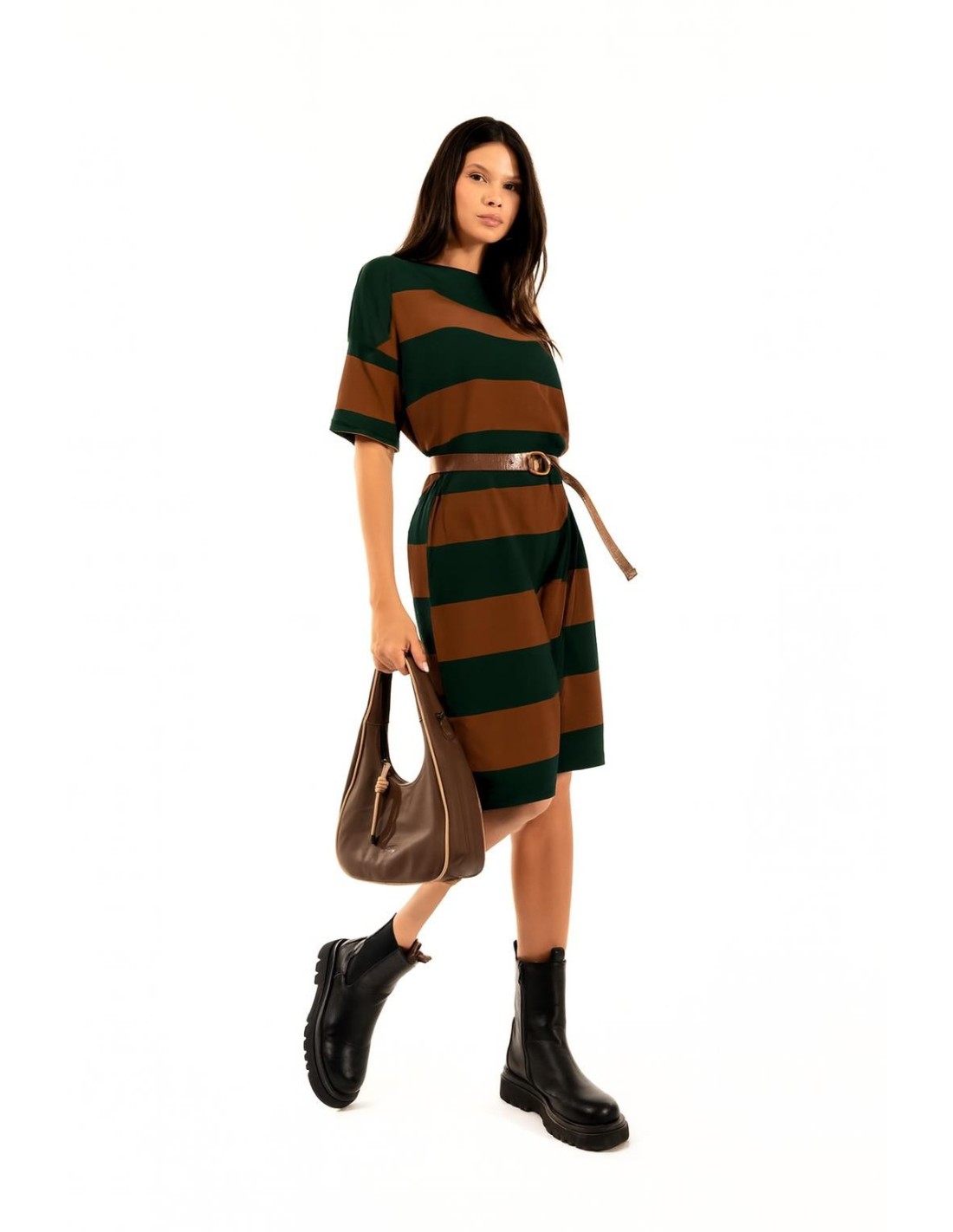 Vestido midi de corte suave Kontatto com cinto que realça a cintura. Malha fluida e leve, agradável para a pele. Gola redonda, mangas largas na altura do cotovelo, riscas contrastantes que adelgaçam a silhueta. Perfeito do escritório ao lazer: basta mudar de sapatos para um look casual ou mais citadino-chique.