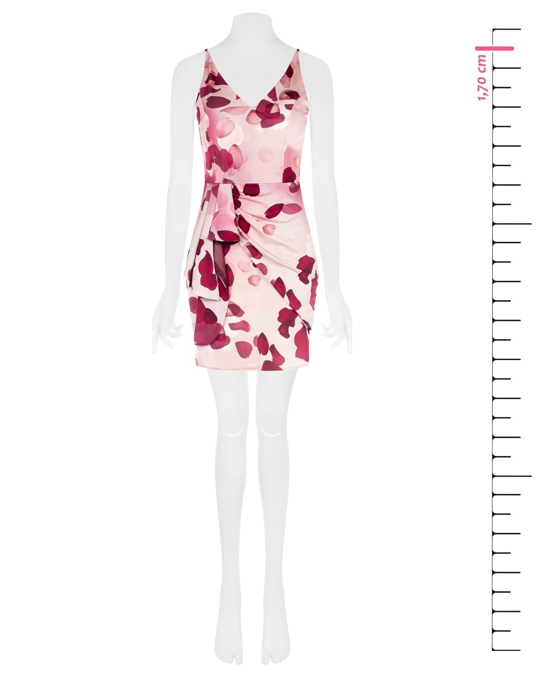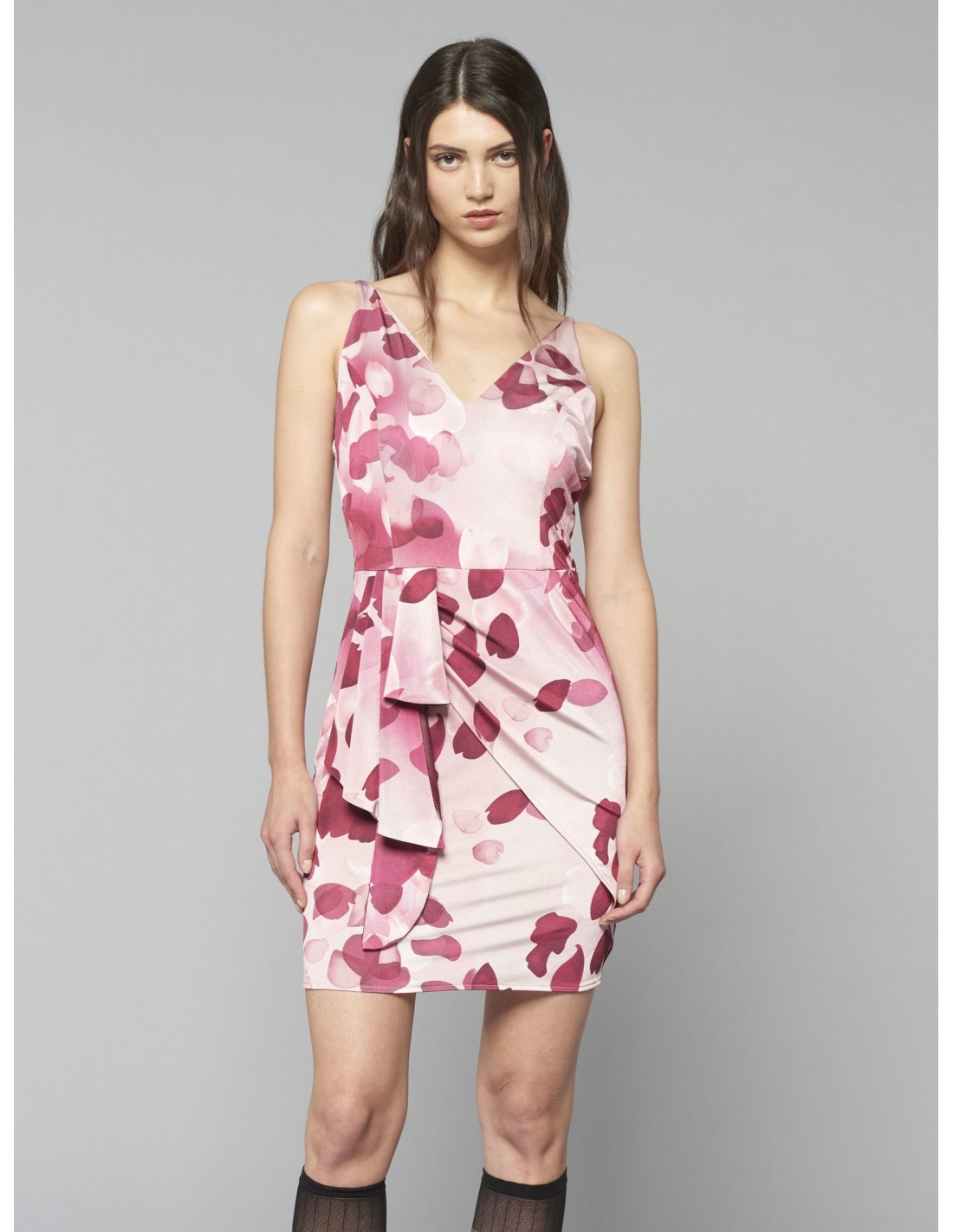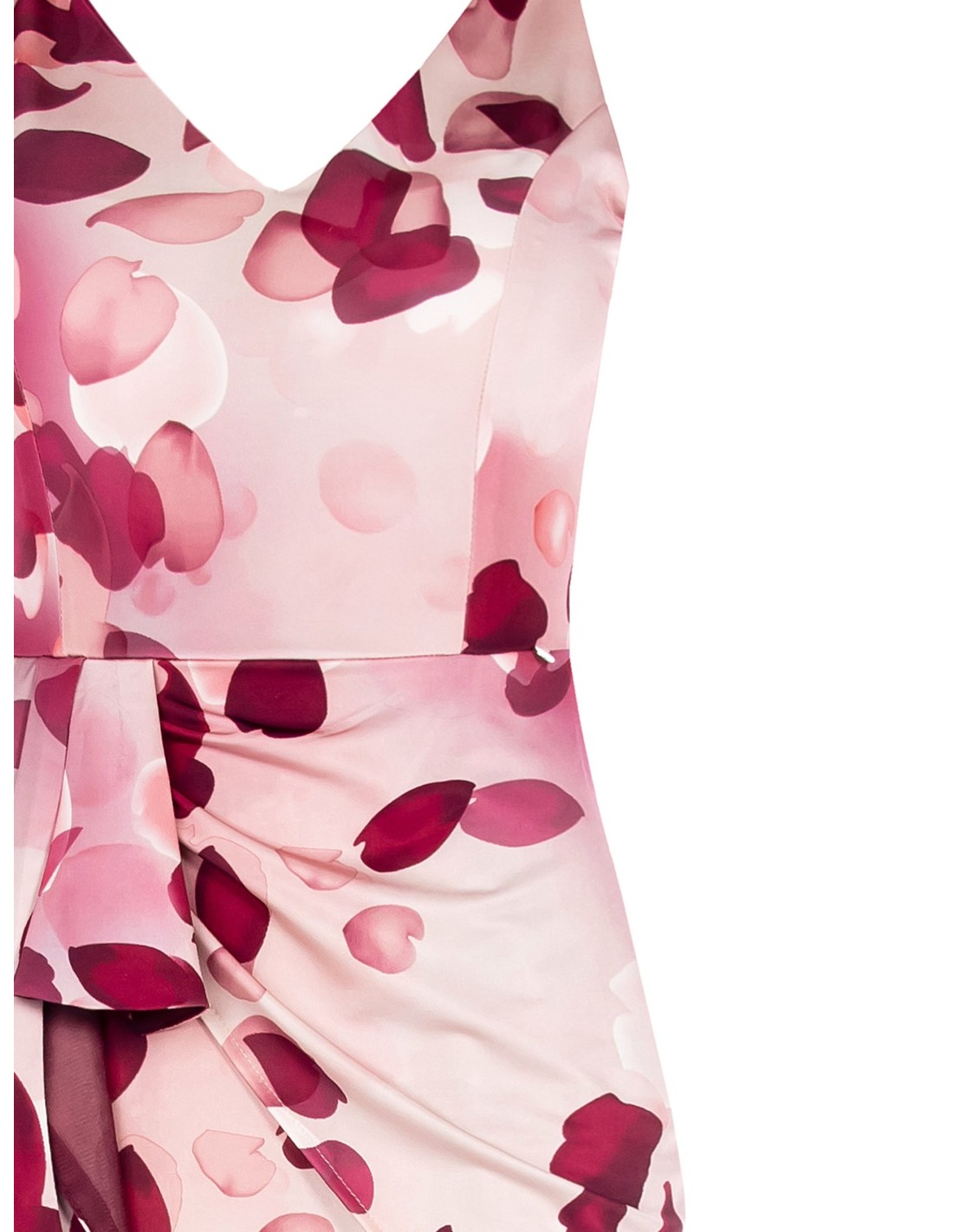 Curto e envolvente, valoriza a silhueta com corte justo e saia drapeada. Tecido acetinado com estampado de pétalas, macio ao toque e confortável. Decote em V e nó lateral com painel caído definem a cintura. Perfeito para cocktails, festas e jantares, combina com blazer e sandálias.