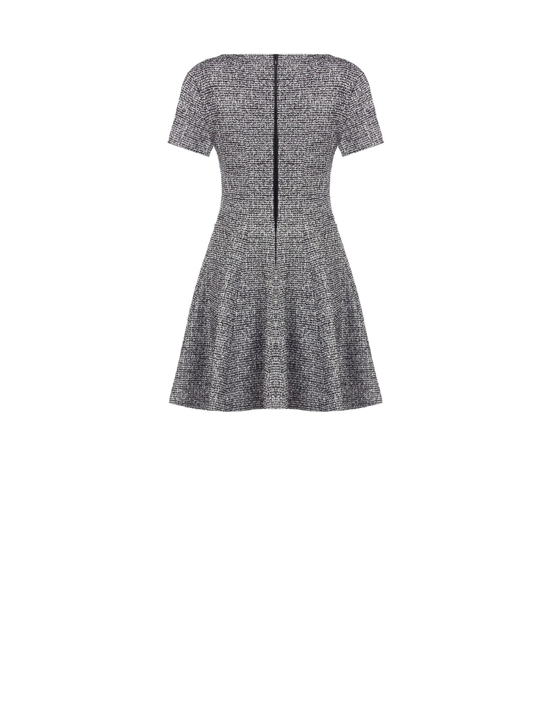 Corte evasé com corpete justo que valoriza a cintura. Tecido com efeito tweed macio, agradável na pele e com boa resistência. Decote barco e cintura ótica com franjas aplicadas; fecho invisível nas costas. Perfeito do escritório ao aperitivo, combina com blazer ou botas para uma elegância descontraída.