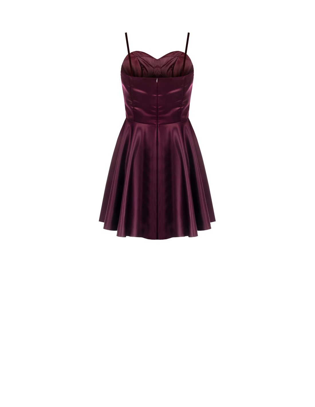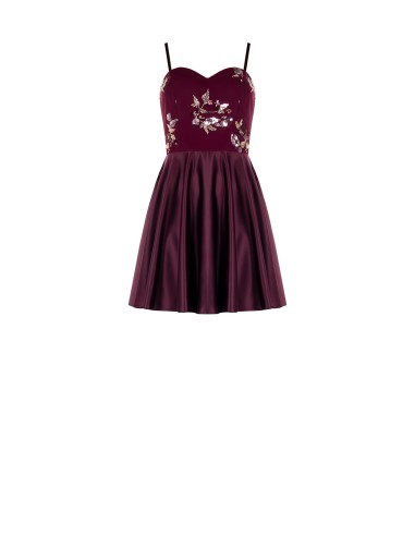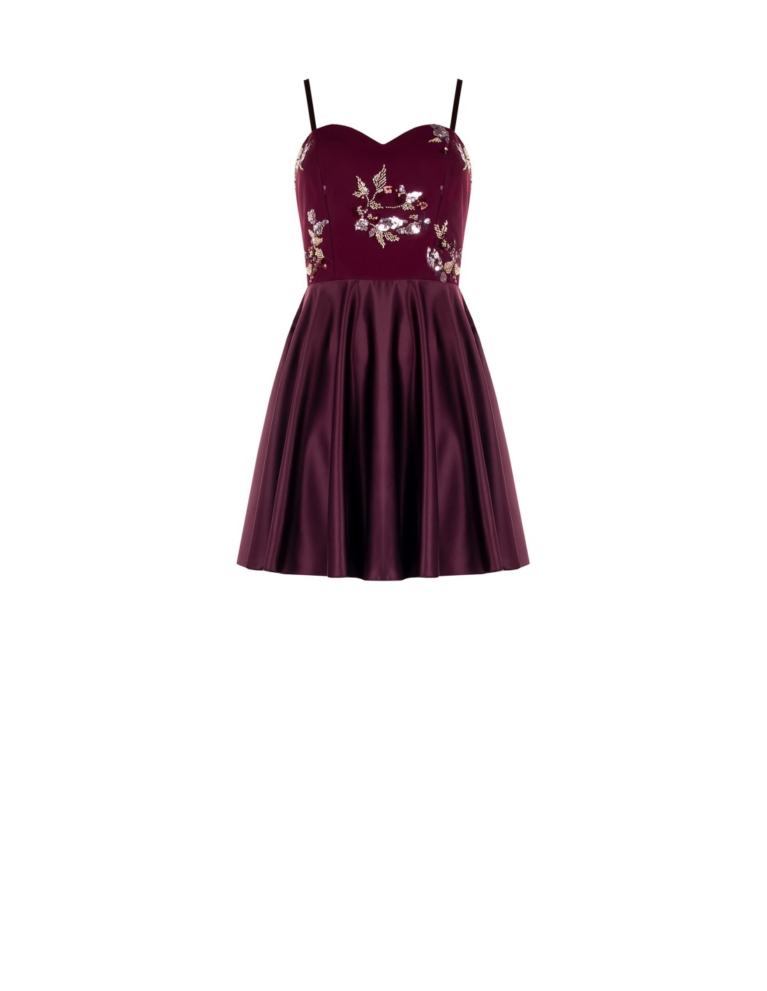 Mini com corte franzido que adelgaça a silhueta: corpete justo e saia de cetim fluida. Tecidos mistos com brilho sedoso e bordado de lantejoulas no corpete. Decote em forma de coração e alças finas ajustáveis; fecho invisível nas costas. Perfeito para festas e cerimónias, confortável para usar toda a noite.