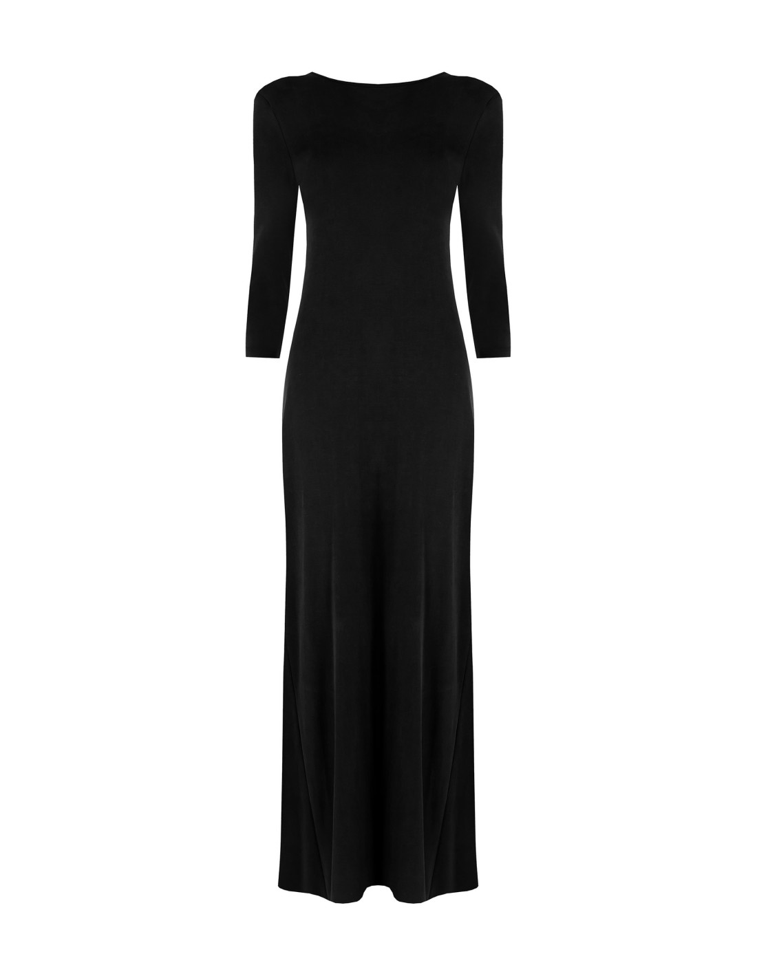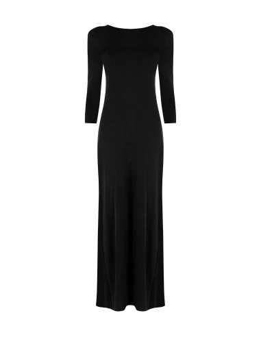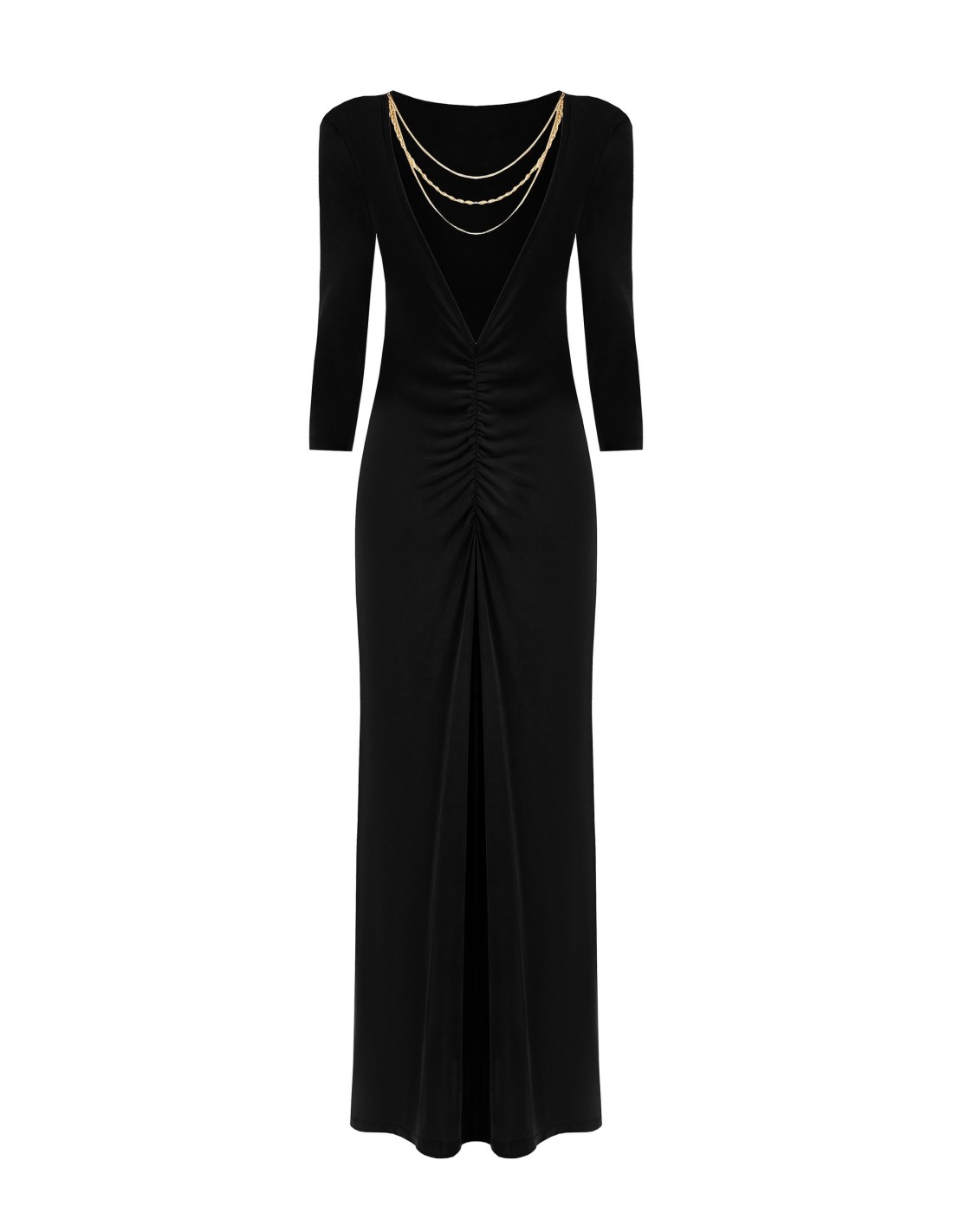 Rinascimento assina um vestido comprido fluido de manga 3/4 com um corte justo mas confortável. A camisola macia e elástica realça a silhueta. Na frente, decote em V profundo com correntes de jóias e folho central que adelgaça. Perfeito para festas e jantares especiais; com um blazer, ideal também para o escritório à noite.