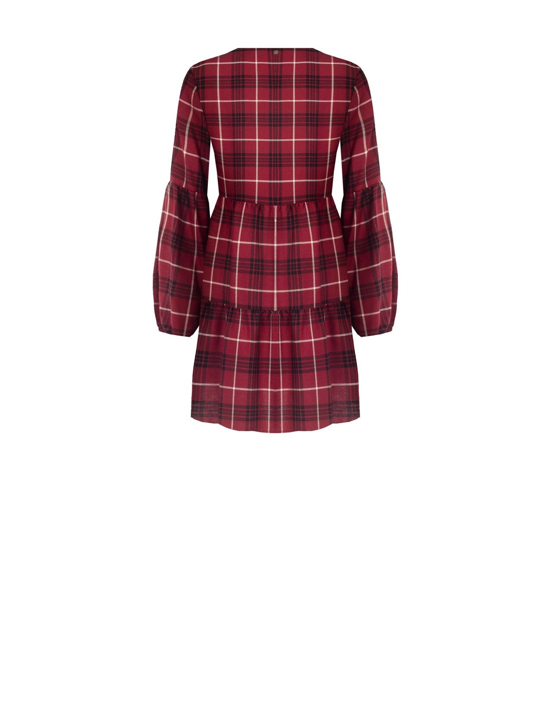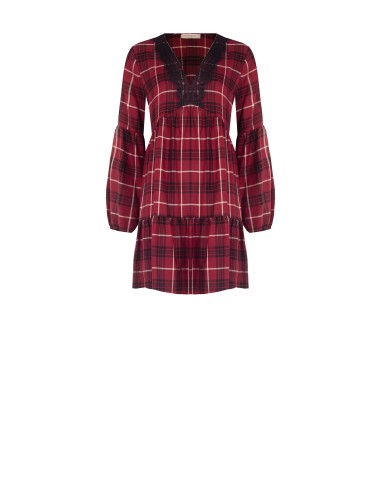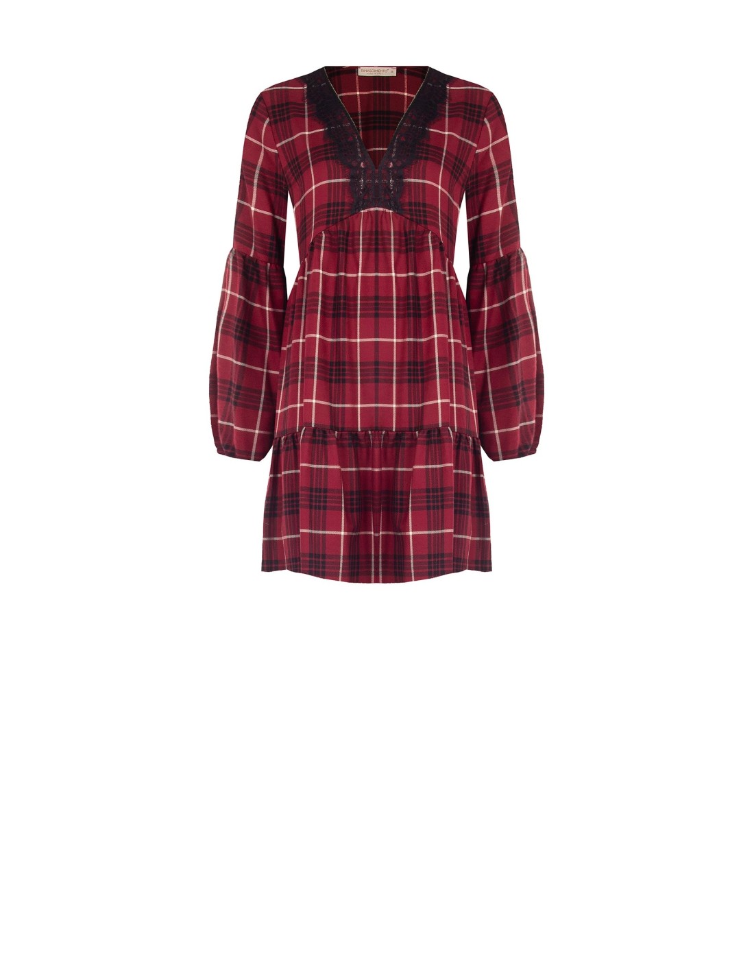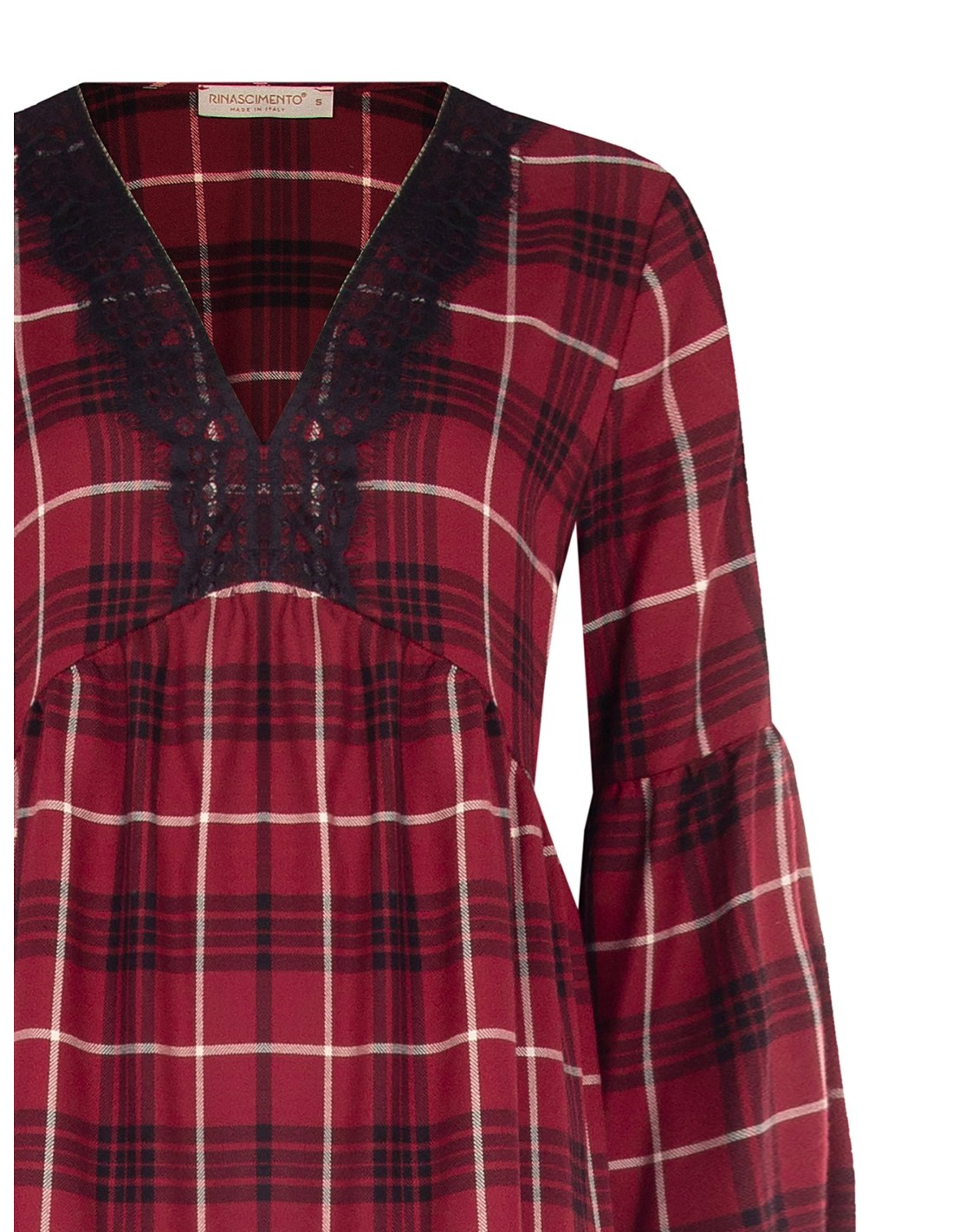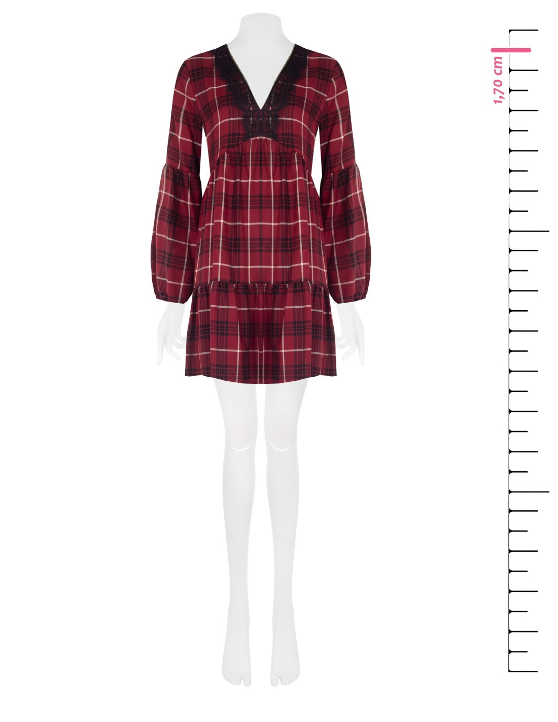 Minivestido fluido com um corte descontraído que acaricia a silhueta sem a marcar. Tecido microtexturizado macio com padrão axadrezado e mão sedosa. Decote em V com acabamento em renda e mangas balão com punho elástico: pormenores que realçam o decote e acrescentam movimento. Perfeito para o dia a dia e para aperitivos. Rinascimento.