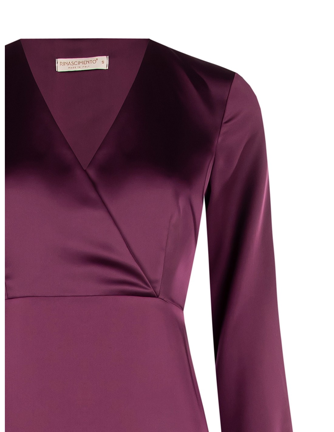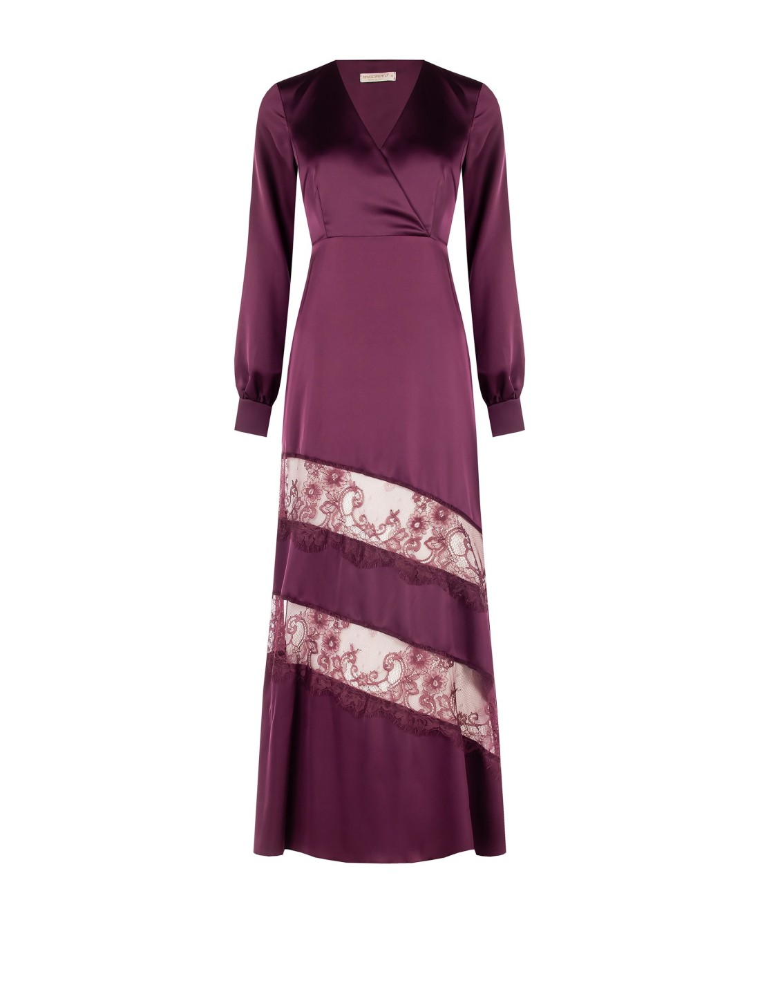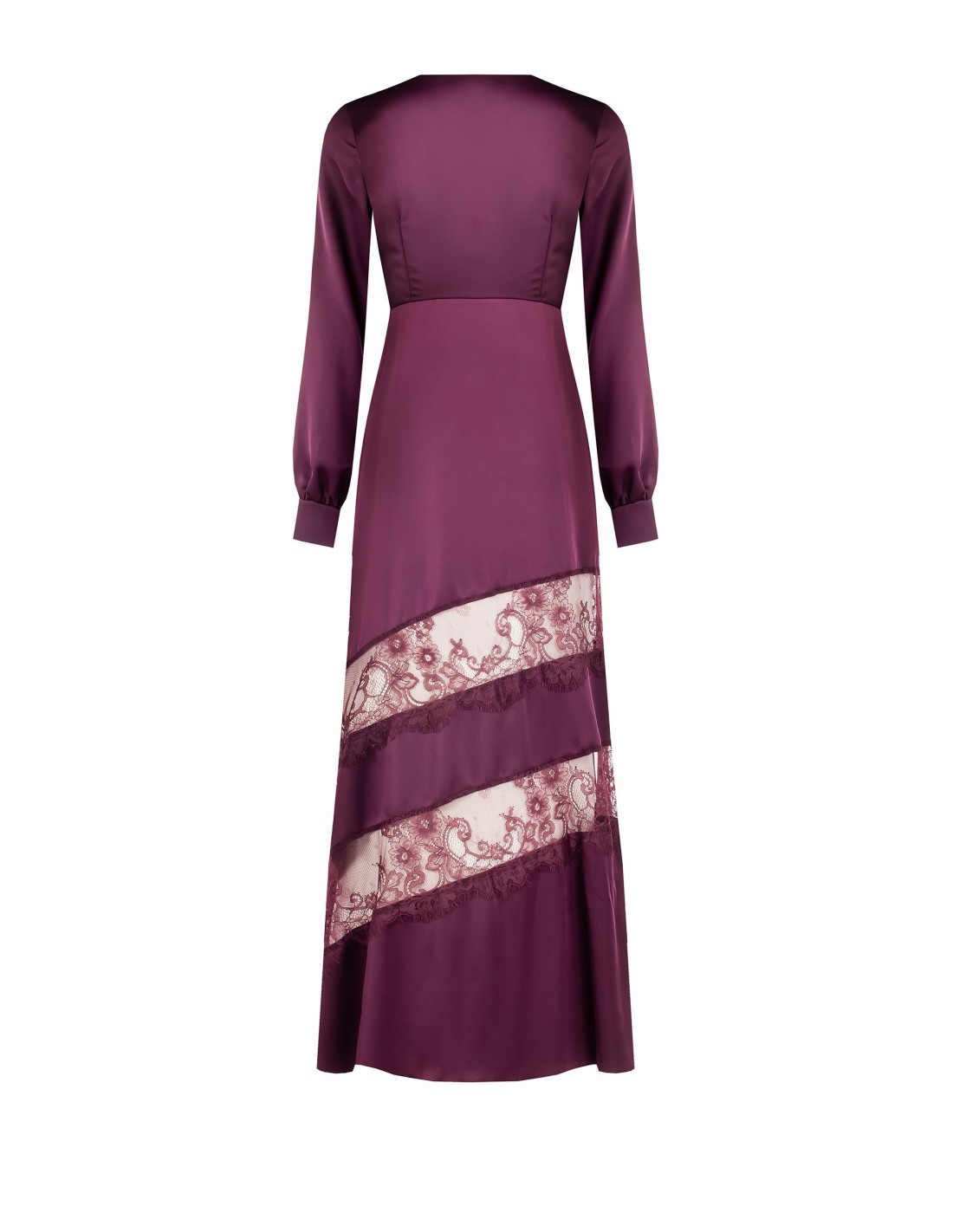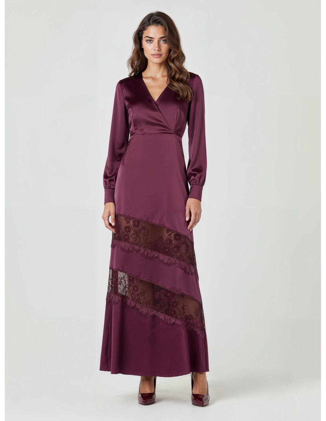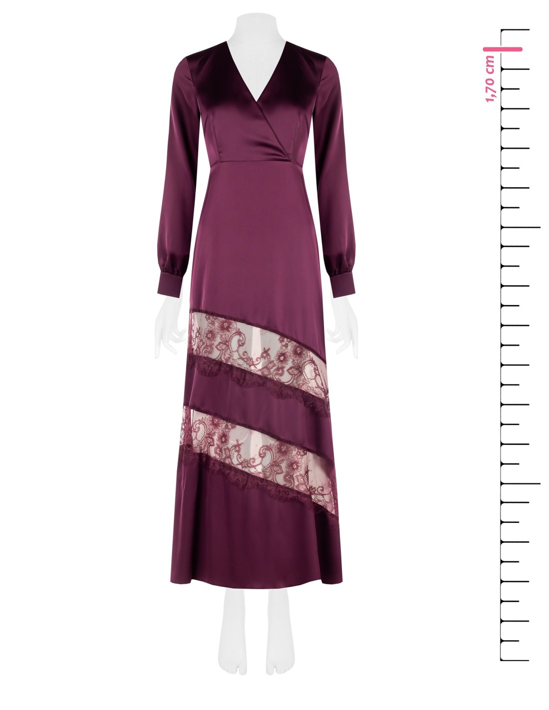 Rinascimento apresenta um modelo longo com corte evasé e cintura marcada, que afina a silhueta. Cetim fluido com aplicações em renda e tule em diagonal, decote cruzado em V e mangas com punho. Macio na pele, acompanha os movimentos. Perfeito para cerimónias, cocktails e jantares especiais.